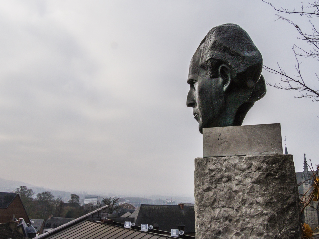 Difficile d’imaginer qu’ici s’élevait le château des comtes de Hainaut, parmi les plus puissants seigneurs de l’époque. Il ne reste quasi rien de ce château-fort. Laissé à l’abandon au début de l’époque bourguignonne, les Montois se servirent de ses pierres comme d’une carrière. Ne reste que des caves, la chapelle Saint-Calixte et la tour César. Peut-être est-ce pour ça que la statue de la tête de Charles Plisnier semble un peu triste. Regardant les toits de Mons, il se demande peut-être lesquelles de ces maisons portent les pierres du château disparu ?