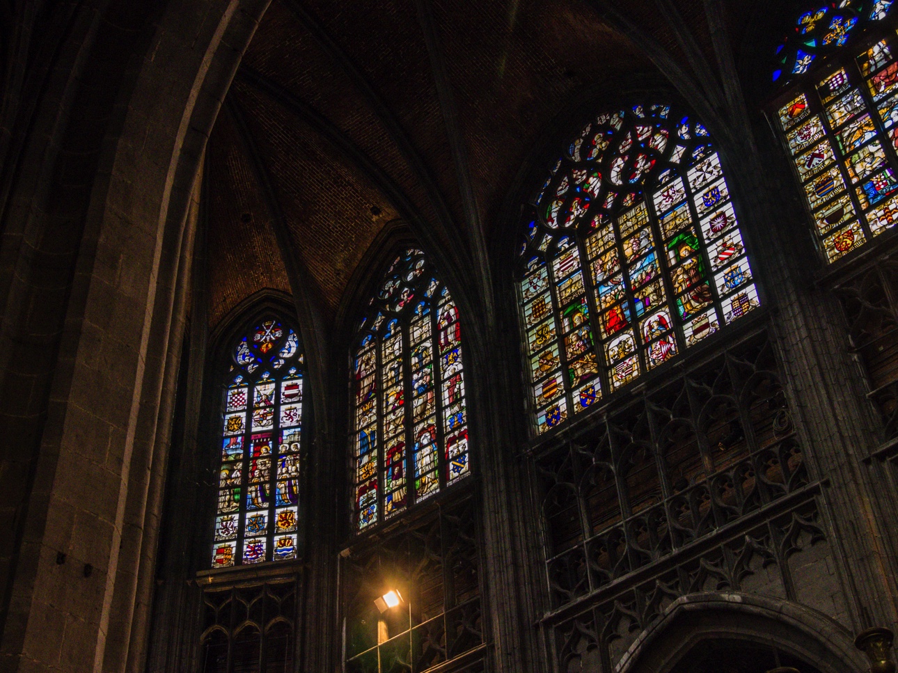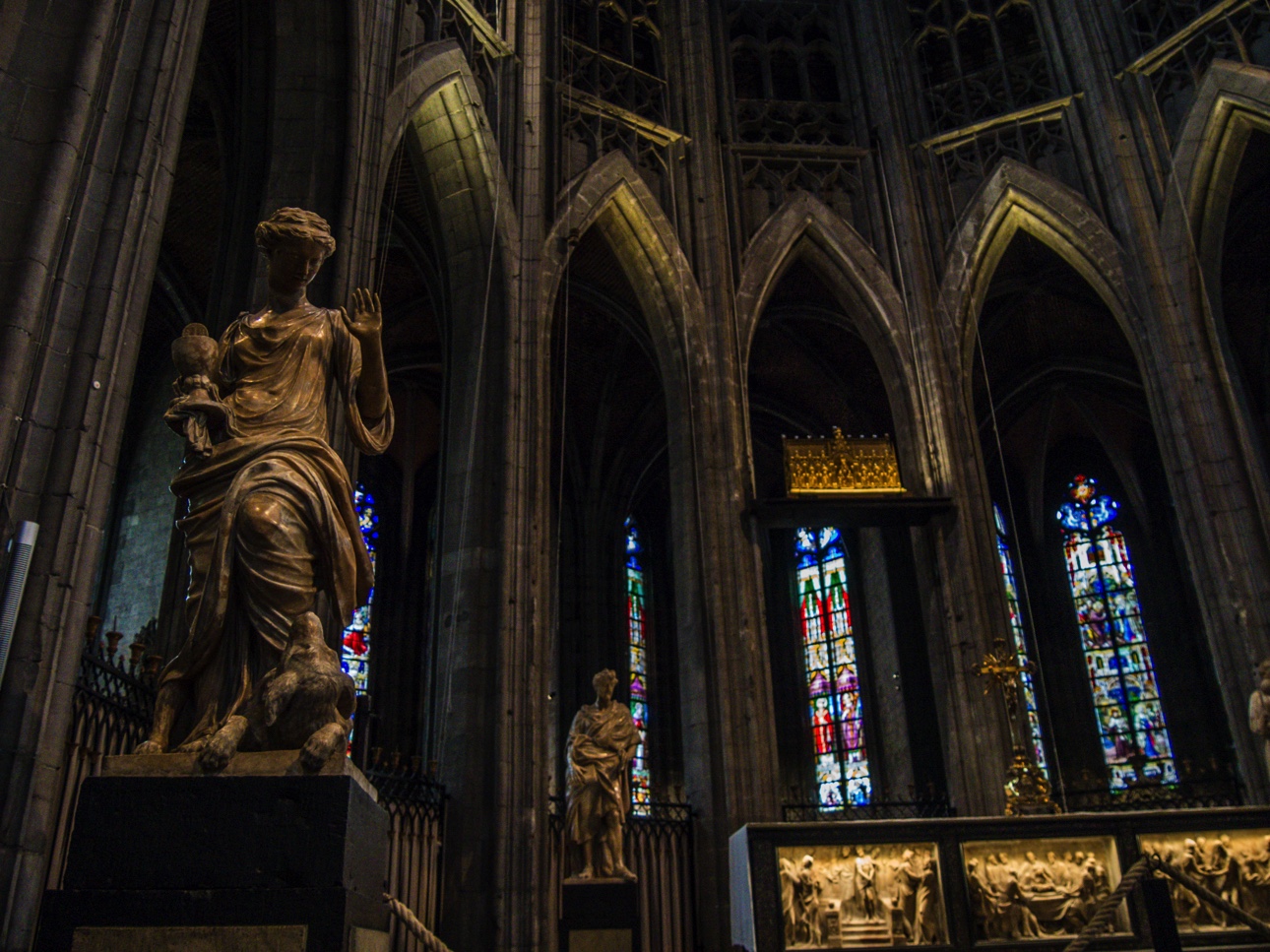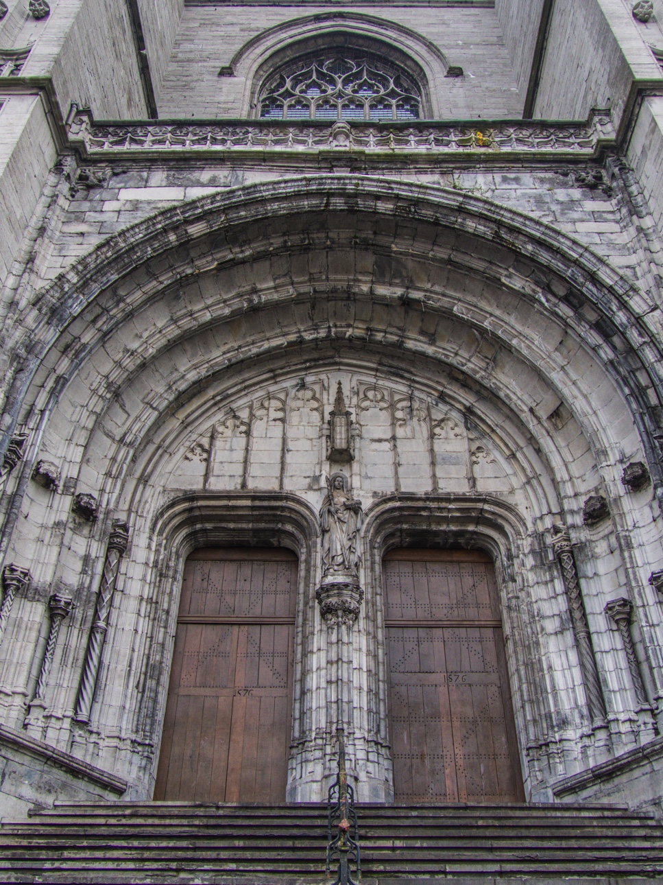 La collégiale est un solide édifice en pierre bleue (LA pierre de la région, on la retrouve partout, c’est un signe extérieur de richesse). De style gothique brabançon, et donc massive, tout comme l’hôtel de ville, elle n’a jamais été finie. La collégiale devait comporter un haut clocher mais il ne sera jamais construit pendant les 241 ans que durèrent les travaux. Dès qu’on s’approche de la collégiale, on remarque une chose : toutes les niches extérieures sont vides. Elles comportaient des statues qui ont toutes été détruites par les révolutionnaires français. D’ailleurs, la collégiale a bien failli être tout simplement rasée ! Mais avant d’être rendue au culte, elle servit d’écurie. Une écurie de luxe, on peut le dire !