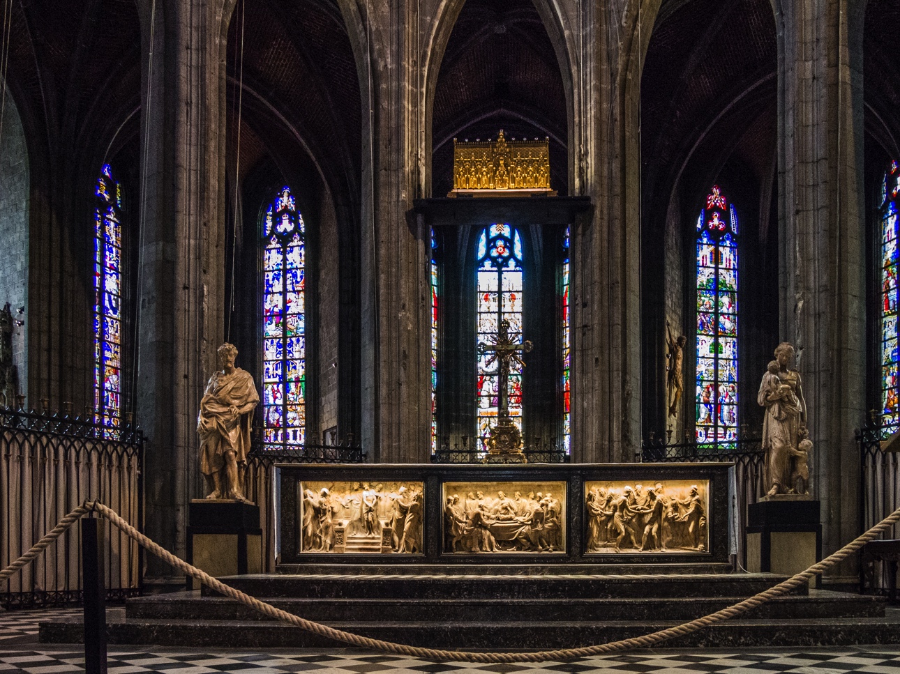 L’intérieur de la collégiale est assez sobre, voire même un peu austère, si ce n’était les statues de Jacques Du Broeucq. Sculptée dans l’albâtre, elles faisaient à l’origine partie d’un jubé en marbre noir. Rescapées de la Révolution française, elles sont maintenant placées près du chœur. Les vitraux, dont certains datent du début de la construction au XVIe siècle, sont aussi de toute beauté.