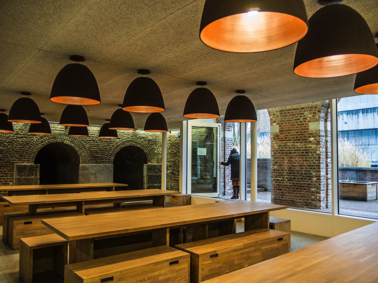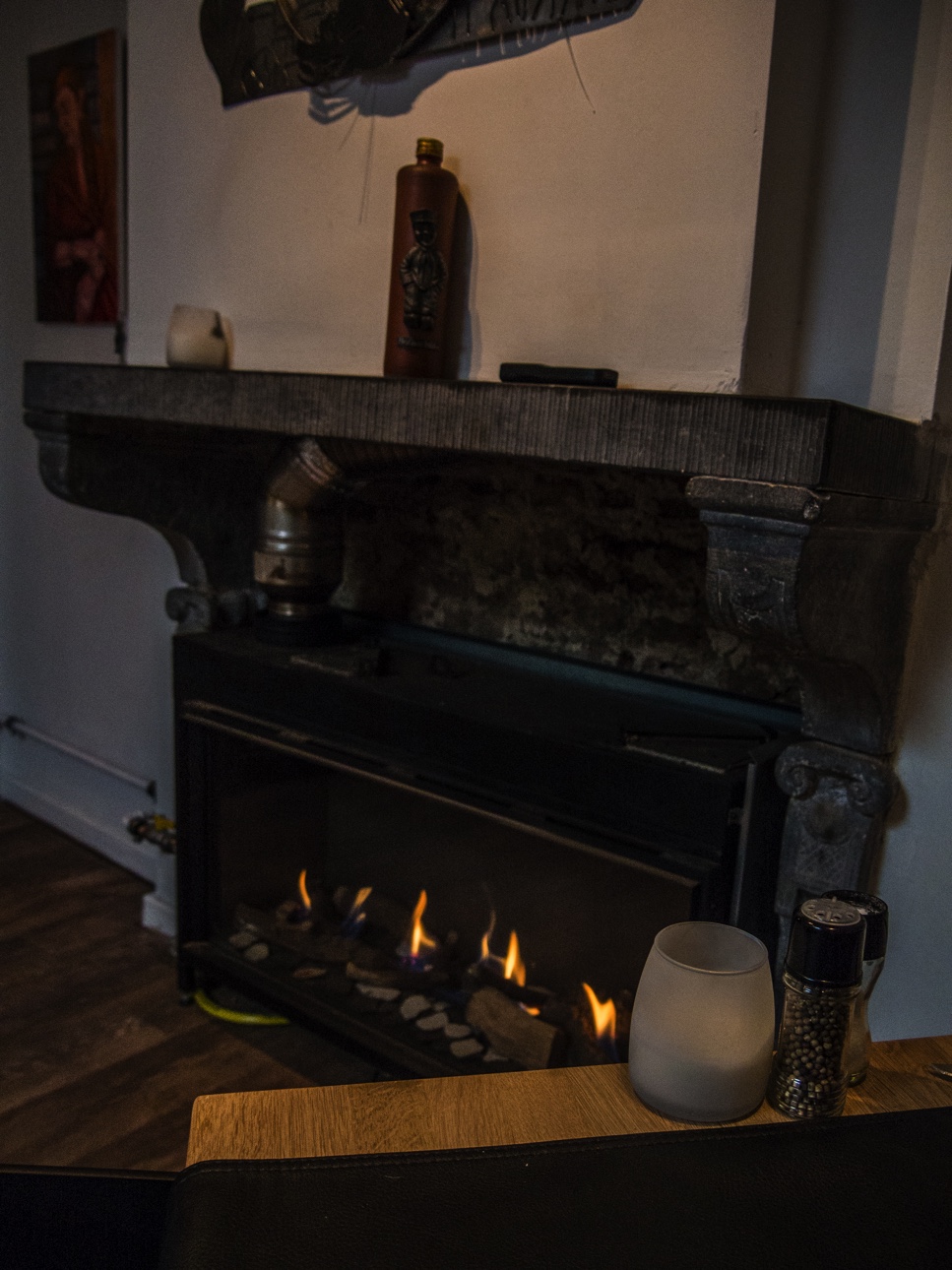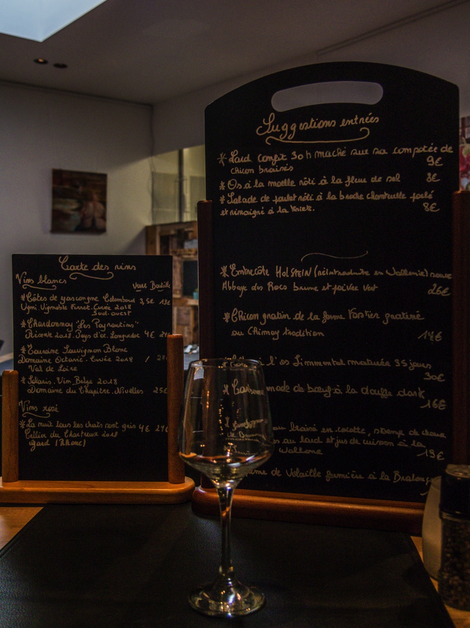 Situé en bas de la rue des Fripiers, le lieu est vraiment accueillant : à l’entrée, des fauteuils autour d’une table pour l’apéritif, beaucoup de bois, une cheminée pour le côté cosy (particulièrement bienvenue en la journée glaciale où je me suis rendue) et une sympathique chef, Loïc Deroubaix, qui a pris le temps de m’expliquer le concept du restaurant qui repose sur l’approvisionnement en circuit court, le plus possible.