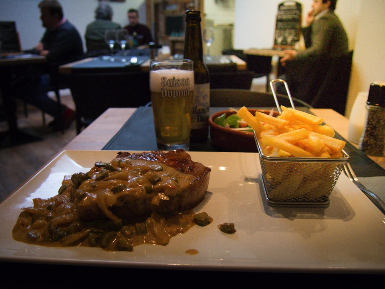A la carte, des plats typiquement wallons comme le chicon au gratin, les boulettes sauce tomate ou encore, le pinacle de la gastronomie montoise : la côte de porc al berdouille. Al quoi ??? La sauce al berdouille est une sauce à base de moutarde, cuite avec des échalotes, du bouillon de boeuf, du vin blanc, du vinaigre ET des cornichons au vinaigre en petits morceaux. Cette sauce brune avec les morceaux de cornichons ressemble à de la « berdouille », c’est à dire de la boue avec ses morceaux de terre dedans. Et je vous jure que c’est délicieux ! Comment je le sais ? Parce que c’est ce que j’ai commandé. Bien qu’originaire de la région, je n’en n’avais jamais mangé ! Une fois ma commande effectuée, Loïc me montre la pièce qu’il va cuire pour moi. Elle est tout simplement énorme !!! Je me dis que c’est pas possible, ça va réduire à la cuisson. Lorsque ma côte à l’os arrive nappée de sa sauce avec ses frites et sa salade, ma mâchoire manque de se décrocher. Réduite ? A peine ! J’empoigne mes couverts et me lance à l’assaut. Je me régale vraiment ! La viande, lardée, est un véritable régal ? Le goût de la viande est particulièrement bien mise en valeur parle côté un peu acide de la sauce. Bref, j’ai vraiment fait bombance. Tellement qu’il n’y avait aucune place pour un dessert. Alors si vous cherchez une adresse conviviale, avec des produits de qualité à un prix raisonnable, vous avez trouvé !
