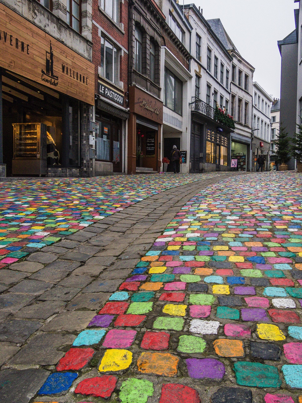La rue des Fripiers, j’en avais parlé lors de ma dernière journée passée avec Visit Hainaut. Née de l’envie des commerçants de donner un coup de fouet à un centre-ville économiquement sinistré (la faute à un centre commercial ouvert juste à la sortie de la ville), cette initiative a vu les riverains, bénévoles et passants peindre chaques petits pavés de couleurs vives, créant un serpent multicolore qui monte graduellement. Couplez à cela des très chouettes commerces (design, vintage, restaurants…) plus que sympas et vous aurez compris pourquoi je dis que cette voirie est cool !