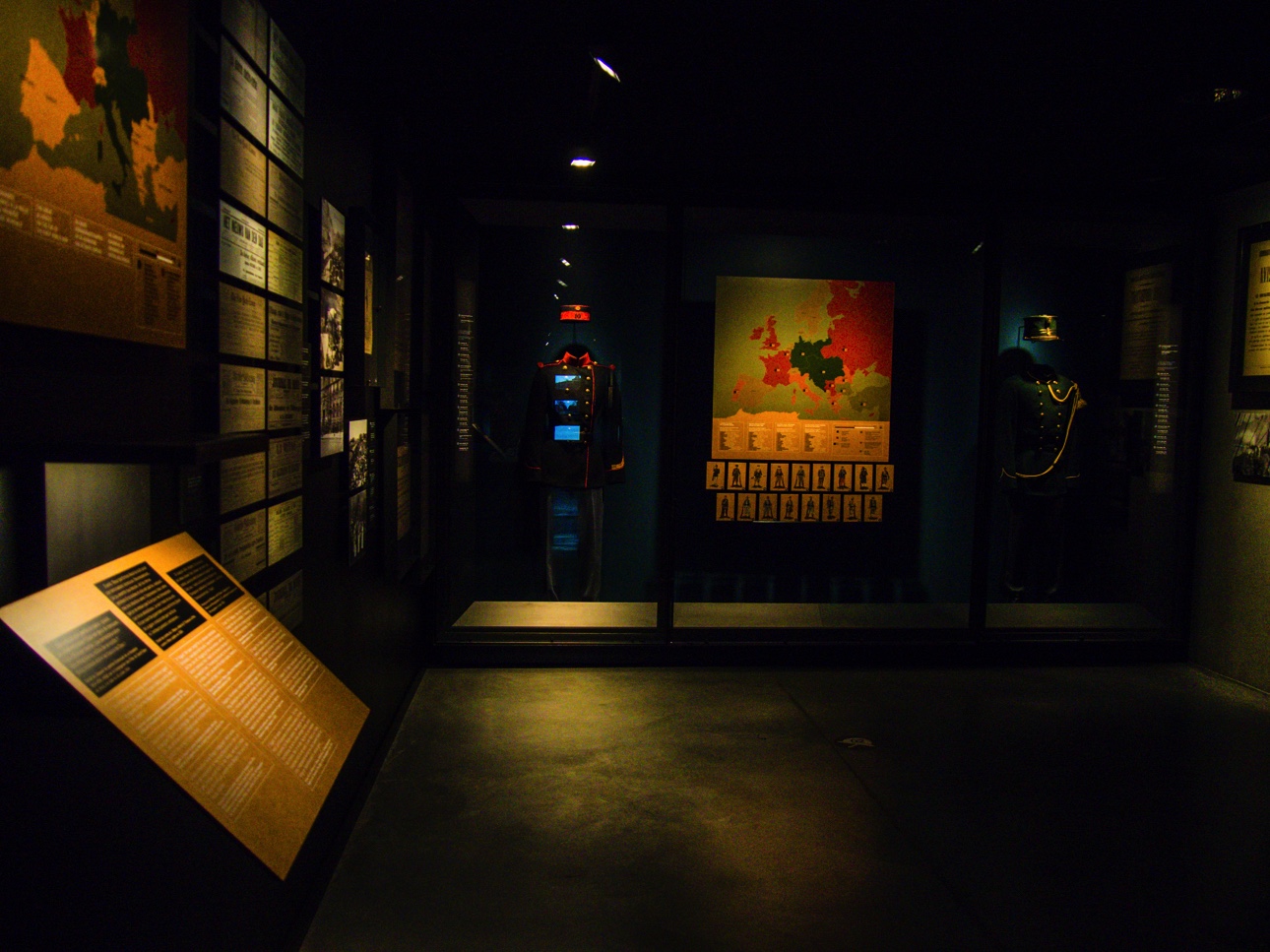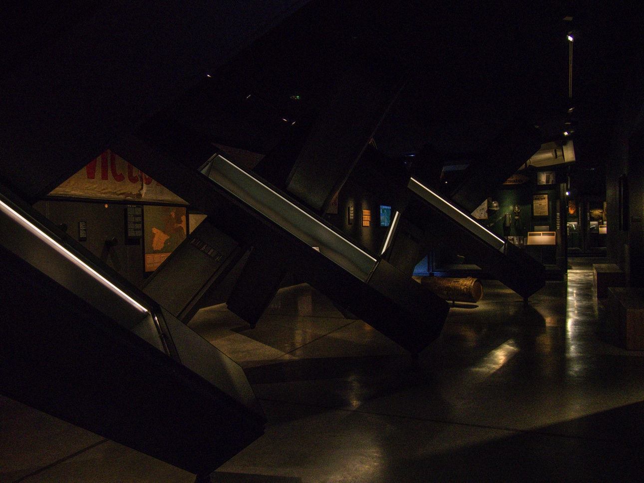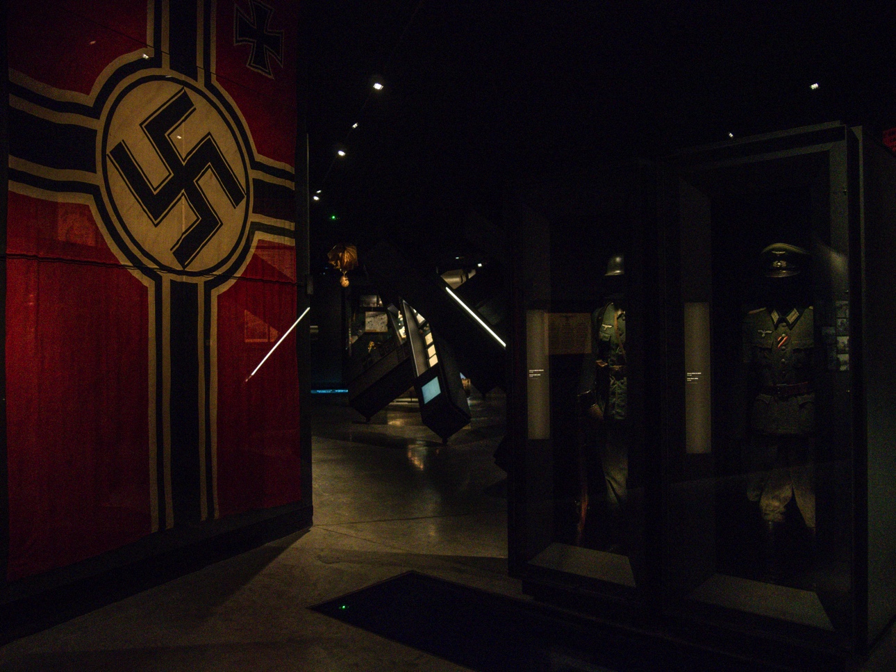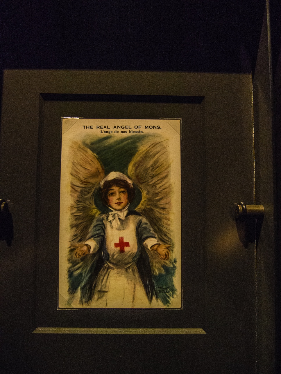 Avant même d’entrer, on sait où on se trouve : un char américain trône juste devant. Le lieu en lui-même est plutôt intéressant puisqu’il s’agit du bâtiment de l’ancienne machine à eau, un souvenir de l’industrialisation du XIXème siècle. La machine n’est plus là mais l’édifice a subsisté. A présent, ce musée joue un rôle essentiel de mémoire, d’autant plus qu’il ne reste plus que les personnes ayant vécu la deuxième guerre mondiale sont de moins en moins nombreuses. Le parcours commence avec une mise en place de la ville de Mons dans l’histoire et les conflits dont elle a fait partie, volontairement ou non. Après ce préambule, on entre dans le vif du sujet : la Première Guerre Mondiale. Si la Deuxième Guerre a fort affecté Mons et sa région, c’est surtout la Grande Guerre qui a marqué au fer rouge la ville. C’est ainsi que la plus grande part du musée y est consacrée. Outre des uniformes et objets d’époque, la scénographie utilise le son, les images… A l’avancée de l’armée allemande, on entre dans une salle ou résonne le bruit de bottes. Pour l’armée britannique, Mons est le lieu où la guerre commence et finit. C’est au cimetière de Saint-Symphorien que sont enterrés le premier et dernier soldat britannique tués pendant le conflit. C’est ici, lors de la bataille de Mons, que seraient apparu des Anges le 23 août 1914 à un corps expéditionnaire britannique en pleine retraite. Trop peu nombreux pour résister aux Allemands, les soldats auraient évoqué Saint-Georges, patron de l’Angleterre, auxquels auraient répondu des anges et les esprits des archers de la bataille d’Azincourt afin de les couvrir. Cette légende va se répandre comme une traînée de poudre et servir à la propagande alliée pour démontrer que Dieu était de leur côté. Une petite affiche rappelle que les « vrais anges de Mons », ce sont les infirmières !