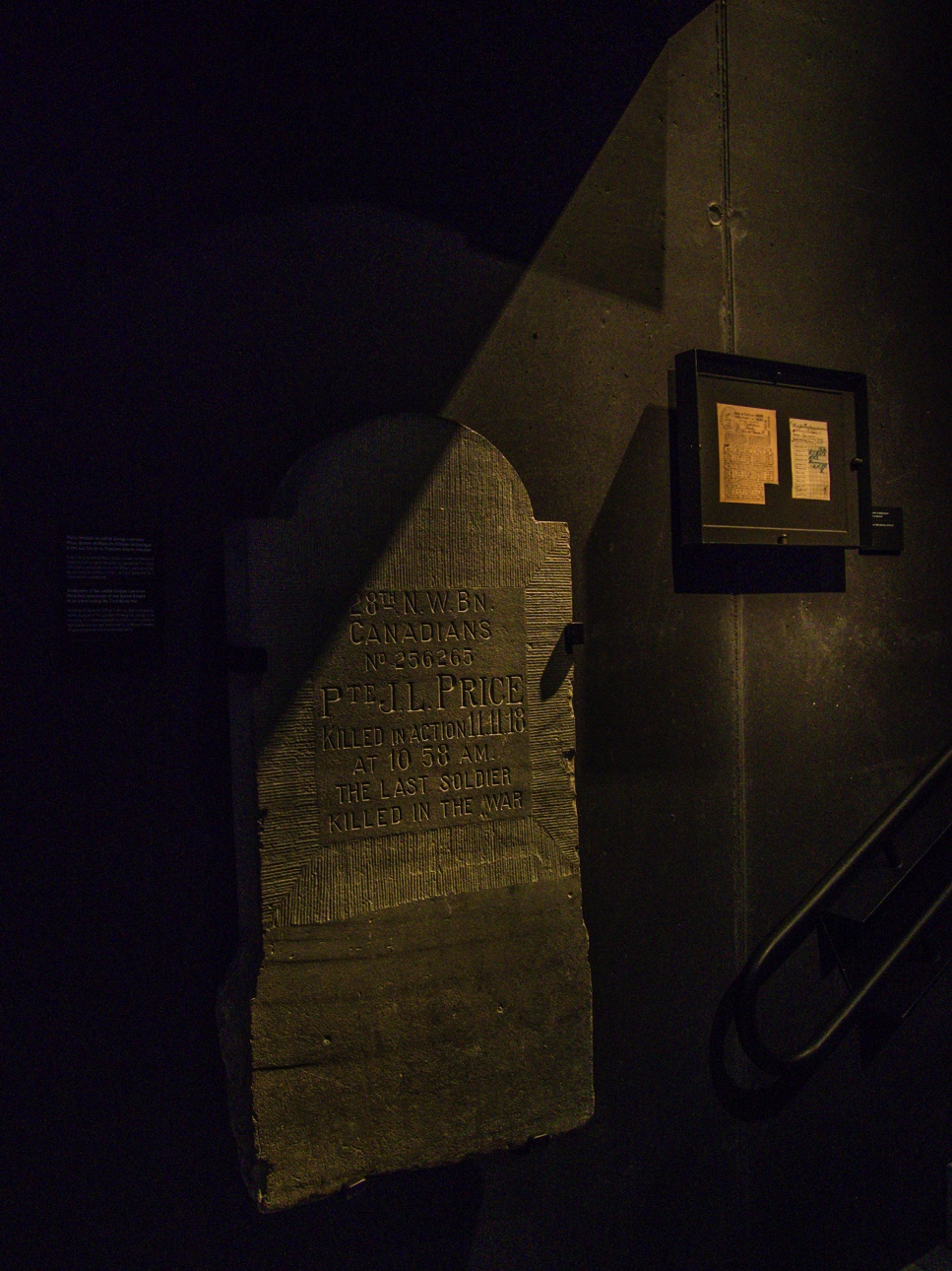 La vie dans la tranchée et assauts sont évoquées dans un superbe dessin animé en noir et blanc et via des écrans retraçant des témoignages poignants de ces jeunes soldats. La mort qui rôde, le froid et l’humidité des tranchées, le manque des proches… les tourments sont nombreux. Tout cela culmine avec la pierre tombale du dernier soldat à mourir lors de la guerre : George Lawrence Price, un soldat canadien tué le 11 novembre 1918 à 10h58. Deux minutes avant le cessez-feu de l’Armistice. D’abords enterré au cimetière d’Havré, juste en dehors de Mons, sa dépouille sera transférée au cimetière militaire de Saint-Symphorien. C’est cette première pierre tombale qui est exposée ici.