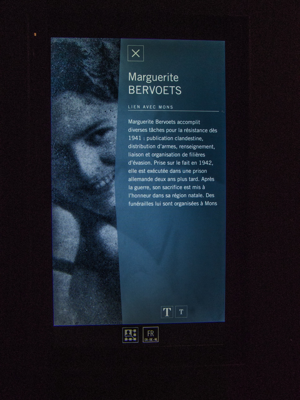 Ça devait être la « der’ des der’ », mais la guerre reviendra en Belgique 22 ans plus tard en 1940, encore plus violente que la précédente. Dans cette partie du musée, c’est plutôt l’expérience des civils qui est mise en évidence, particulièrement ceux qui étaient impliqués dans la résistance comme Marguerite Bervoets, qui sera emprisonnée à Mons avant d’être déportée et exécutée.