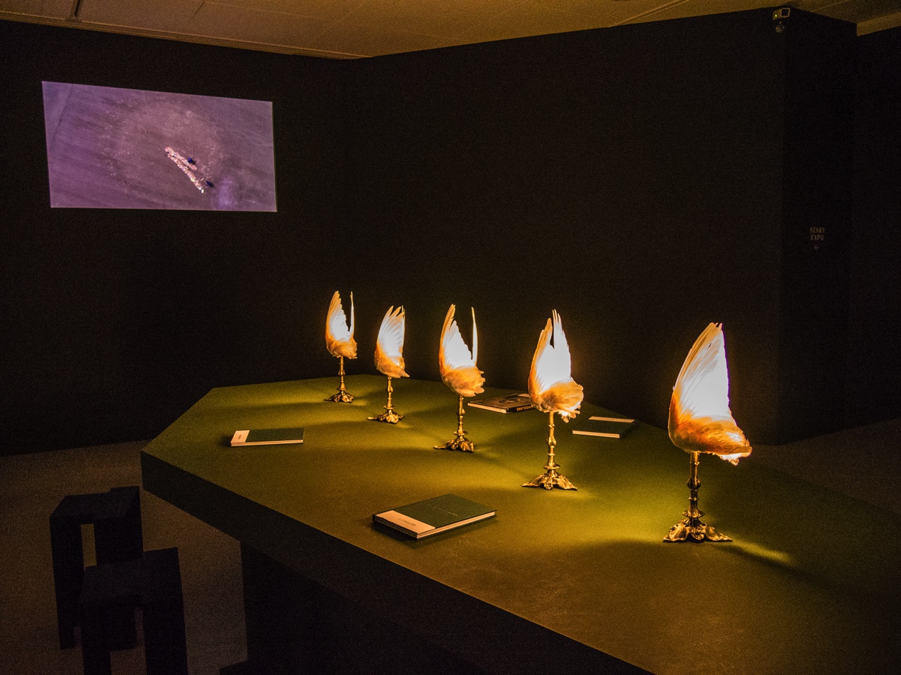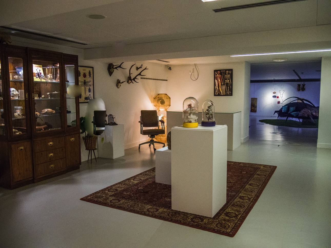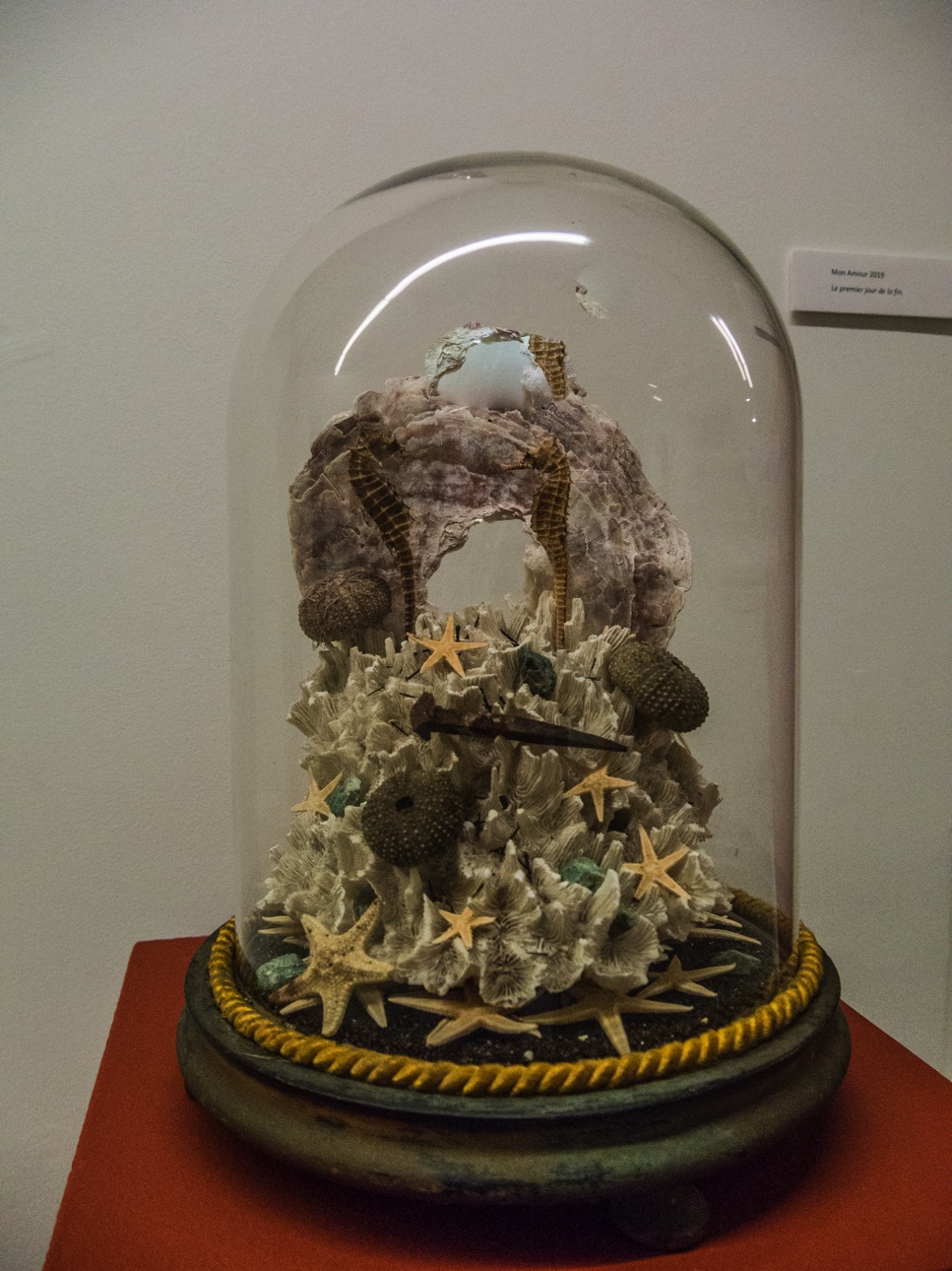 Au sous-sol, c’est une exposition un peu « trash » qui vous attend. C’est comme si on avait mis le trublion de la classe à la cave ! Anamor marque par l’utilisation abondante par Nicolas Failly, l’artiste, d’animaux taxidermisés. Collectionnés par l’artiste (la collection est son dada), ils sont mis en scène, souvent sous cloche, représentant de petites scénettes, ou semblables à des icônes. C’est à la fois beau, repoussant, perturbant et poétique. Par contre, si les animaux empaillés vous répugnent ou si vous visitez avec des enfants sensibles, ce n’est peut-être pas l’expo pour vous.