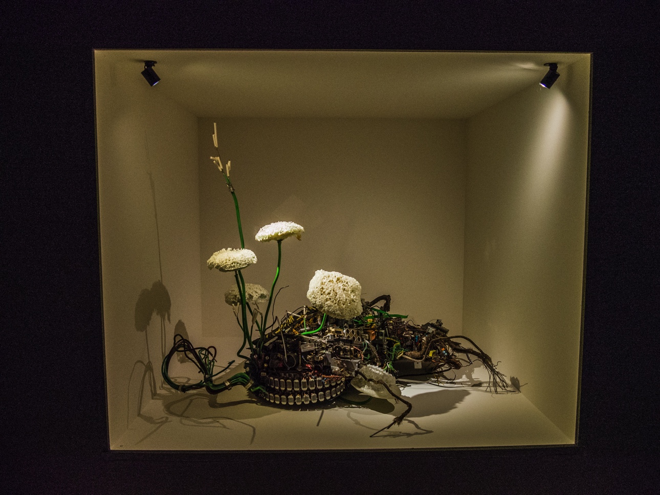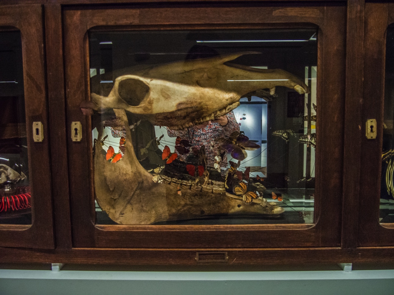 La pièce de résistance, c’est Memento Mons, une très belle exposition qui reprend le principe du cabinet de curiosités. Le cabinet de curiosité était très en vogue au XIXème et les collectionneurs aimaient à montrer leurs trouvailles, souvent précieuses et/ou rares combinant des « naturalia» (issues de la nature, du minéral à l’animal), des artefacts (oeuvres d’arts, bijoux, artisanat, outils scientifiques…) ou encore des objets venus d’ailleurs, les « exoticae ». Le tout étant agencé par le goût et le fil rouge personnel du collectionneur.