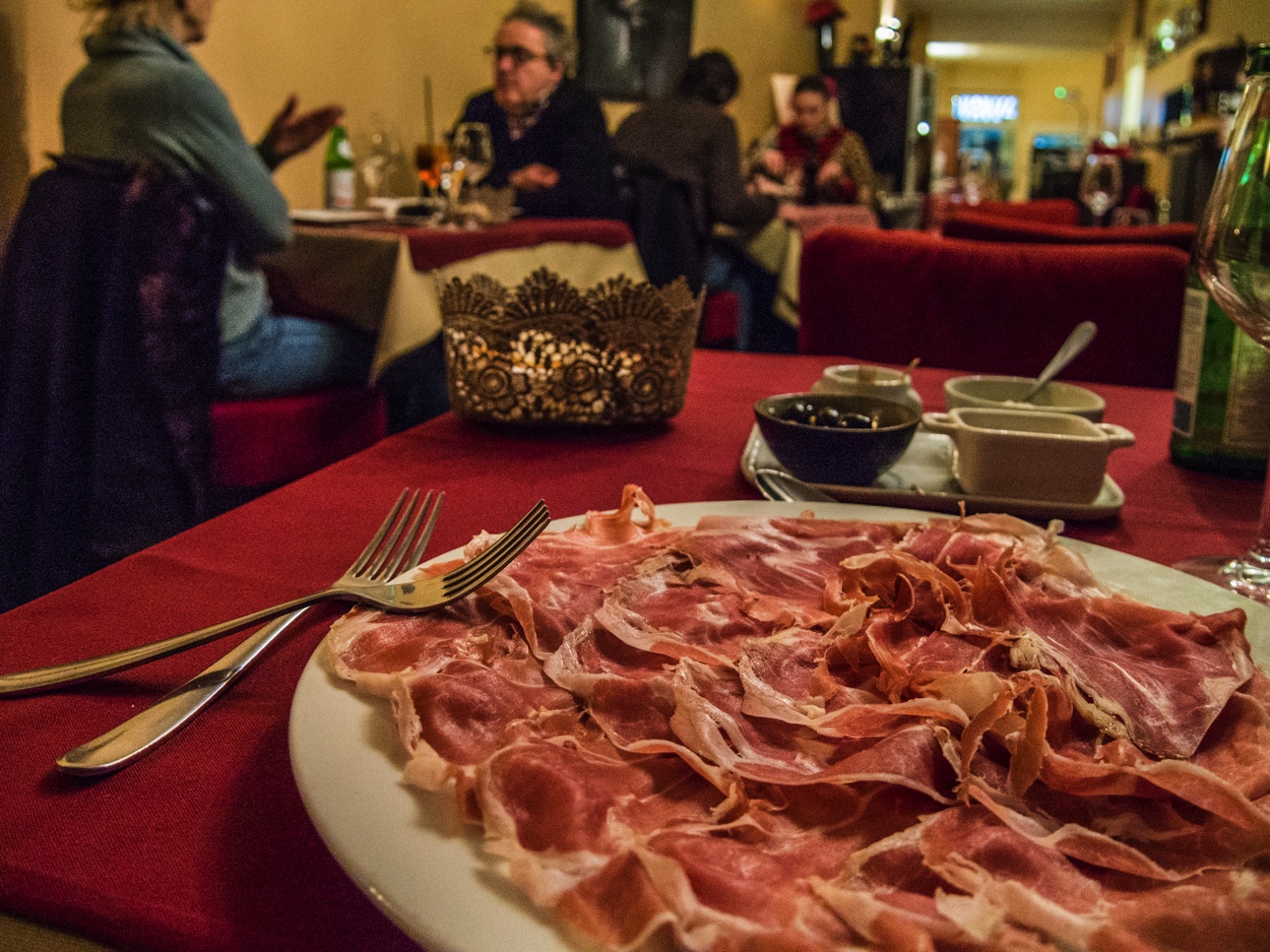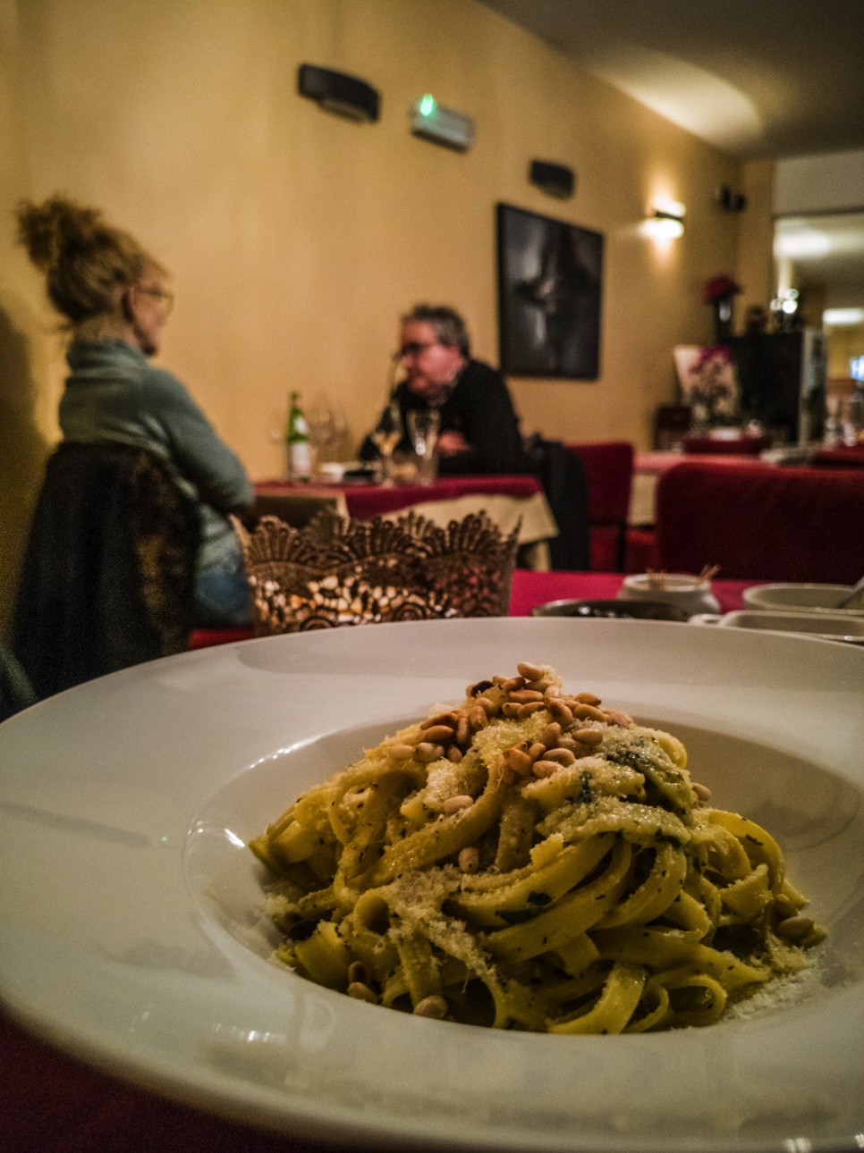 Mons et le Borinage sont terres d’immigration. Nombreux sont les travailleurs venus de loin pour faire tourner les charbonnages qui faisaient la richesse de la région et les plus nombreux furent les Italiens. Votre blogueuse est issue de cette migration. Et la gastronomie italienne est presque considérée comme locale après tant d’années. Il était donc logique d’aller manger dans ce restaurant qui se situe à deux pas de mon hôtel. Après mes balades dans les deux musées, l’appétit était revenu ! L’intérieur du restaurant signale que je vais manger comme à la maison. Ce côté familial sera renforcé par l’accueil vraiment adorable. Je sens que la cuisine sera du marché et je ne me trompe pas ! Allez, comme je n’ai pas eu assez de mon quota de cochonnaille pour la journée, j’opte pour du prosciutto en antipasto. Je m’attendais à trouver quelques tranches de Parme avec un morceau de melon… simple et efficace ! Mais non, c’est une énorme assiette qui arrive devant moi. Je crois qu’une petite queue en tire-bouchon risque de me pousser dans le bas du dos pendant la nuit. Sans surprise, ma gourmandise me fera finir l’assiette. Sagement, je décide en guise plat principal de me rabattre sur les pâtes. Ce sera donc des tagliatelle fraîches aux oeuf, sauce al pesto. Elle sont servies dans les règles de l’art avec ses pignons de pin grillées. Ça y est, je me sens retournée au pays des ancêtres !