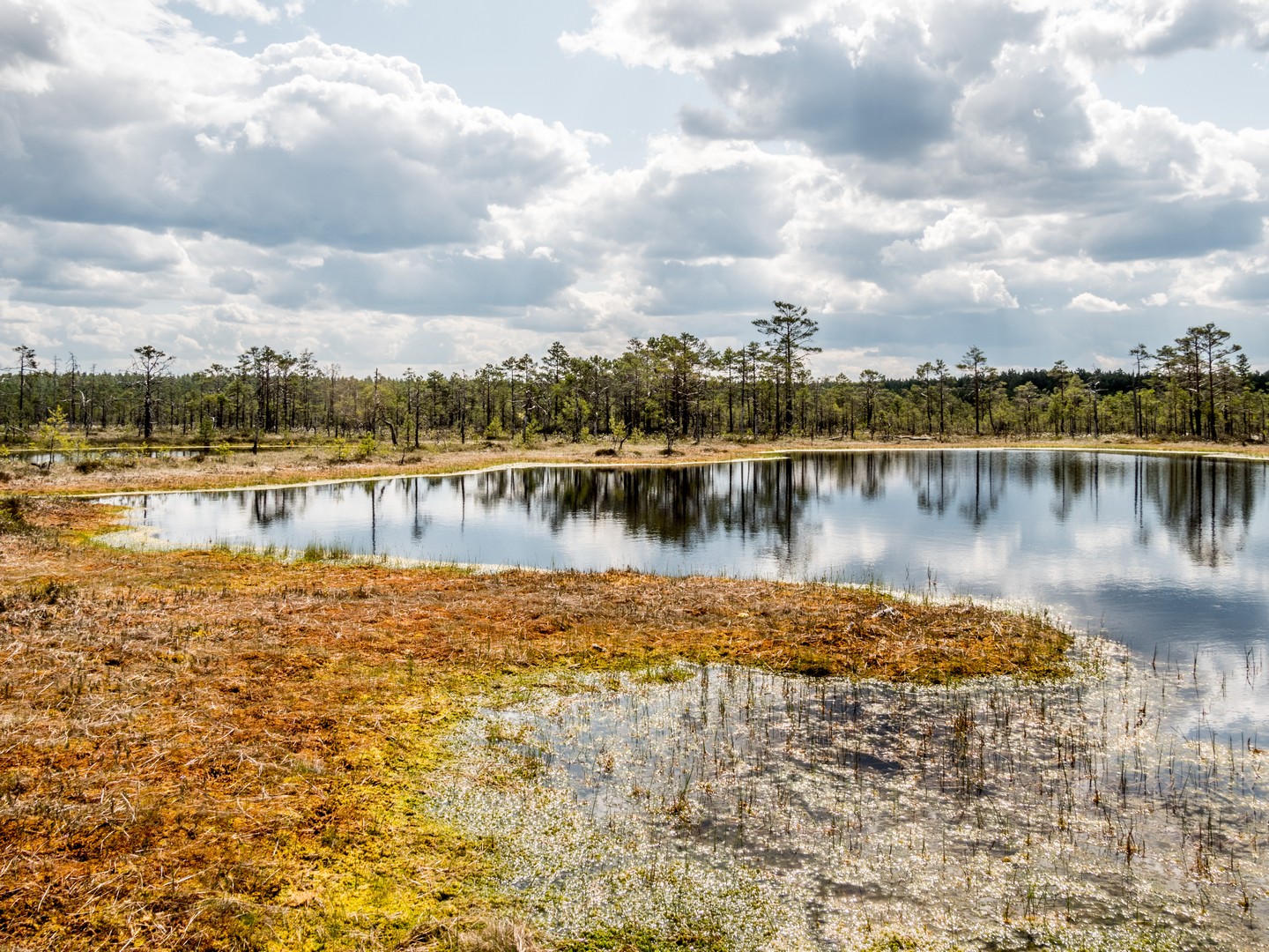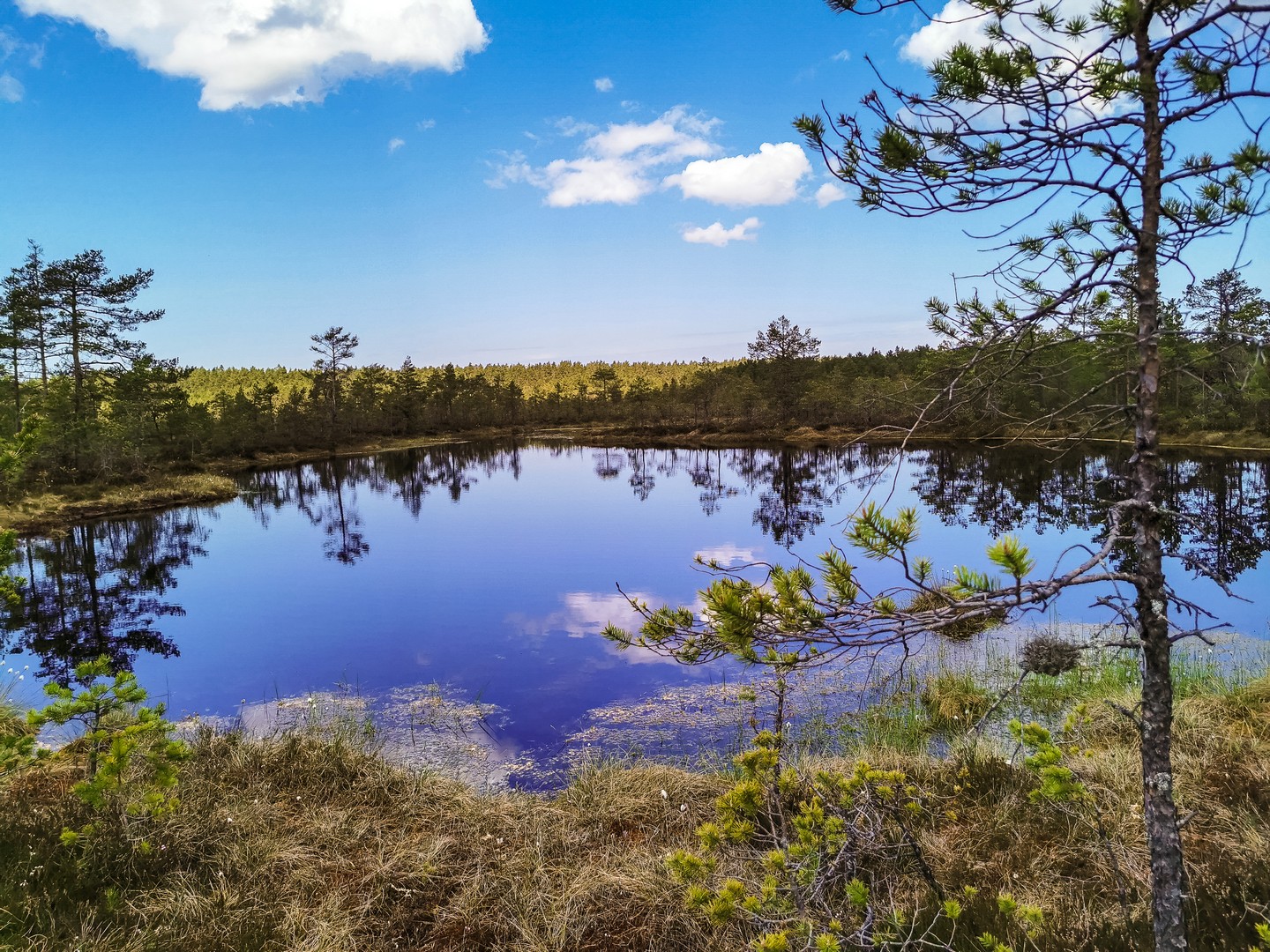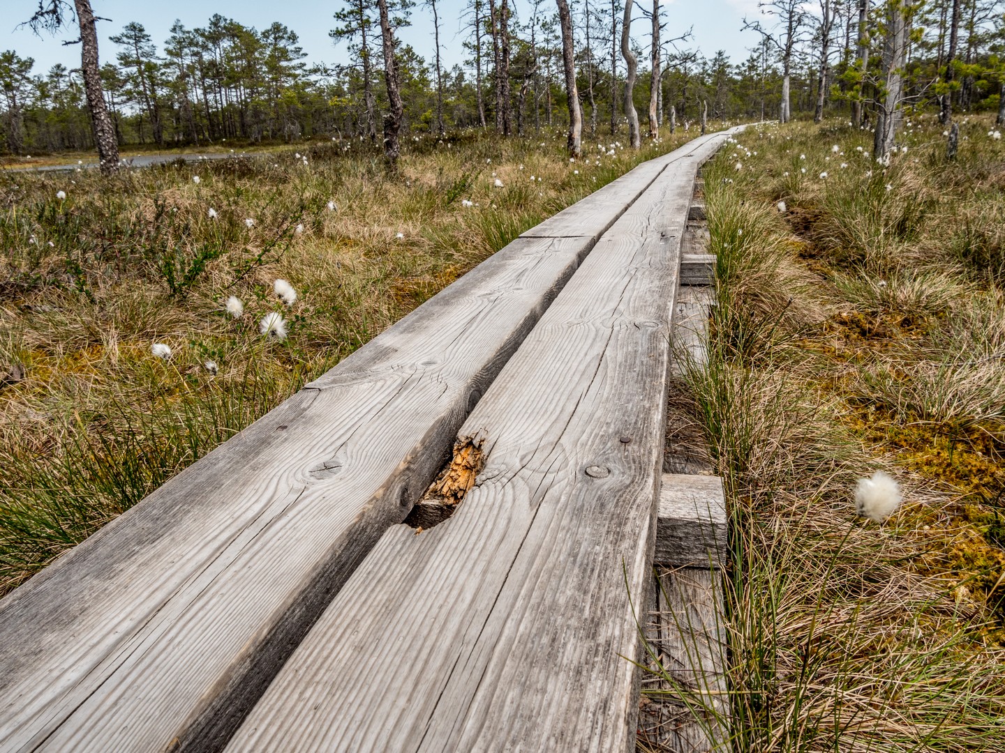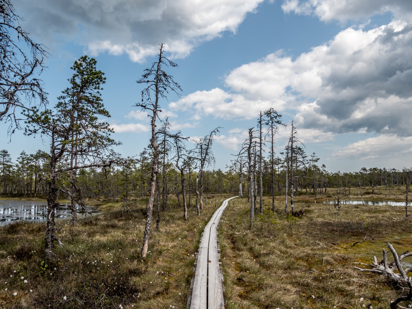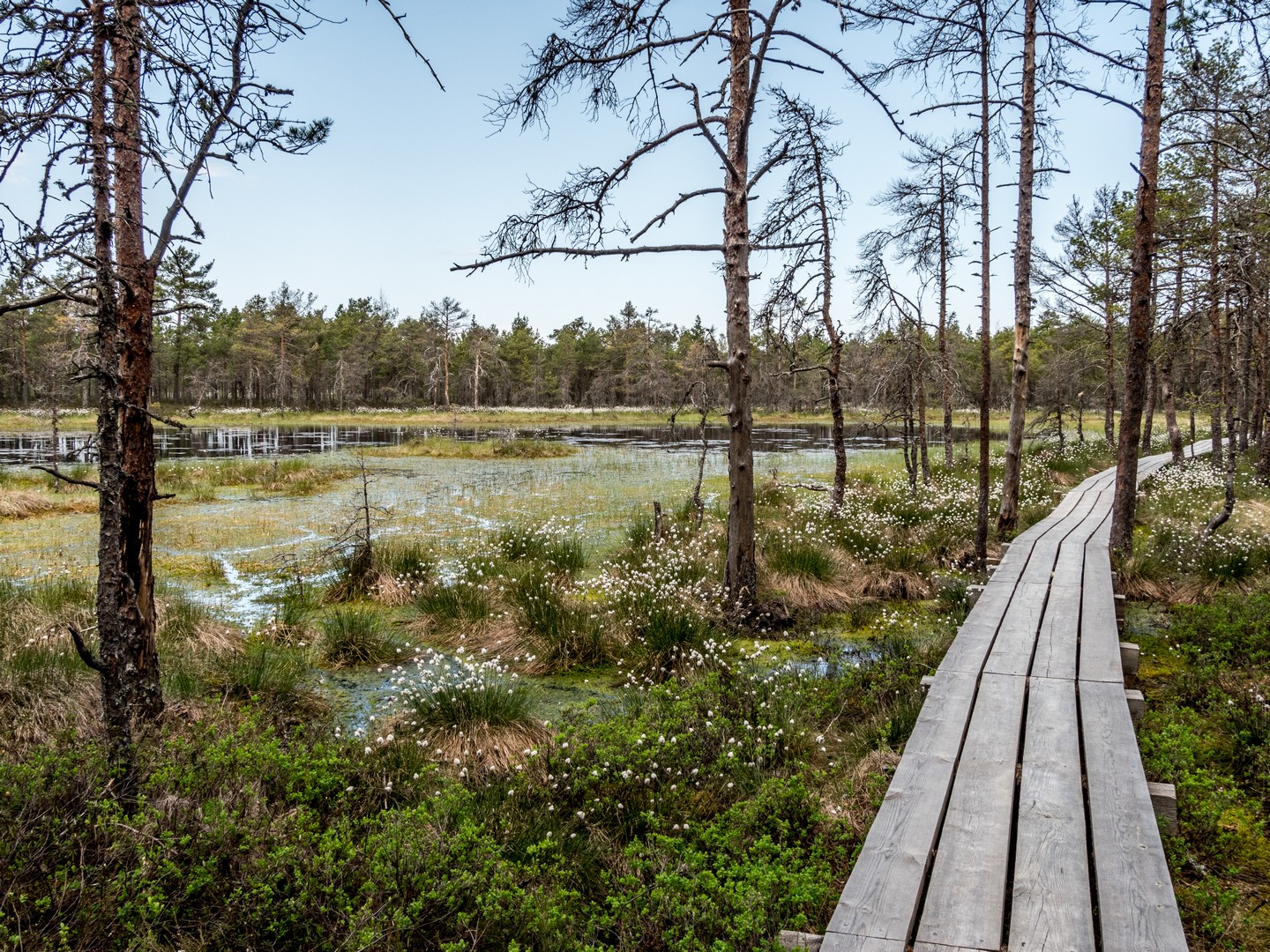 Enfin, après une petite demi-heure, l’horizon s’ouvre : me voilà arrivée au sentier de caillebotis qui traverse la grande tourbière de Viru. Me voilà dans un autre monde, suspendue entre l’eau et le ciel. Dans l’eau tranquille des marais, l’azur et les nuages s’y reflètent comme dans un miroir et en décuplent la lumière. Une lumière qui a une étrange teinte un peu jaune et chaude. J’ai l’impression d’être sur une autre planète ! Une autre planète, mais pleine de vie. Même si l’environnement n’est pas idéal pour la pousse des arbres, des plantes rares comme l’andromède (qui ressemble un peu à du muguet légèrement rose) ou plus communes, comme l’oseille des marais ou la linaigrette (qui semble supporter des boules de coton), s’y trouvent.