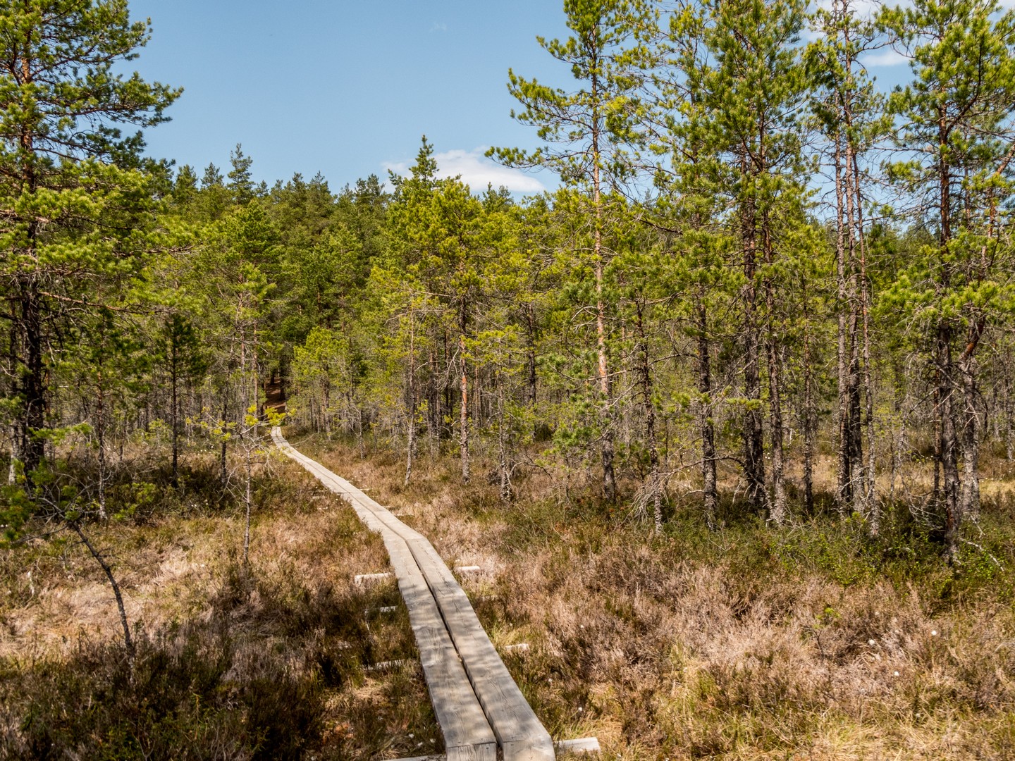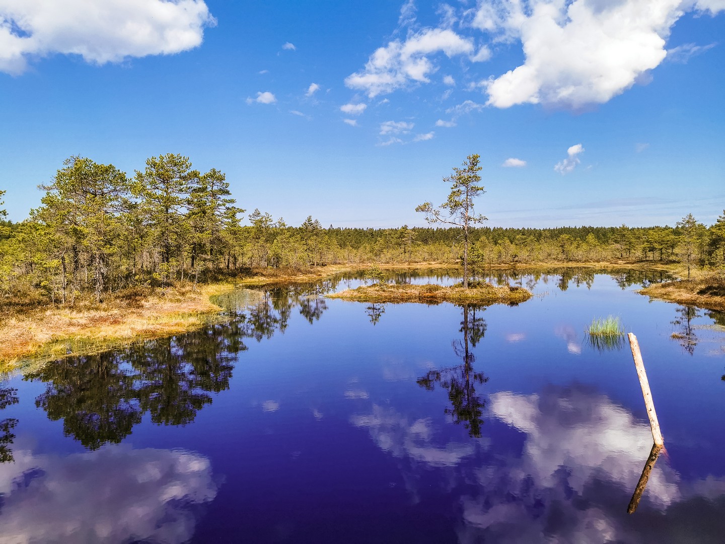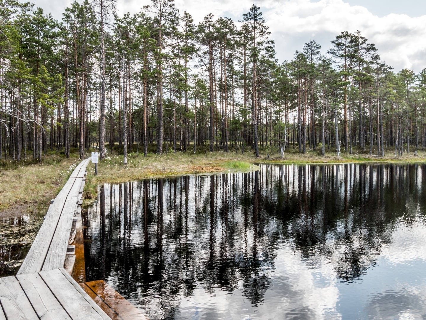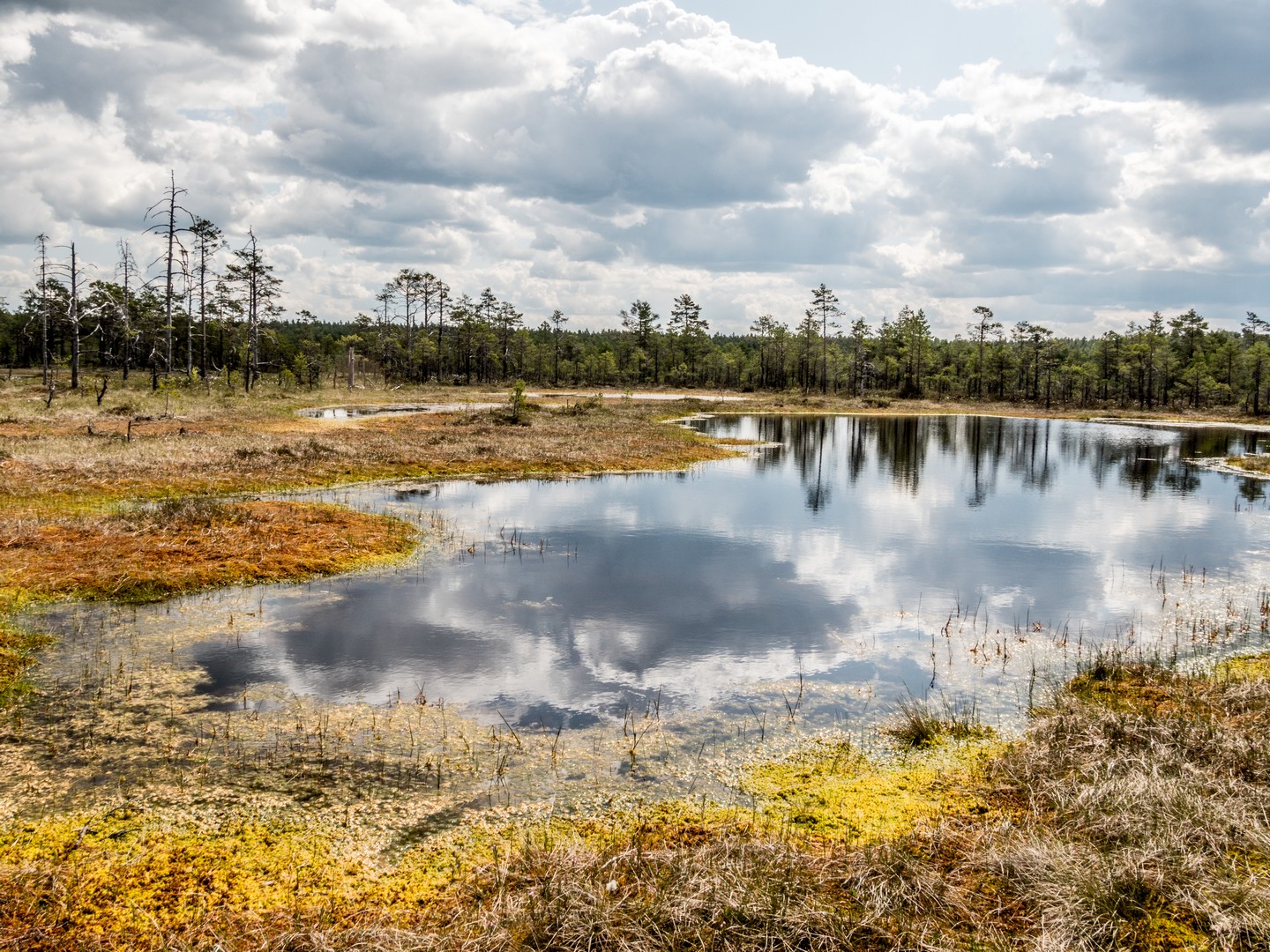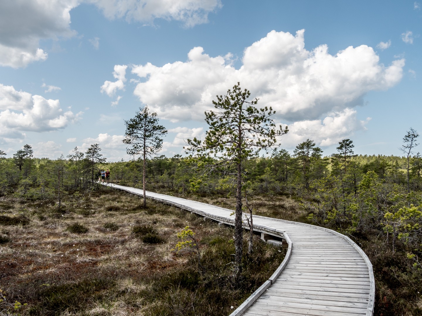 Enfin, après une petite demi-heure, l’horizon s’ouvre : me voilà arrivée au sentier de caillebotis qui traverse la grande tourbière de Viru. Me voilà dans un autre monde, suspendue entre l’eau et le ciel. Dans l’eau tranquille des marais, l’azur et les nuages s’y reflètent comme dans un miroir et en décuplent la lumière. Une lumière qui a une étrange teinte un peu jaune et chaude. J’ai l’impression d’être sur une autre planète ! Une autre planète, mais pleine de vie. Même si l’environnement n’est pas idéal pour la pousse des arbres, des plantes rares comme l’andromède (qui ressemble un peu à du muguet légèrement rose) ou plus communes, comme l’oseille des marais ou la linaigrette (qui semble supporter des boules de coton), s’y trouvent.
