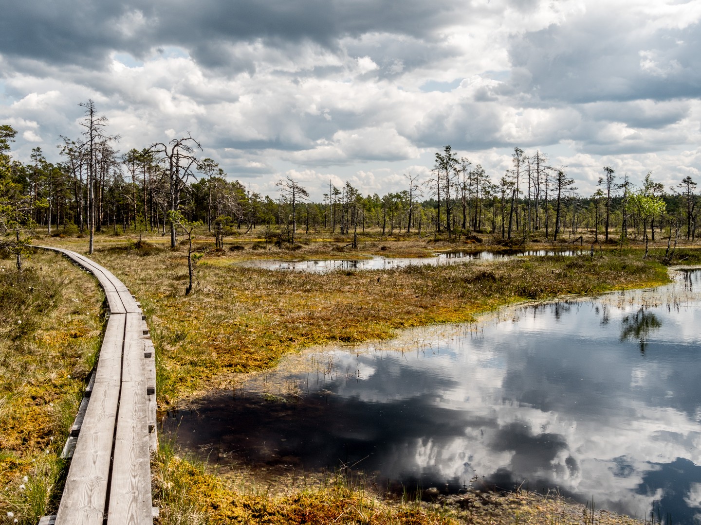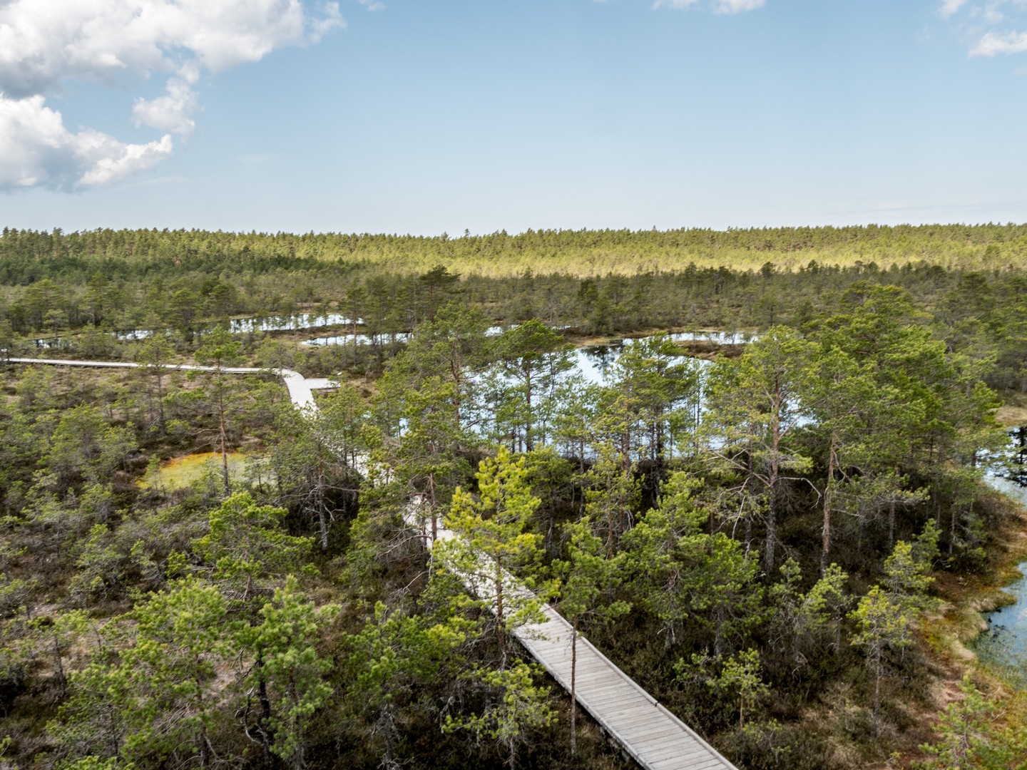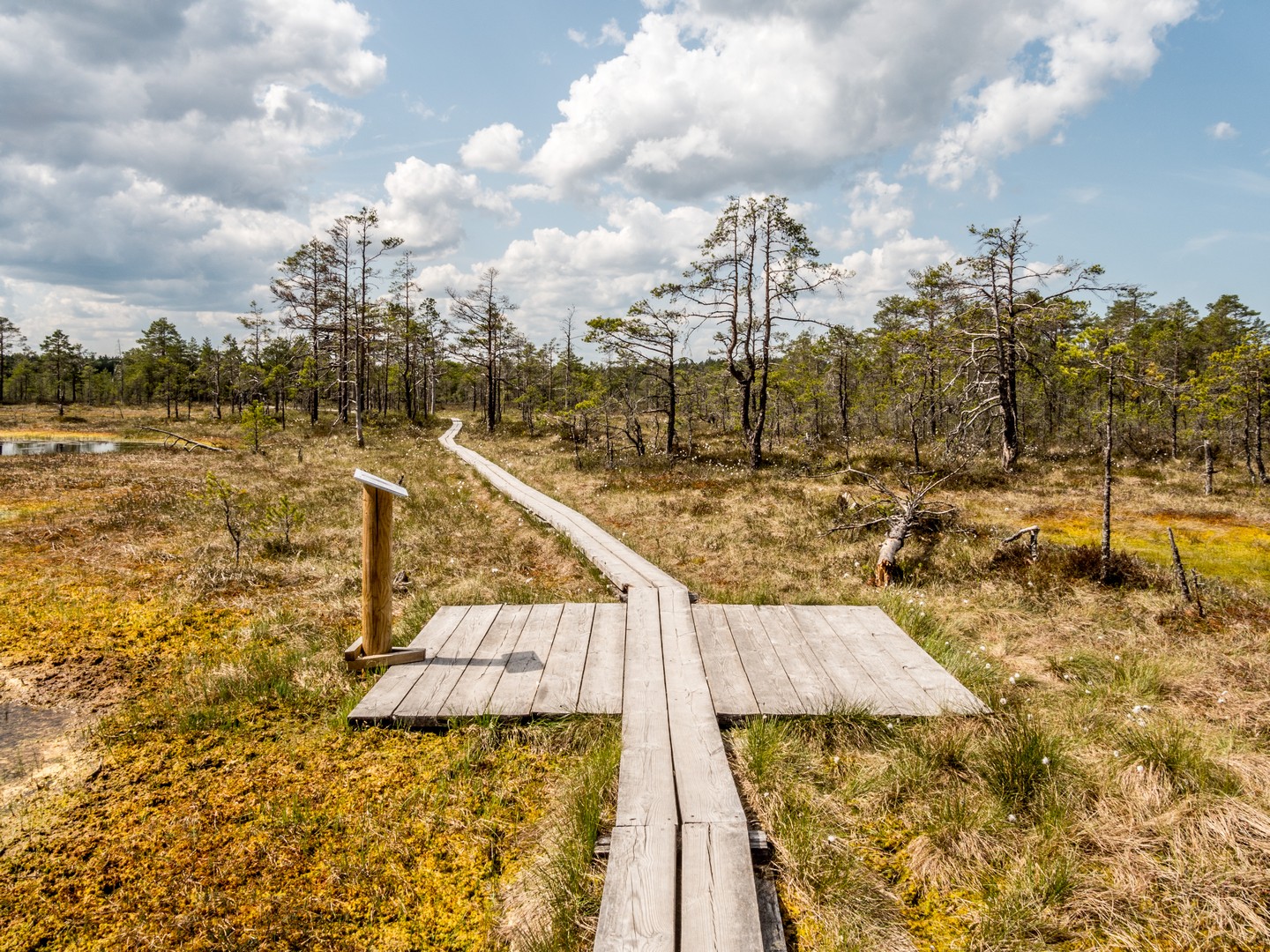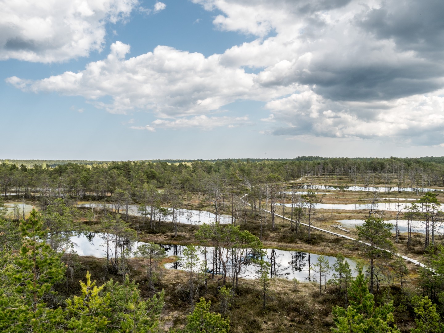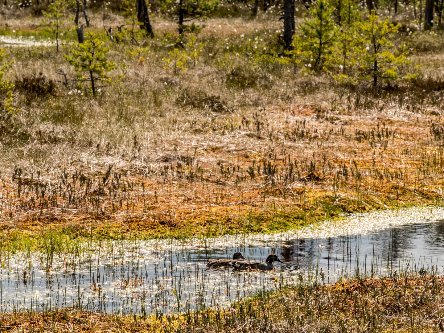 Enfin, après une petite demi-heure, l’horizon s’ouvre : me voilà arrivée au sentier de caillebotis qui traverse la grande tourbière de Viru. Me voilà dans un autre monde, suspendue entre l’eau et le ciel. Dans l’eau tranquille des marais, l’azur et les nuages s’y reflètent comme dans un miroir et en décuplent la lumière. Une lumière qui a une étrange teinte un peu jaune et chaude. J’ai l’impression d’être sur une autre planète ! Une autre planète, mais pleine de vie. Même si l’environnement n’est pas idéal pour la pousse des arbres, des plantes rares comme l’andromède (qui ressemble un peu à du muguet légèrement rose) ou plus communes, comme l’oseille des marais ou la linaigrette (qui semble supporter des boules de coton), s’y trouvent.