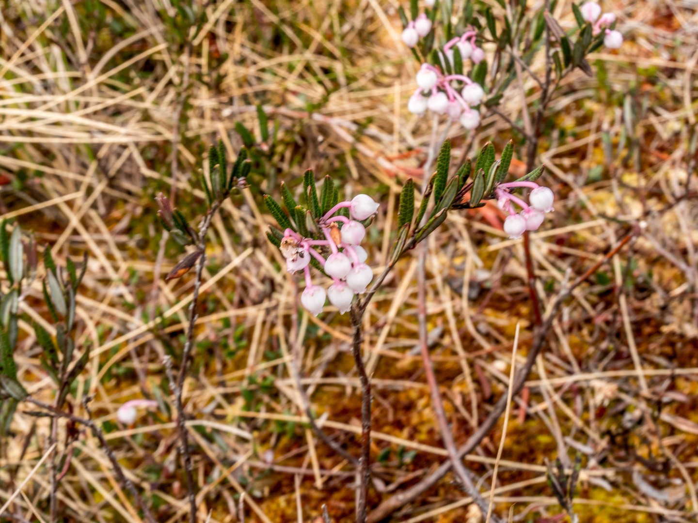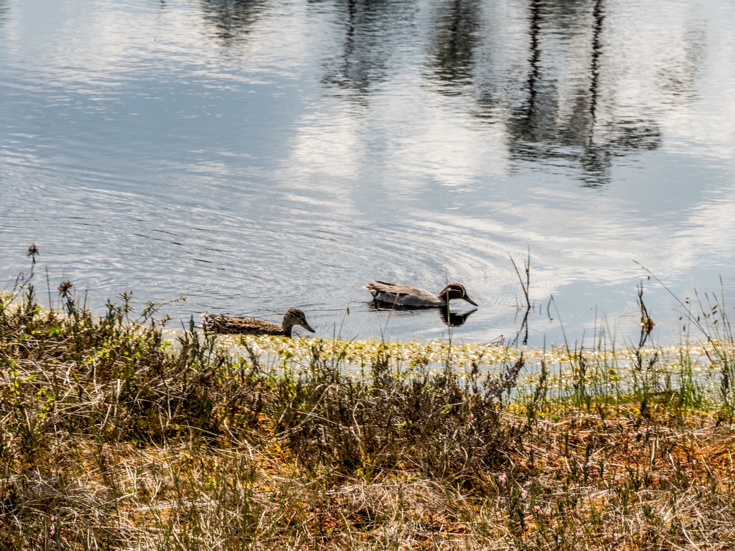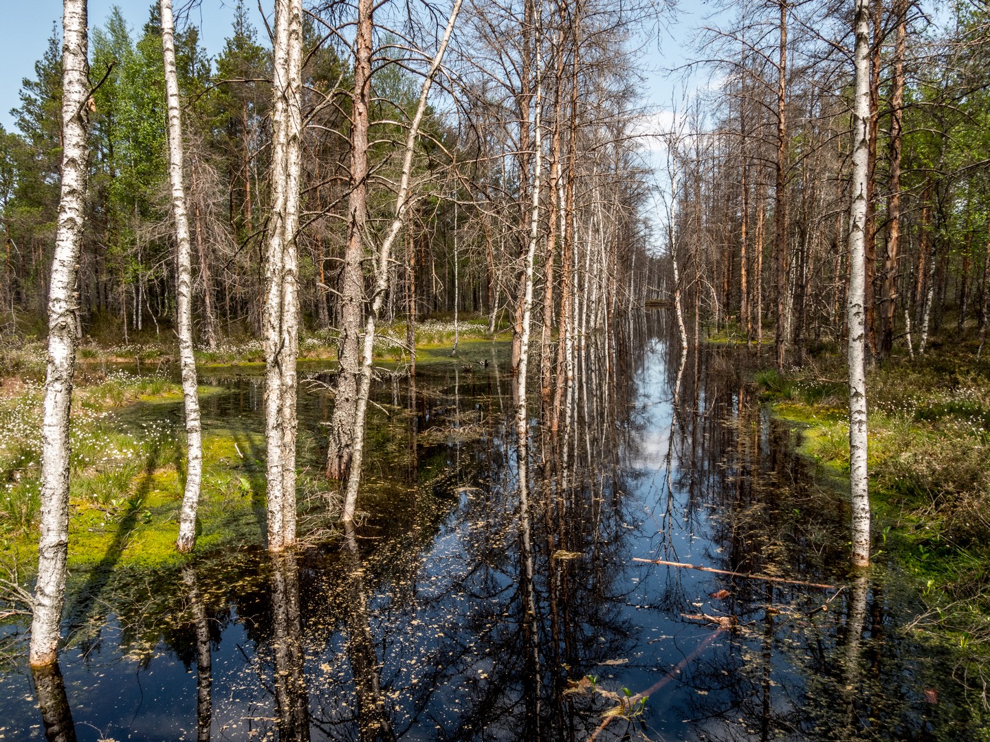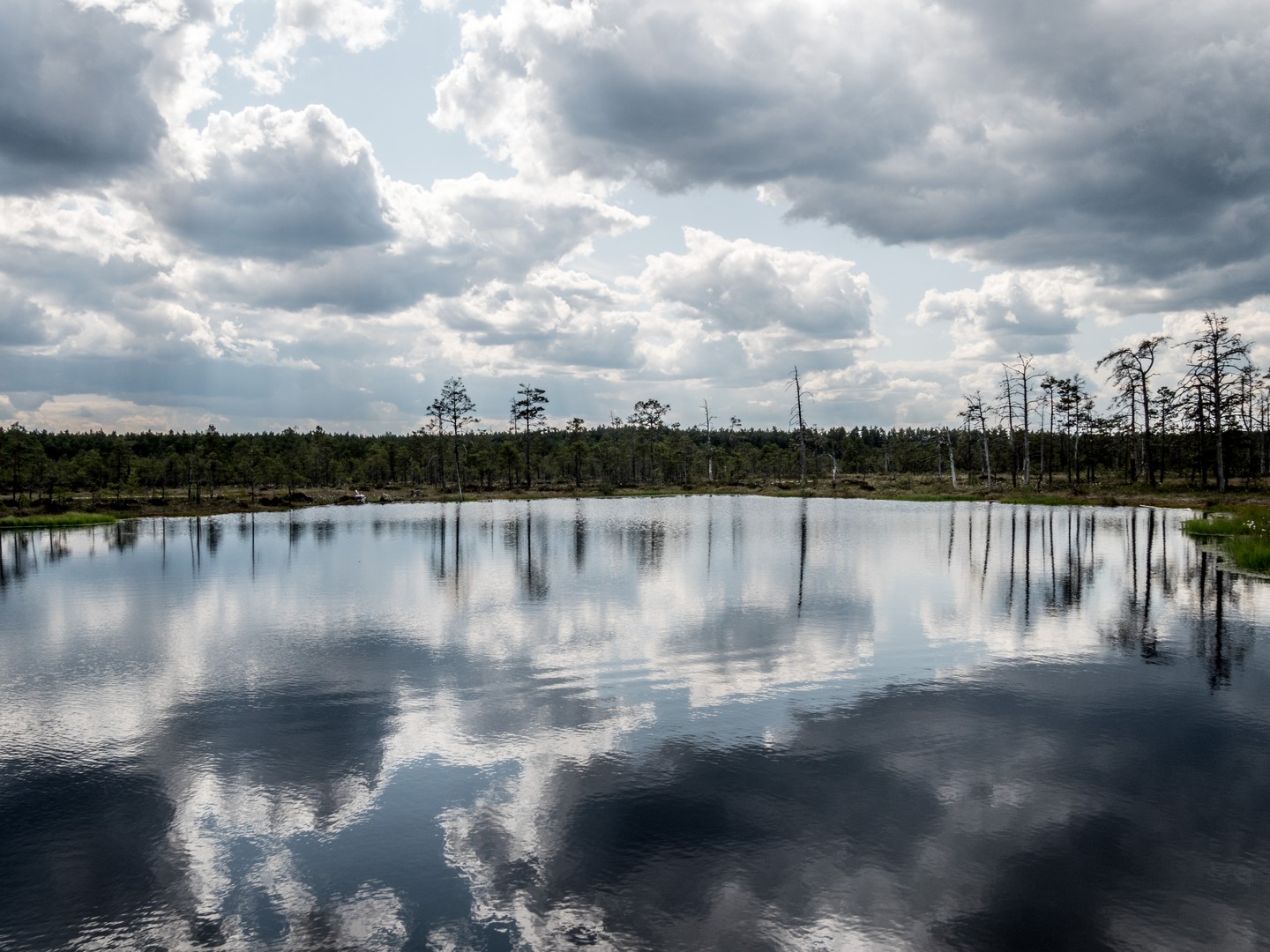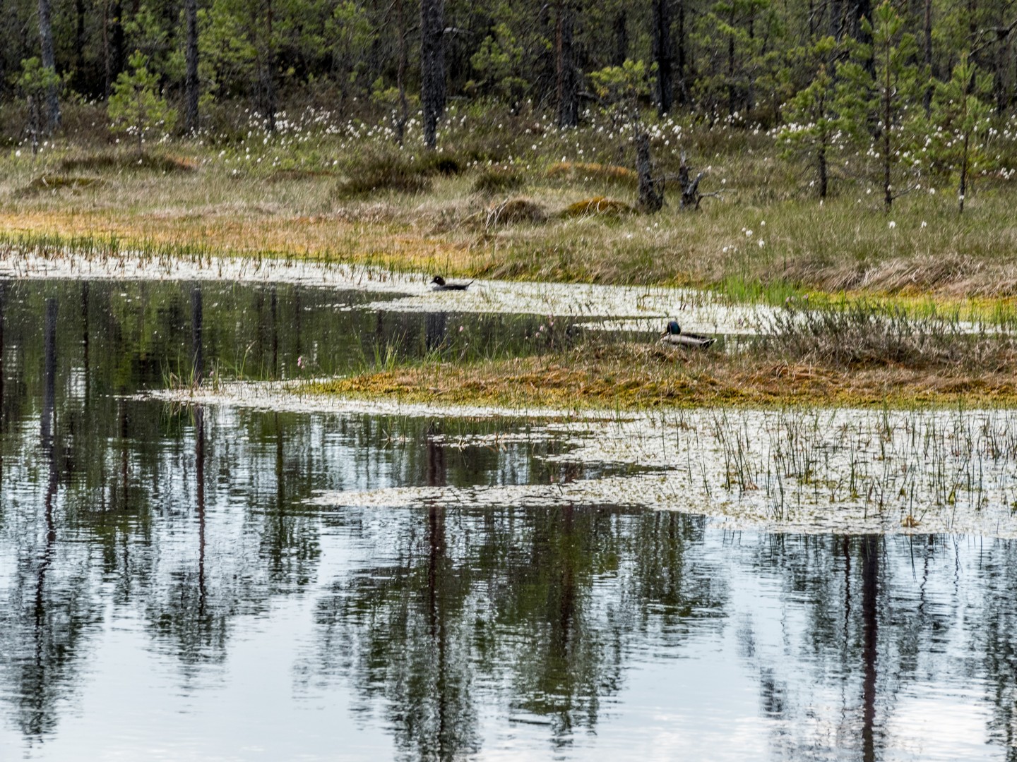 Enfin, après une petite demi-heure, l’horizon s’ouvre : me voilà arrivée au sentier de caillebotis qui traverse la grande tourbière de Viru. Me voilà dans un autre monde, suspendue entre l’eau et le ciel. Dans l’eau tranquille des marais, l’azur et les nuages s’y reflètent comme dans un miroir et en décuplent la lumière. Une lumière qui a une étrange teinte un peu jaune et chaude. J’ai l’impression d’être sur une autre planète ! Une autre planète, mais pleine de vie. Même si l’environnement n’est pas idéal pour la pousse des arbres, des plantes rares comme l’andromède (qui ressemble un peu à du muguet légèrement rose) ou plus communes, comme l’oseille des marais ou la linaigrette (qui semble supporter des boules de coton), s’y trouvent.