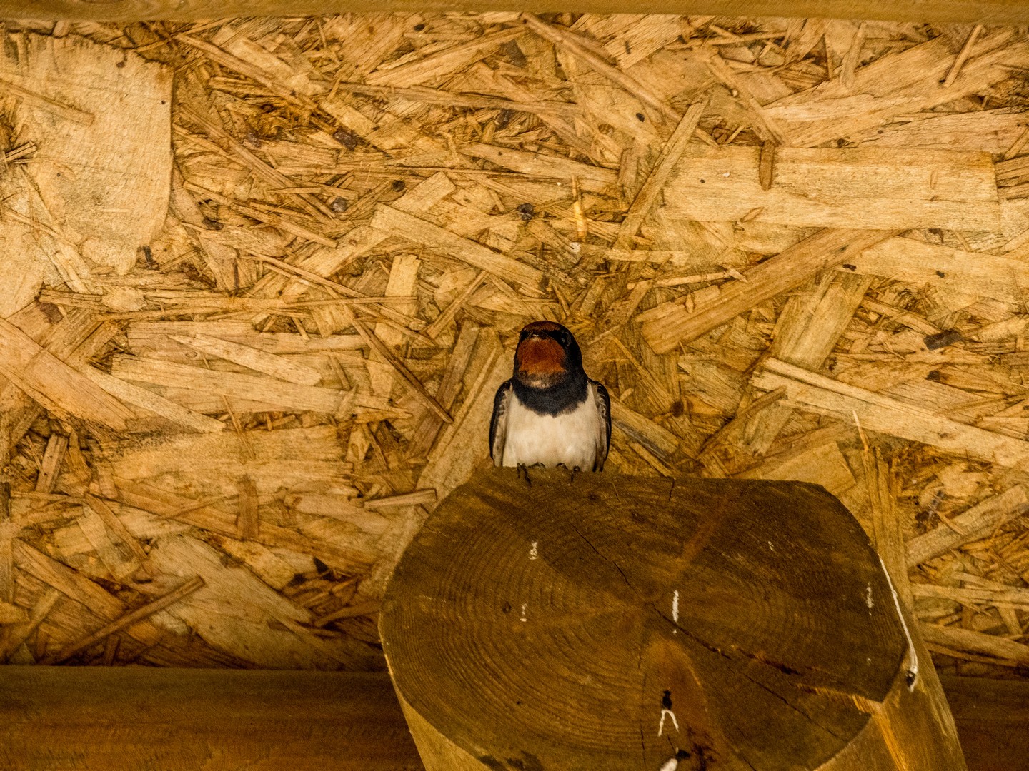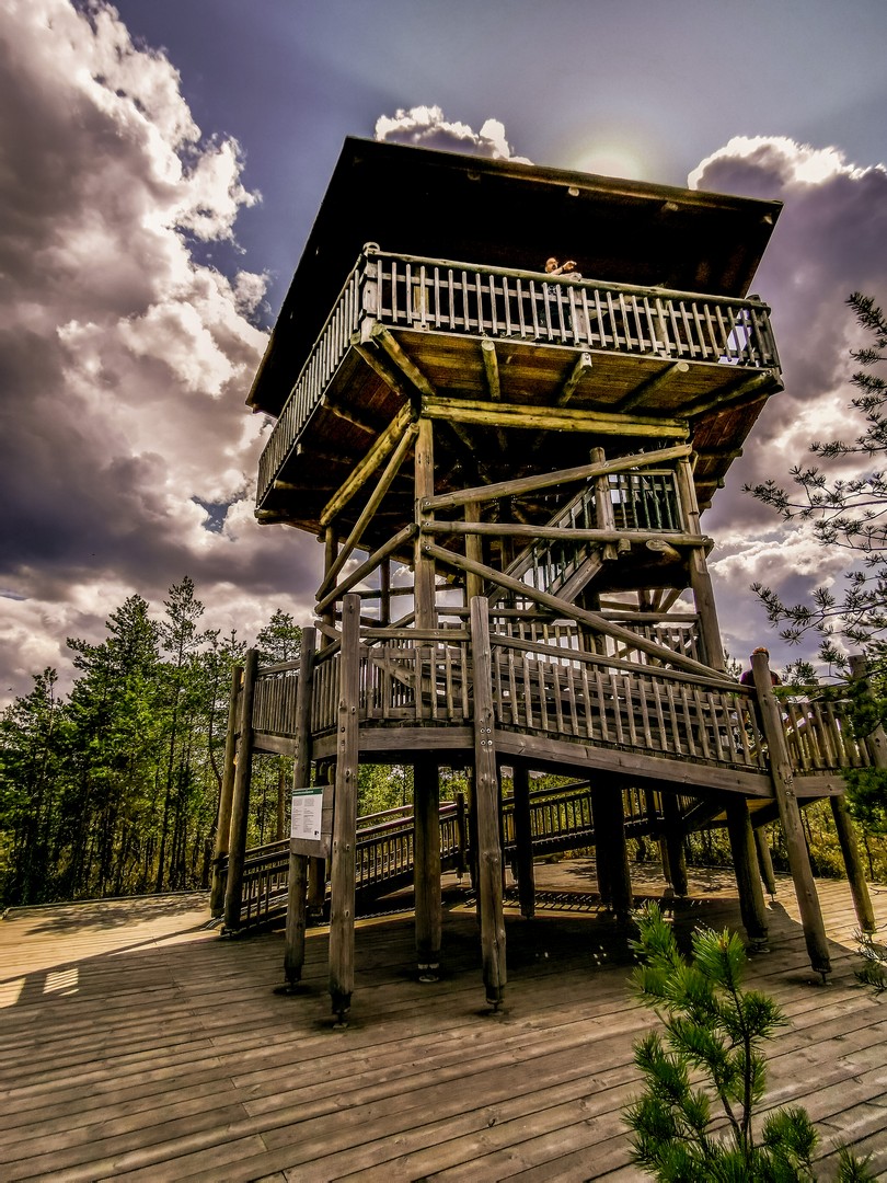 Plus ou moins au milieu du sentier suspendu, on trouve un des clous du spectacle du parc national de Lahemaa : la tour d’observation. Une haute structure en bois qui permet d’appréhender en un regard la tourbière. Les marais ressemblent à autant d’yeux qui reflètent les cieux. C’est saisissant ! Et dans la tour, je ferai une autre rencontre, avec l’oiseau national estonien : l’hirondelle rustique, qui vient souvent se poser sous le toit de la tour ! On ne peut pas la louper. Elle est blanche et noir-bleu, avec une partie de la face et de la gorge rousse et, bien sûr, la queue typique en forme d’aronde des hirondelles.
