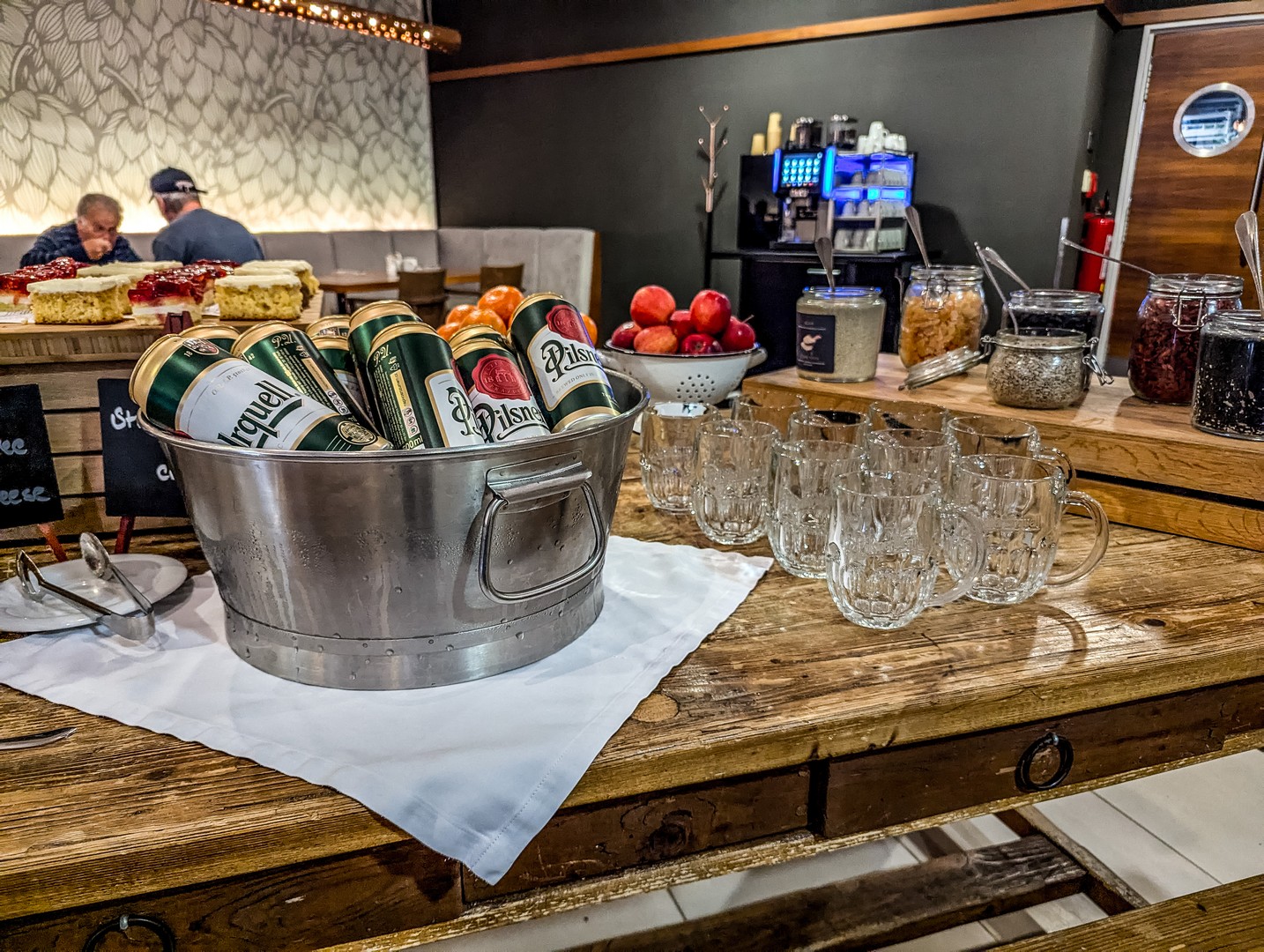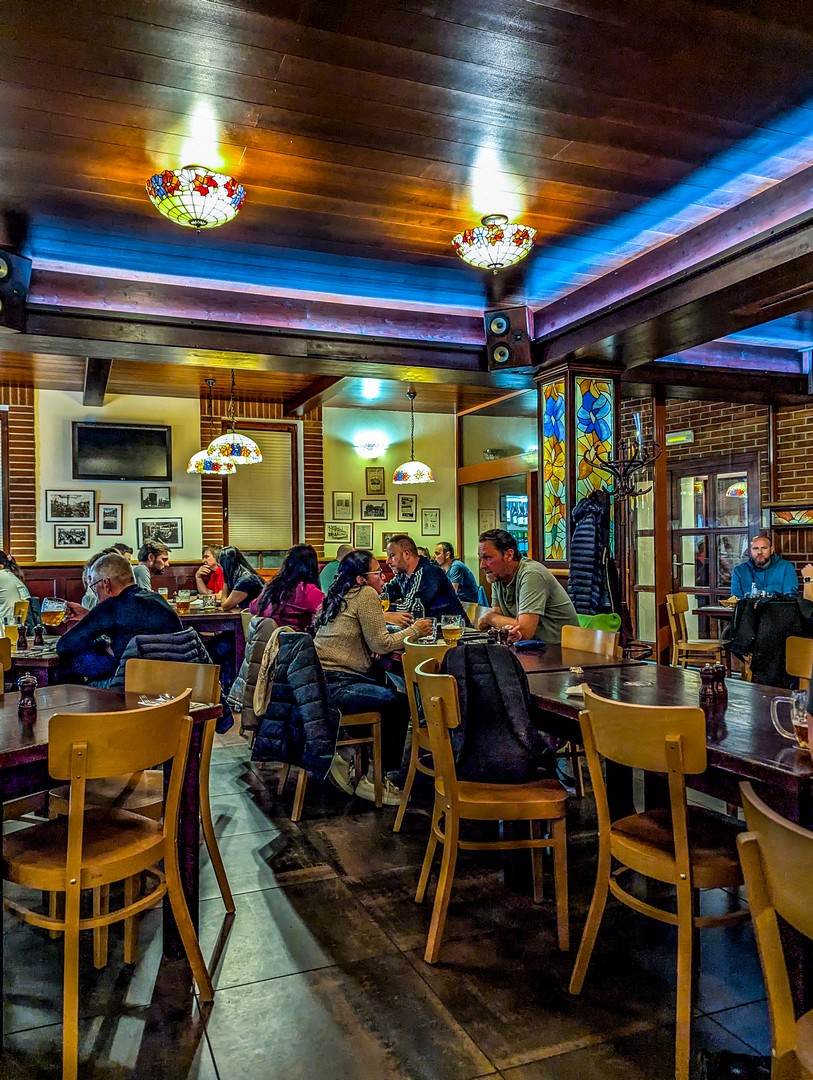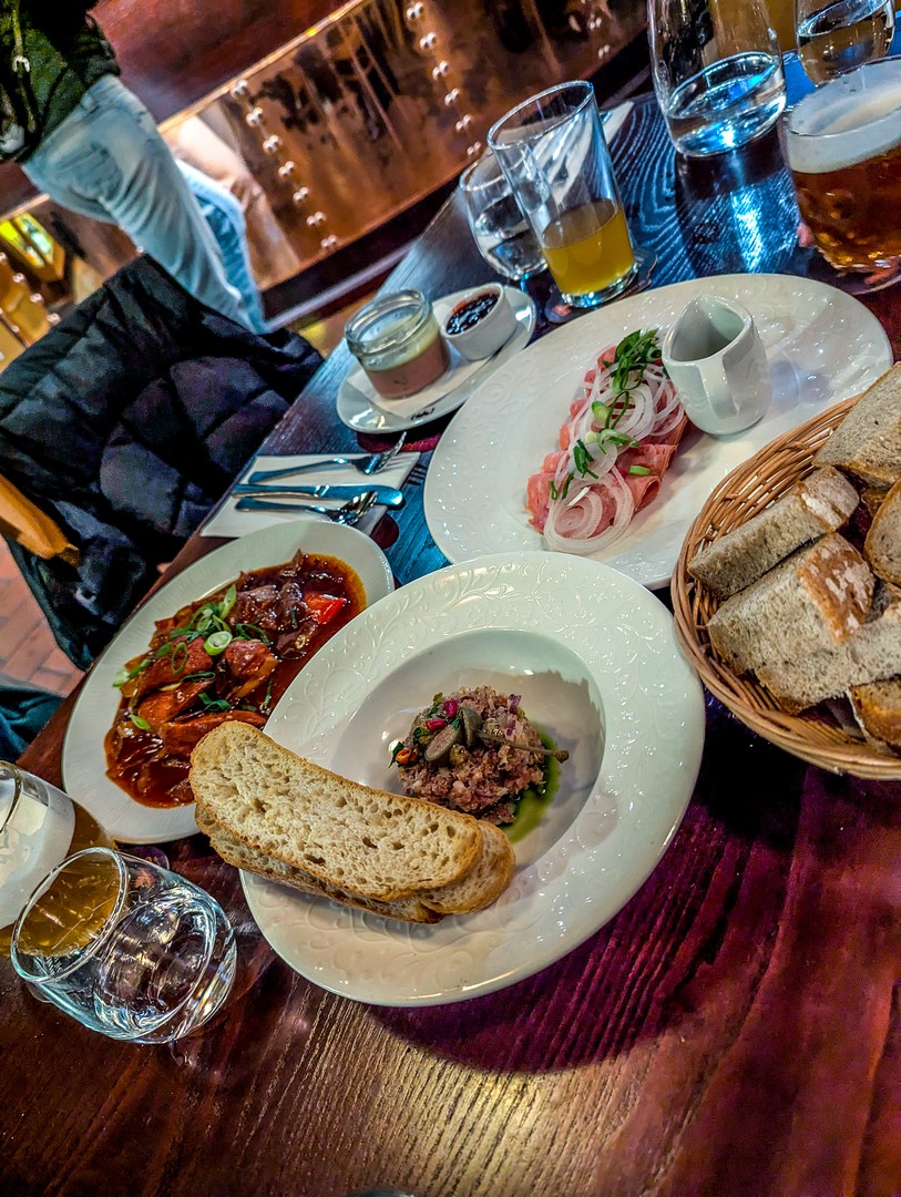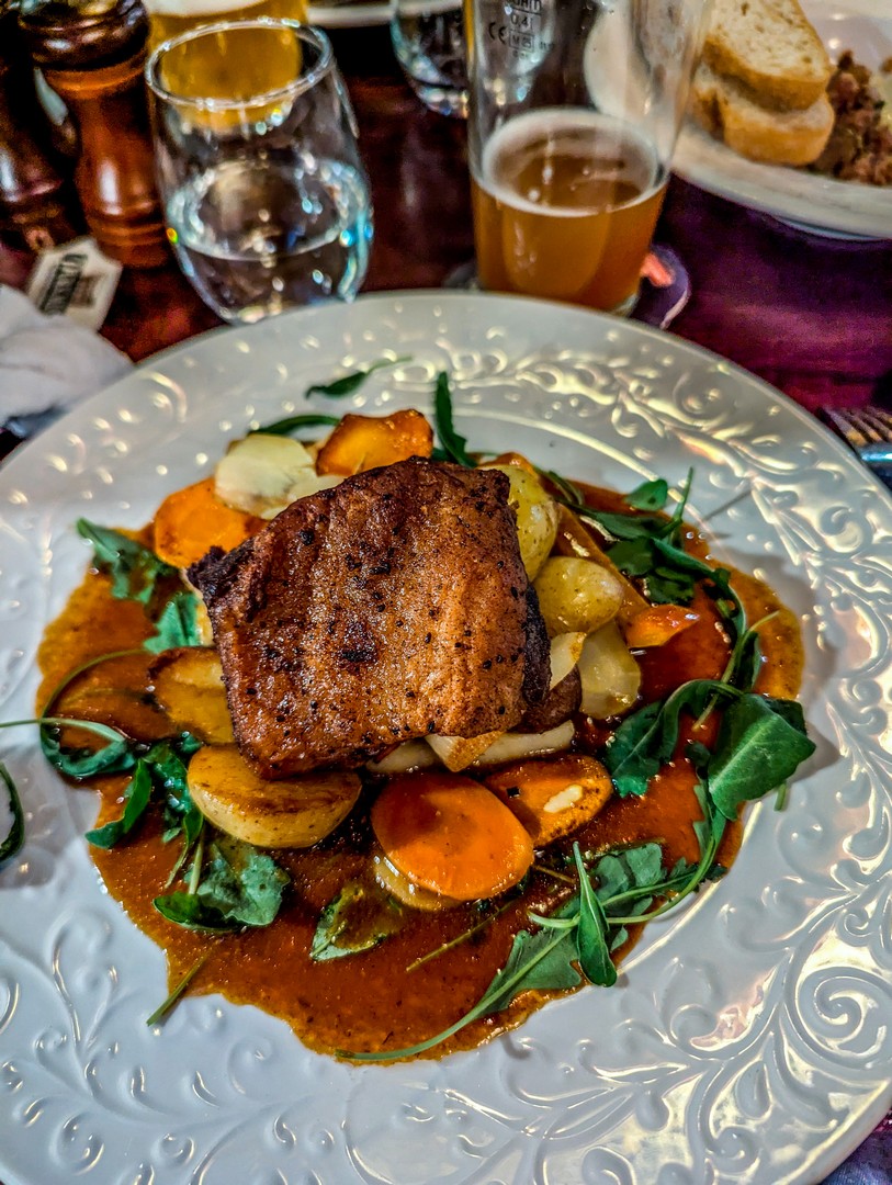 Juste en dehors de la ville, cet hôtel-restaurant-spa séduit d’emblée dès qu’on arrive, grâce à sa large terrasse. Je n’en ai pas eu la confirmation, mais ça ressemble beaucoup à une ancienne ferme. Si on peut y dormir et profiter d’un moment de détente dans leur beer spa, leur restaurant n’est pas à dédaigner. En fait, ce fut, selon moi, la meilleure adresse de mon séjour. La déco à l’intérieur est plutôt rustique, avec plein de bois sombre et de vieilles lampes, ce qui renforce encore l’impression d’être dans une ferme. Et l’adresse semble populaire : il est quasi plein à l’heure du dîner. Au menu : une cuisine locale mais raffinée dans sa présentation. En entrée, nous avons choisi un mix de petits plats style tapas avant de passer au plat principal (une ventrèche de porc avec légumes-racines pour moi). Un délice ! Et gros point positif : ils brassent leur propre bière ! Comme de bien entendu.