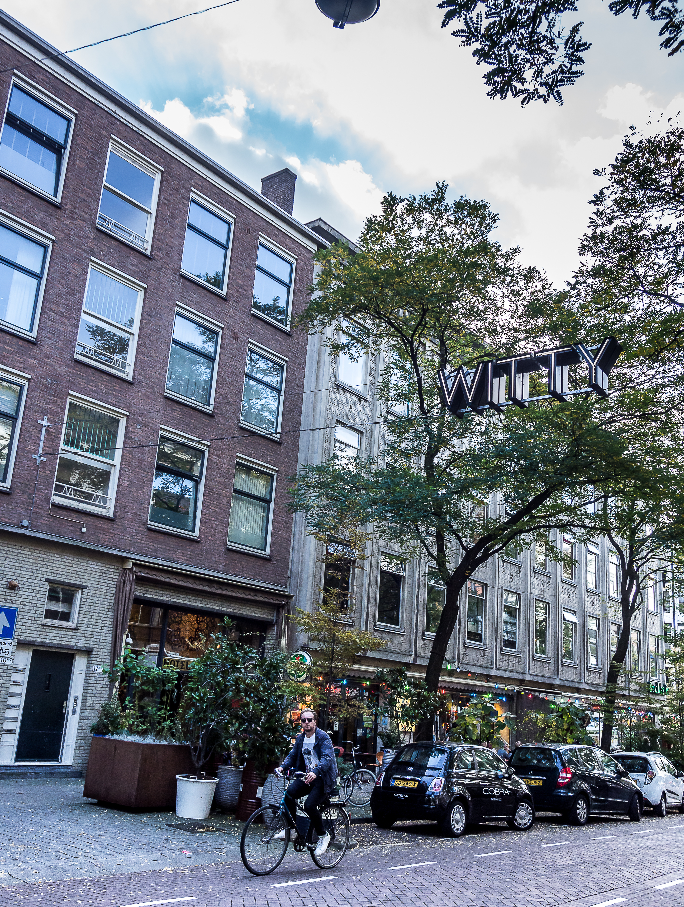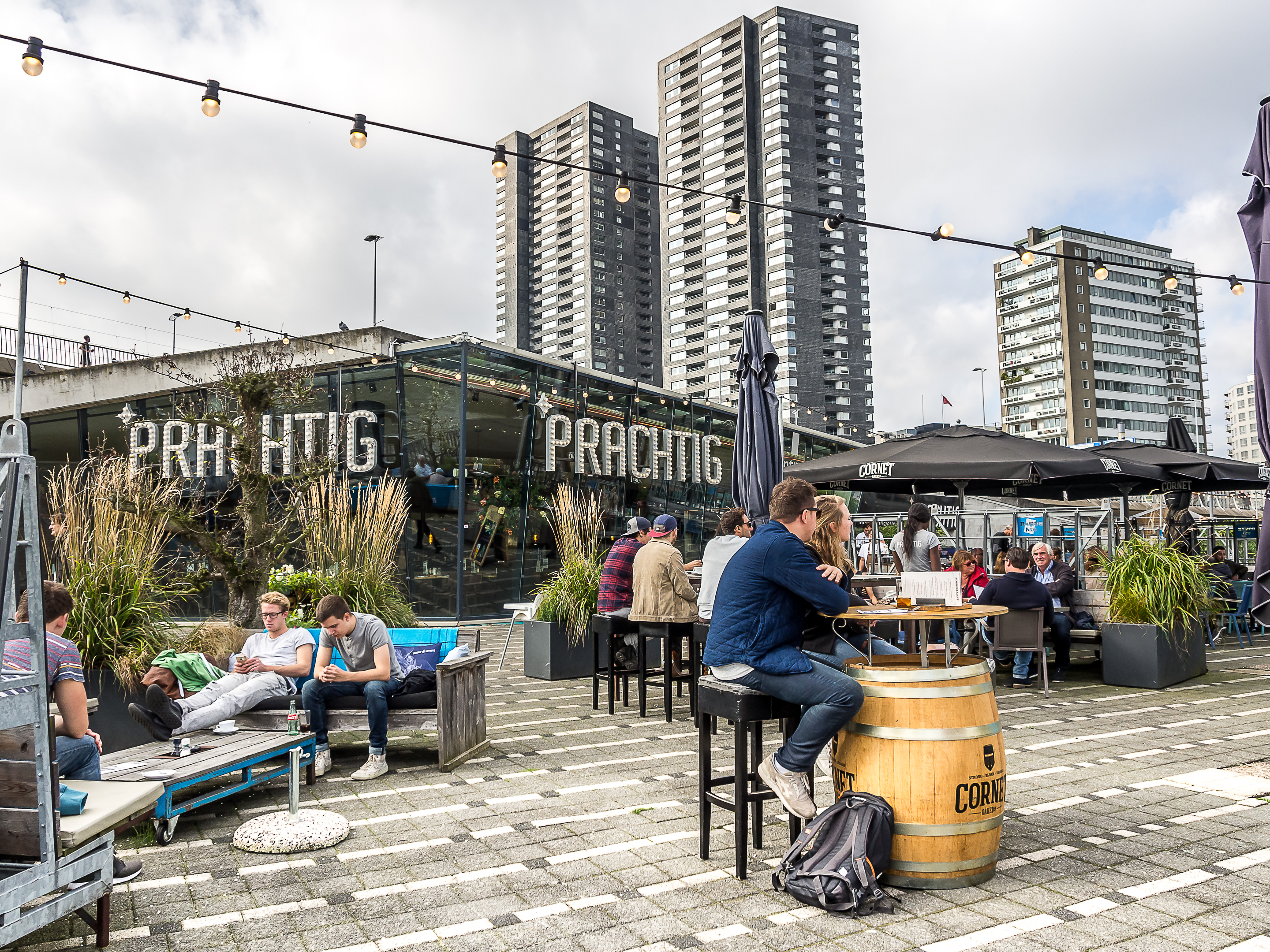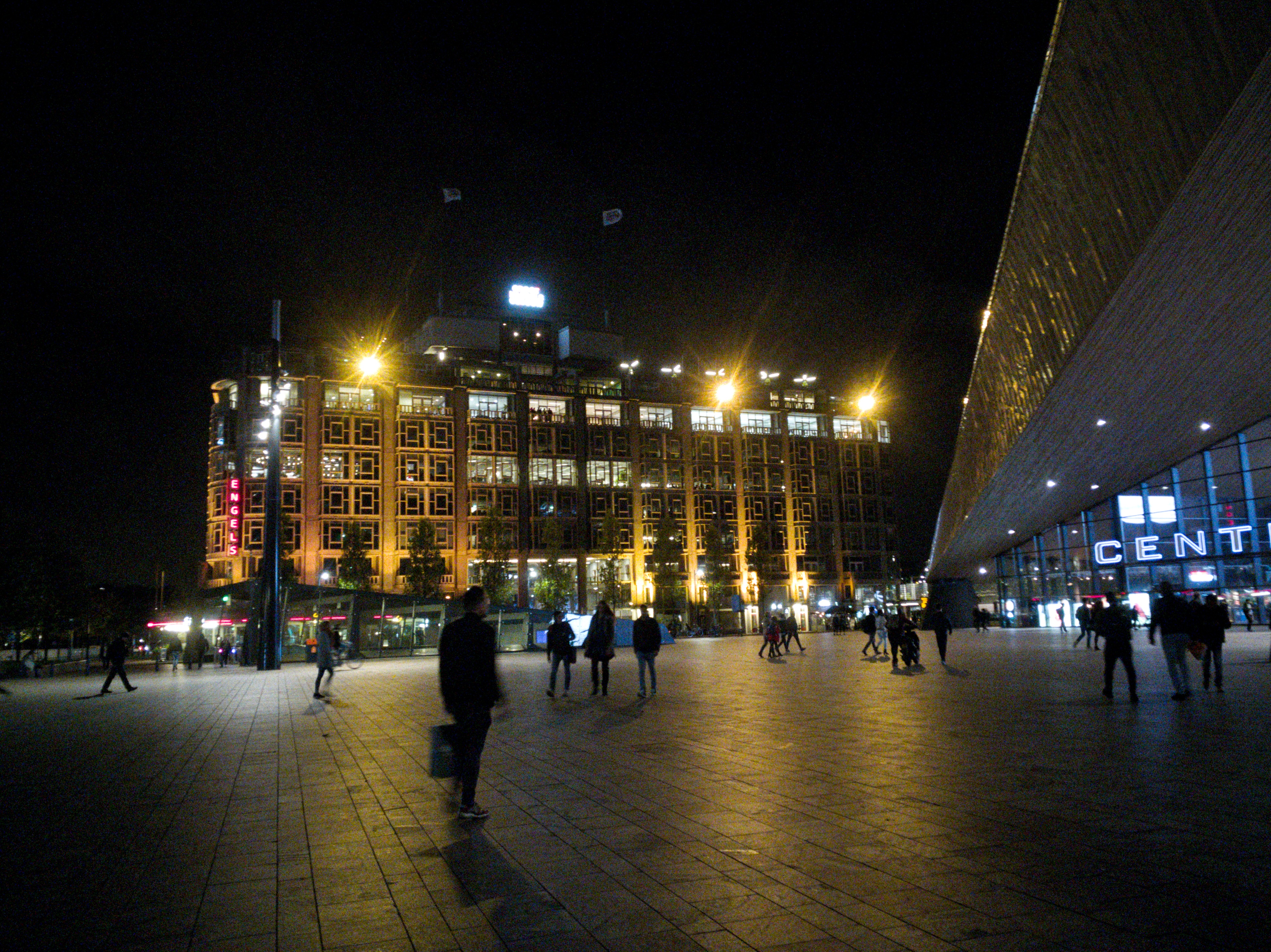 Sur Weena, la grande avenue qui longe la gare, j’ai vraiment l’impression de me retrouver à Cleveland ou à Chicago, avec d’immenses immeubles de bureau. Et ce sentiment de familiarité n’est pas anodin, le Groothandelsgebouw, un des plus anciens bâtiments de la reconstruction où je vais commencer ma soirée, est inspiré par le Merchandise Mart de Chicago, justement. Tout en béton ajouré de carrés et de rectangles, « Le grand bâtiment du commerce » (littéralement) est une vraie cité et prend la taille d’un pâté de maison. C’est tout simplement gigantesque : bureaux d’architecture, d’avocats, commerces, il y a de tout.