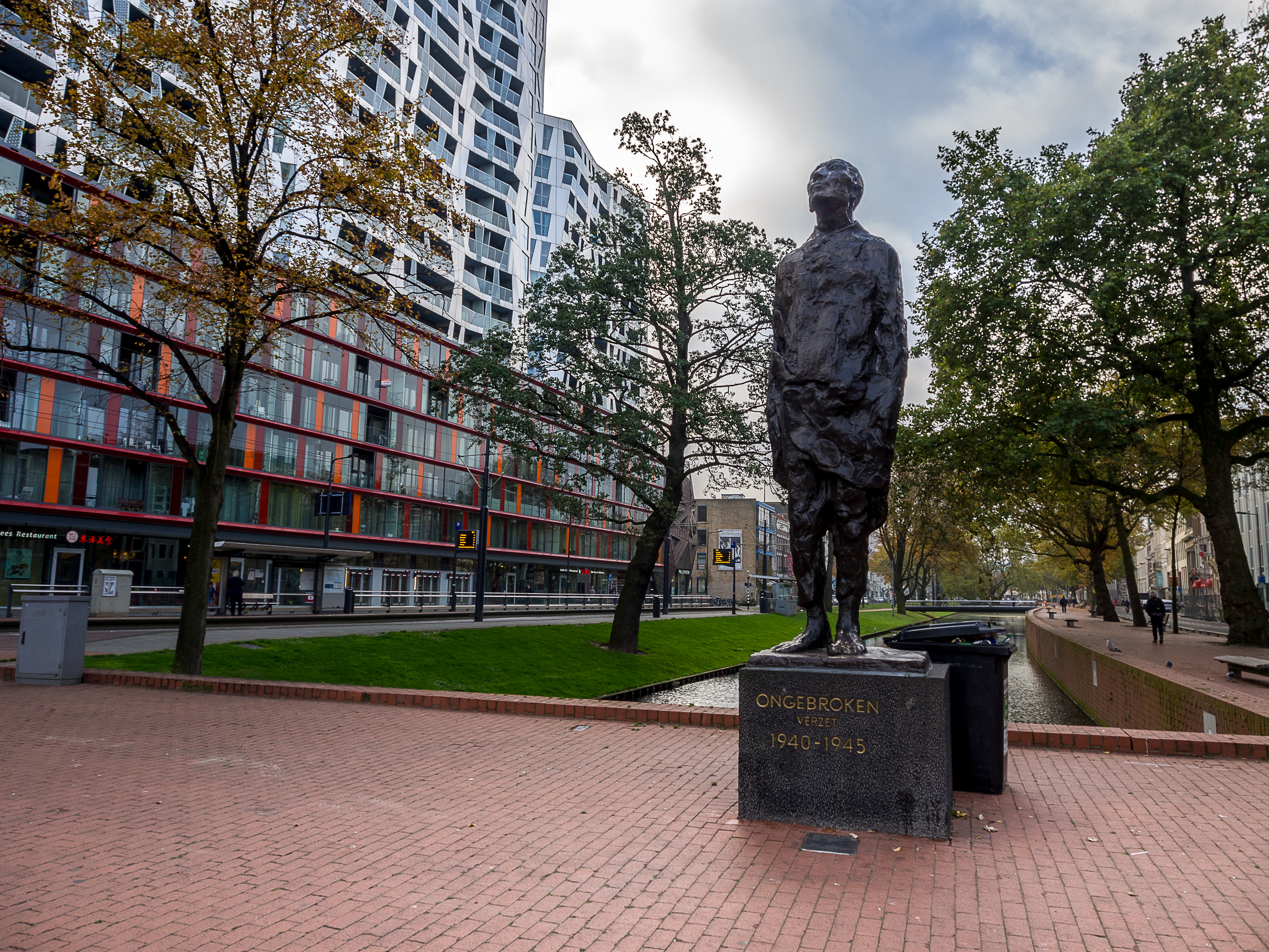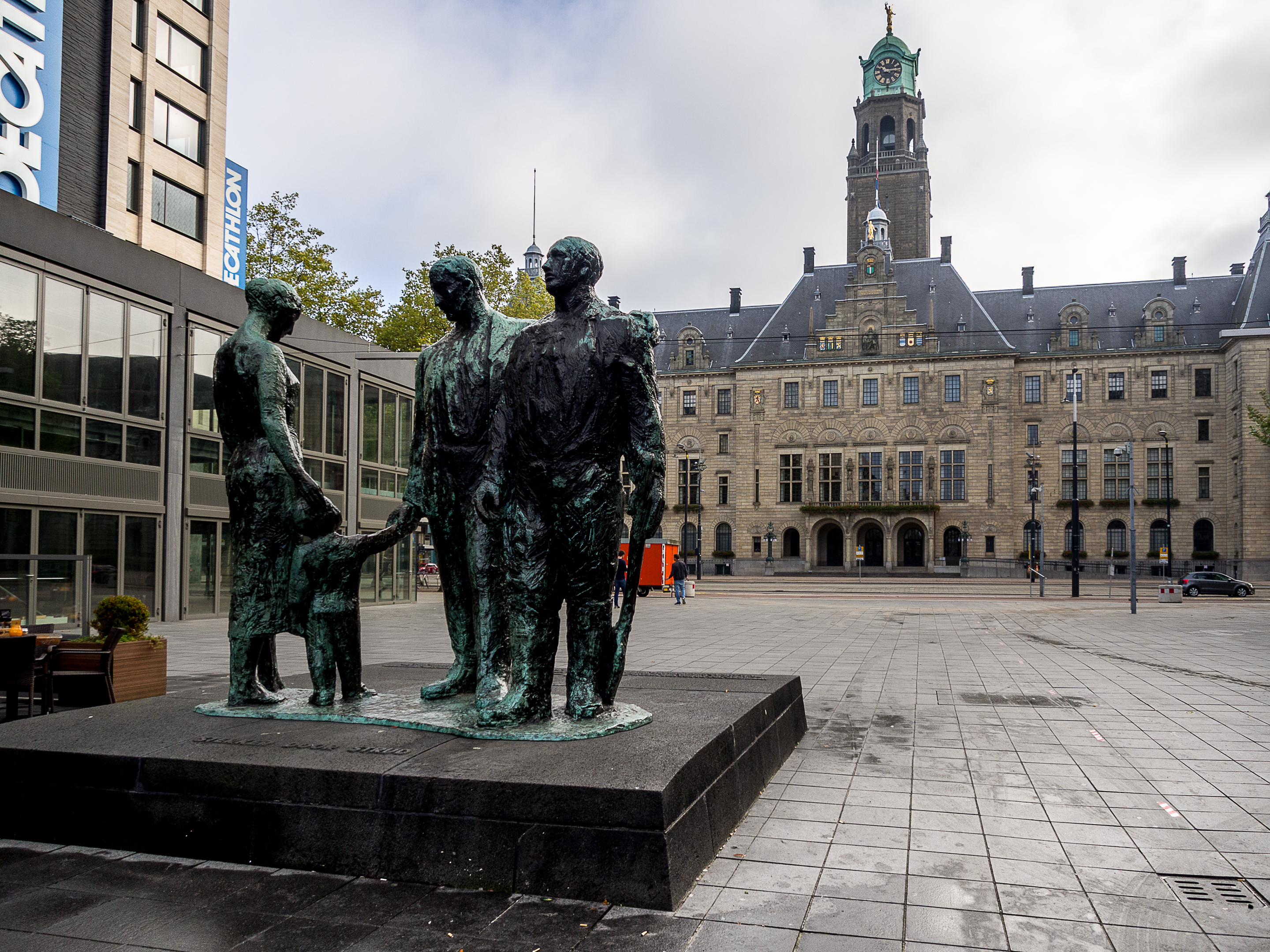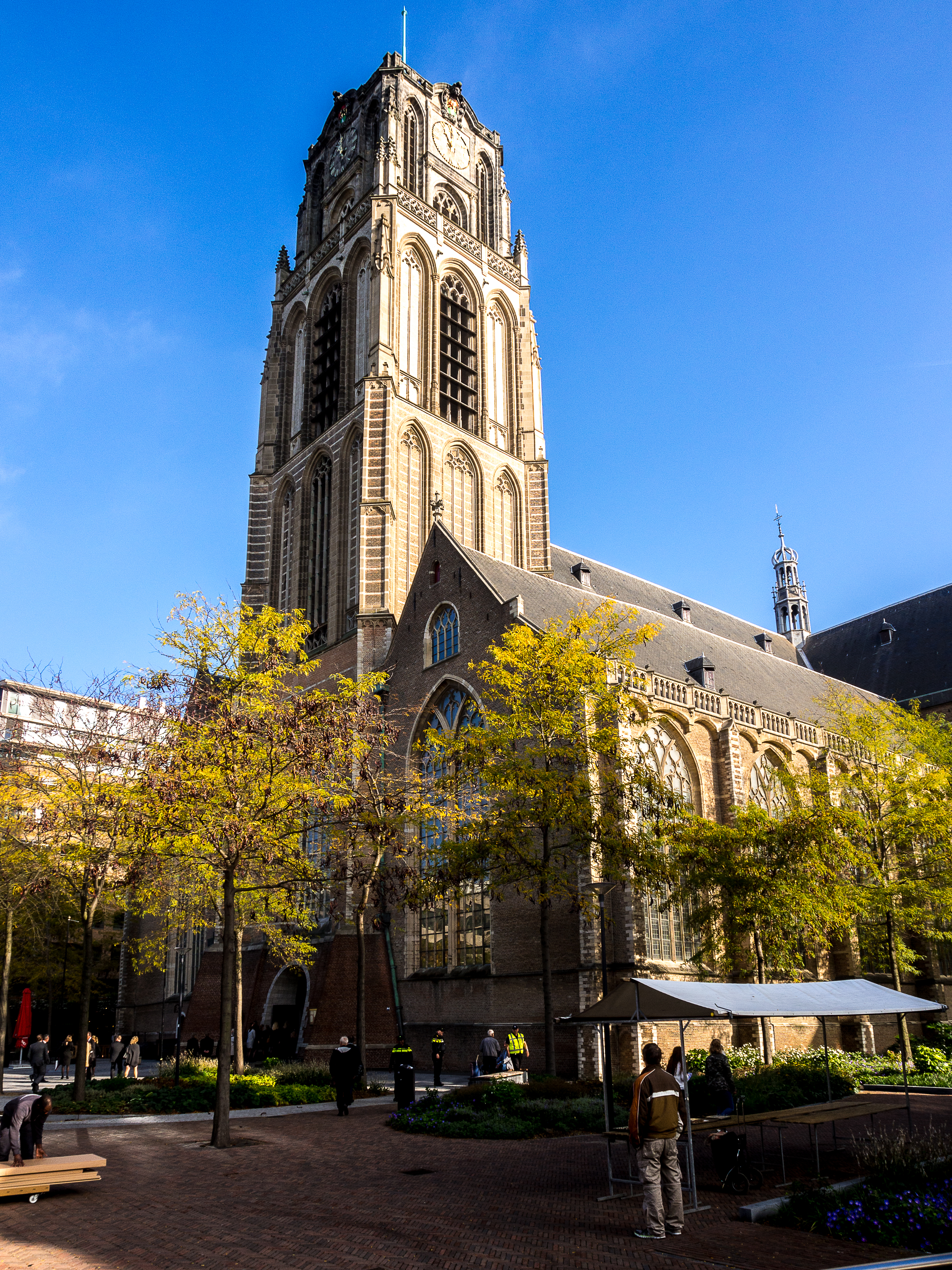 Petit à petit, je me rapproche de mon objectif du midi : le Markthal, l’une des constructions les plus étonnantes de toute la ville mais avant, il convient de faire un détour par Groote of Sint-Laurenskerk. La seule survivante du Rotterdam médiéval suite aux bombardements, bien que l’église fût très endommagée. Son clocher resté debout était devenu un symbole de résistance et de résilience pour les habitants de Rotterdam. Je ne ferais malheureusement qu’en admirer l’extérieur, une foule de personnes habillées de noir m’informant que des funérailles allaient commencer. Je m’attarde un peu… le soleil s’est franchement montré à présent et l’air est doux, pas une mauvaise journée pour accomplir le dernier des voyages.