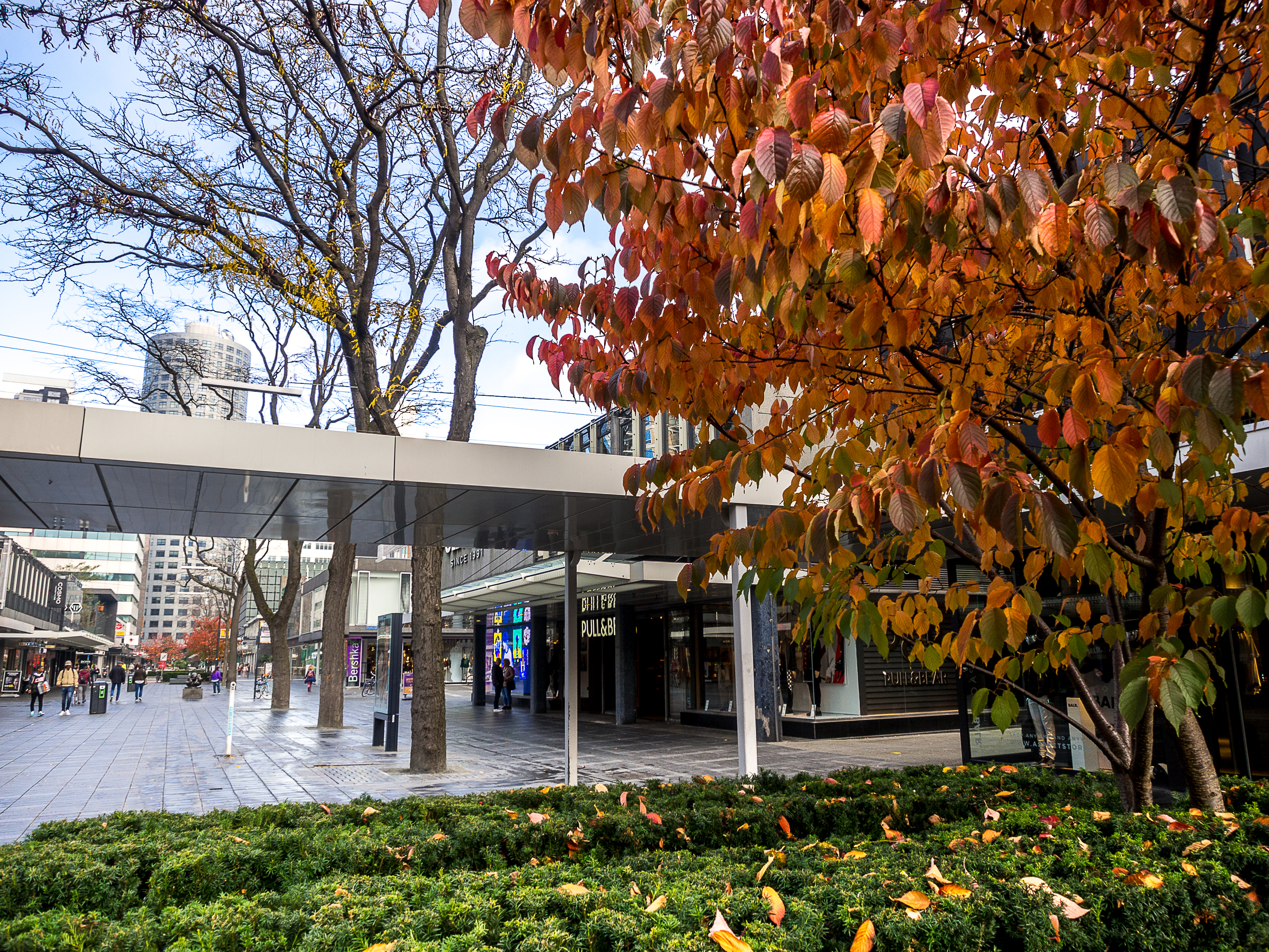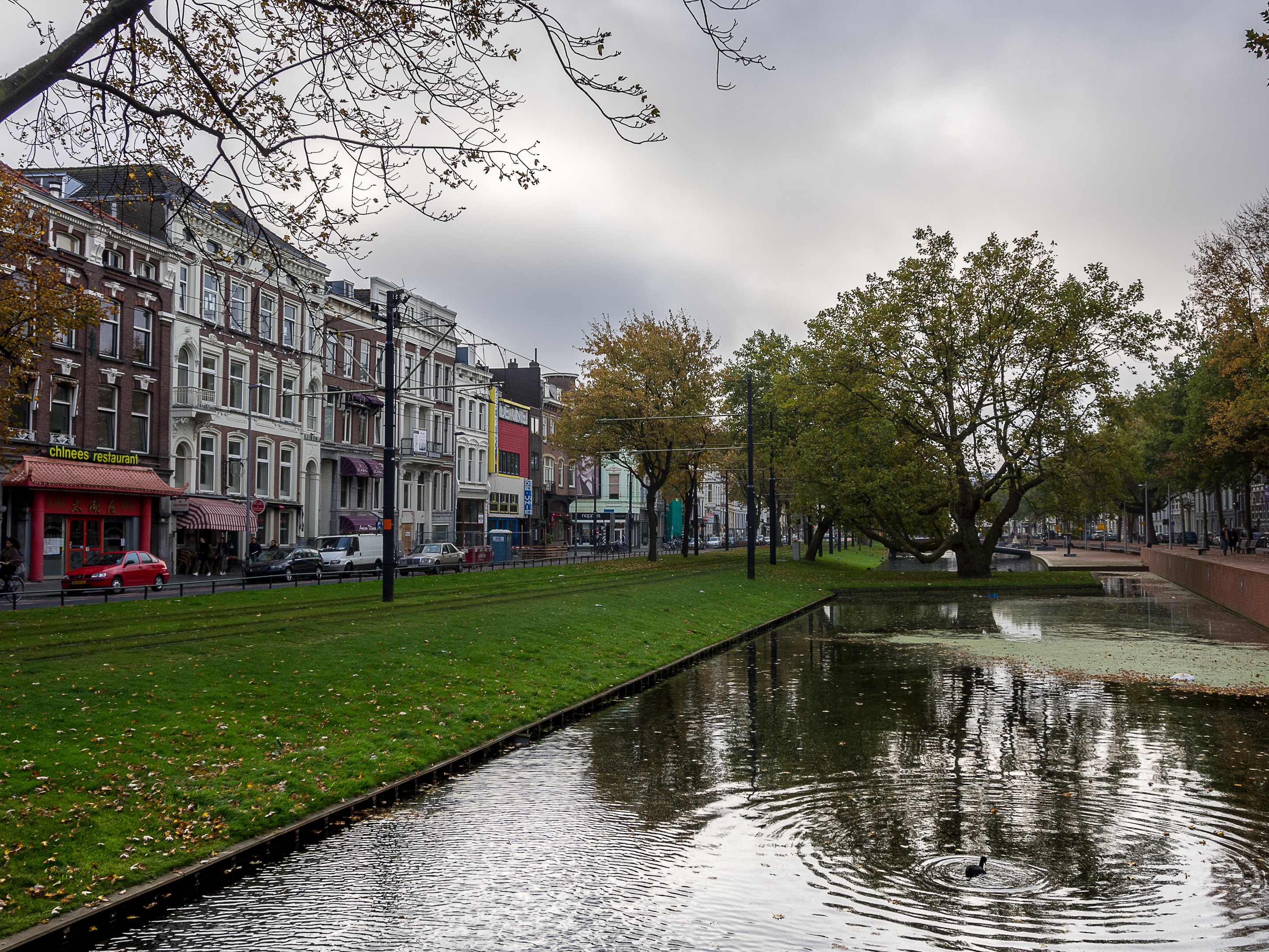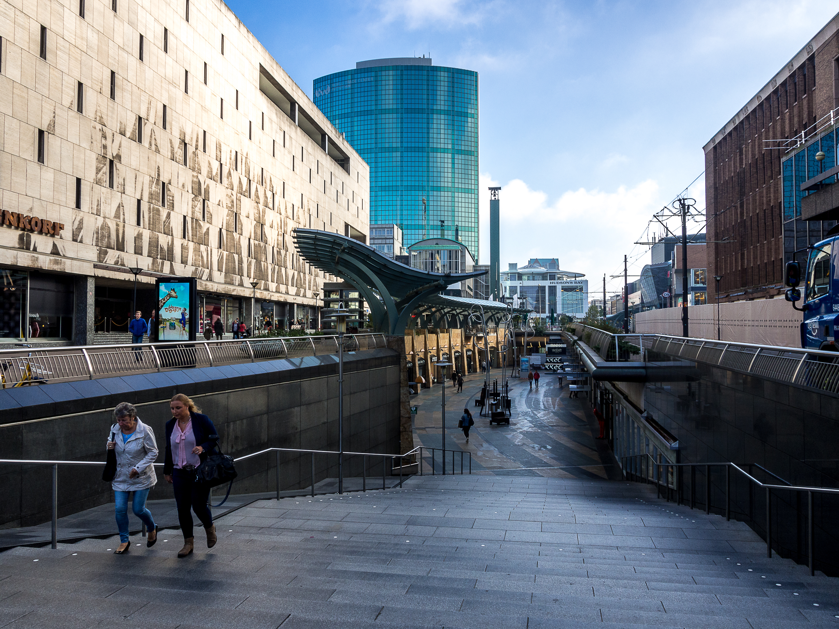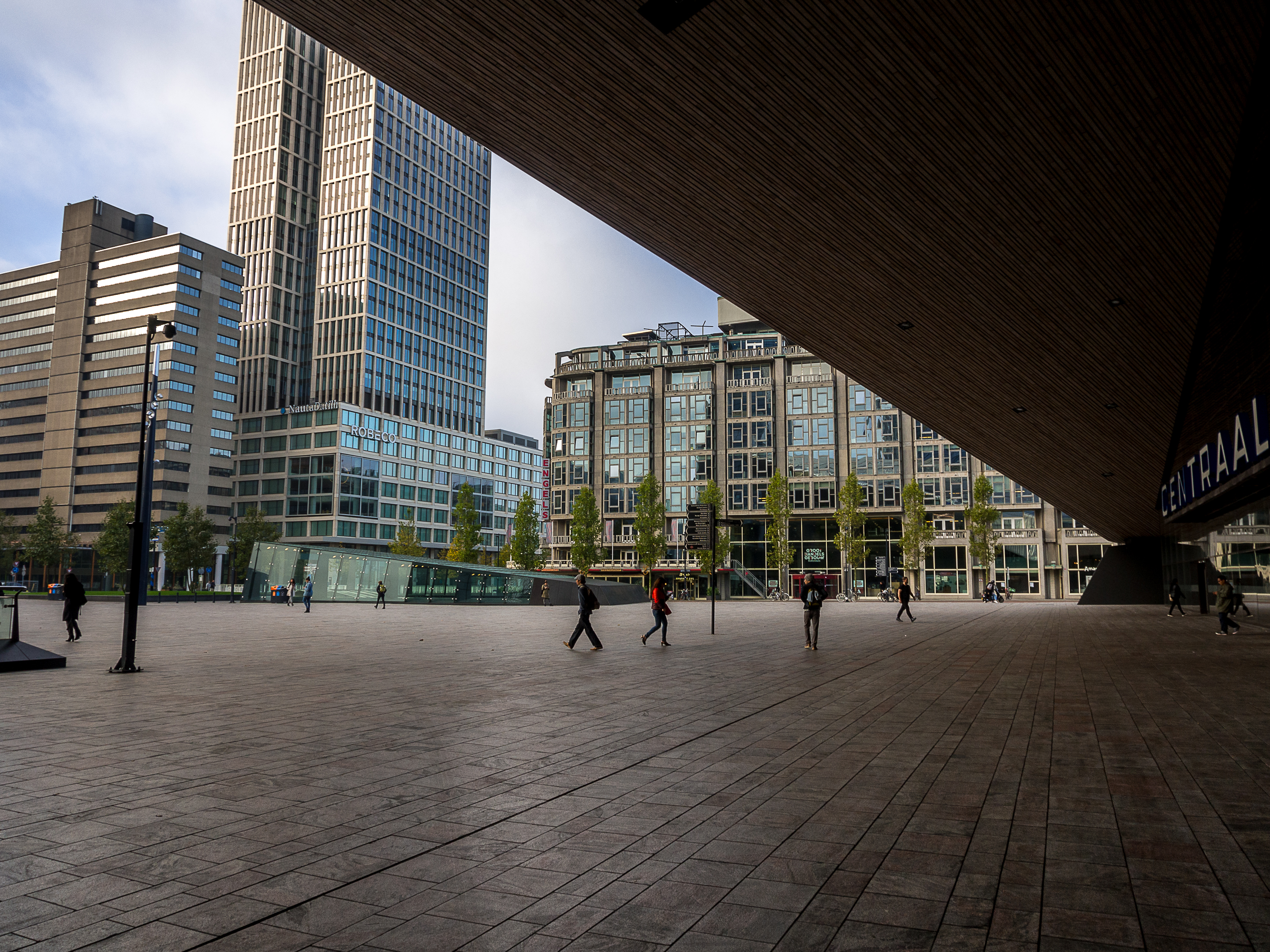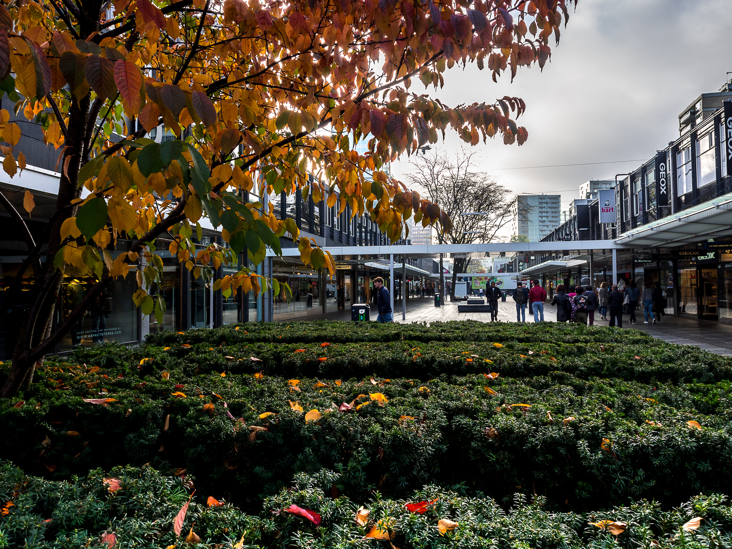 Une légère brume plane encore sur les rues, et comme il est encore tôt, à part quelques pigeons et mouettes, je ne croise presque personne, ni même quand j’arrive dans la plus ancienne artère commerçante post-reconstruction, la Lijnbaan. Zone piétonne et arborée, la Lijnbaan n’est en fait qu’une partie du district commerçant de Rotterdam qui se prolonge avec la Beurstraverse (la « Koopgoot » pour les intimes) et les énormes centres commerciaux de la Beursplein. Si vous êtes un/e accro au shopping, vous allez littéralement halluciner à la vue du nombre et de la taille des magasins. Par contre, j’ai pu constater qu’on ne rigole pas avec le règlement : pas de skate, pas de cris, on attache son animal de compagnie et PAS DE PHOTOS. Si vous voulez faire un selfie, il faudra utiliser les iPads géants à votre disposition. Pour paraphraser le commandant Turbo de « Natacha » : « Je n’ai jamais vu ça ».