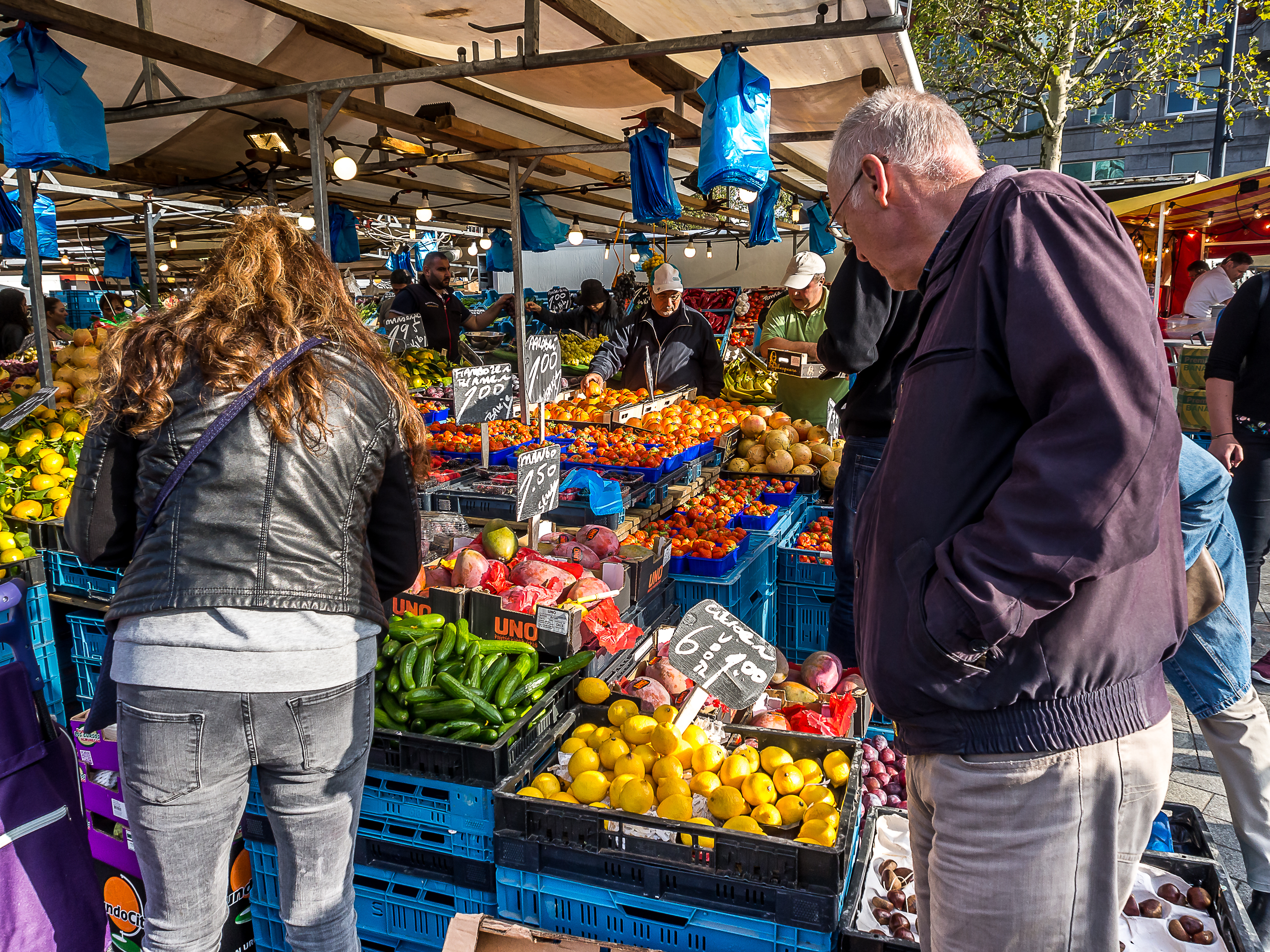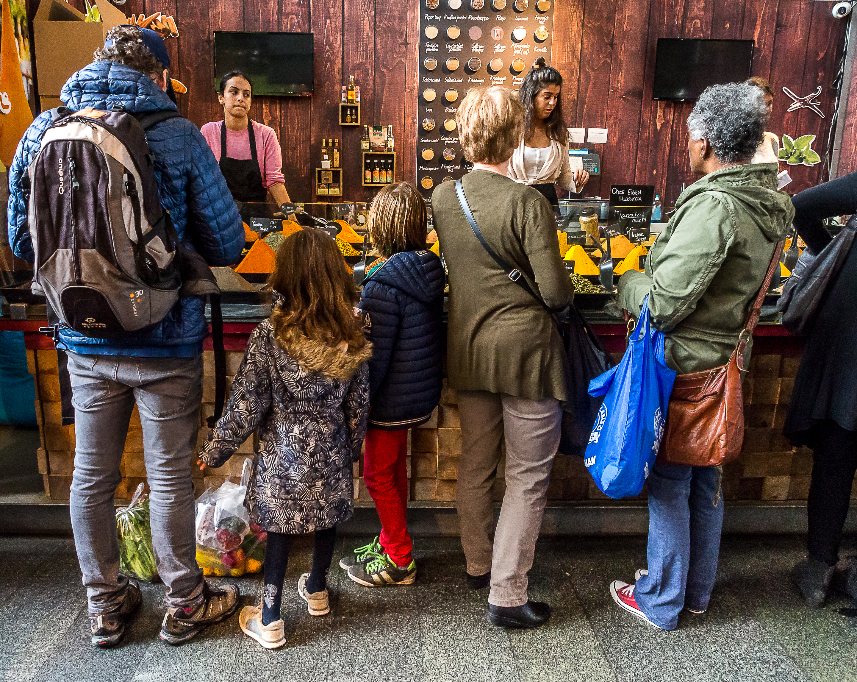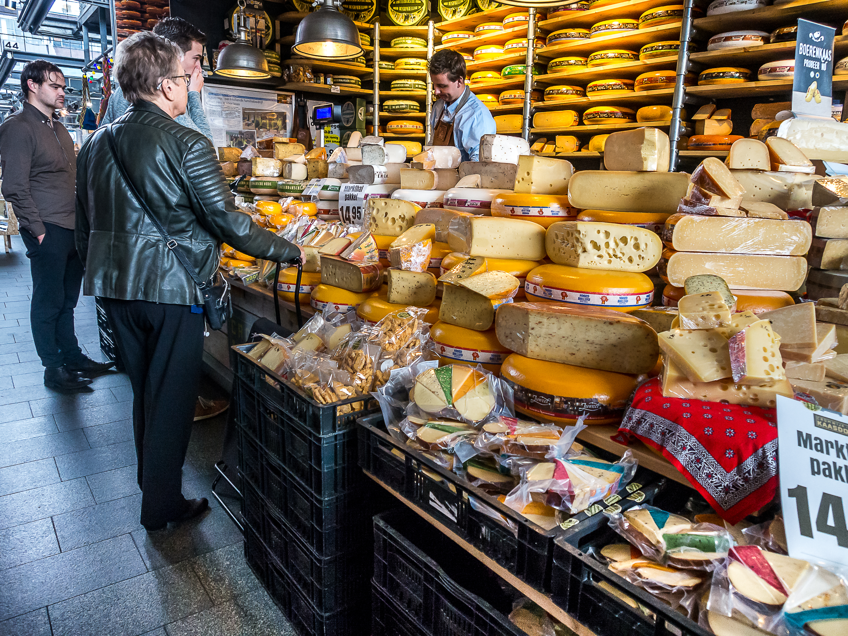C’est donc déjà repue que j’arrive au Markthal et que puis-je dire ? Je suis impressionnée au possible ! Le lieu est grandiose. Ouvert en 2014, on dirait un gros tunnel creusé dans une terril qui dominerait le quartier. Il s’agit en fait de halles mais pas les halles à la française comme j’ai appris à les connaître où on trouve essentiellement des maraîchers, des bouchers ou des poissonniers. Ici, il y en mais ce n’est pas l’essentiel : il y a des tas de boutiques, de cafés et de restaurants. A l’hollandaise, rentabilité oblige. Mais ce qui marque le plus, outre tous les délices qu’on peut y trouver, c’est le plafond. Tous les murs sont en fait une seule et même œuvre d’art, une des plus grandes au monde ! Fruits, légumes, poissons, viandes… toutes les denrées traditionnelles du marché y sont représentées.