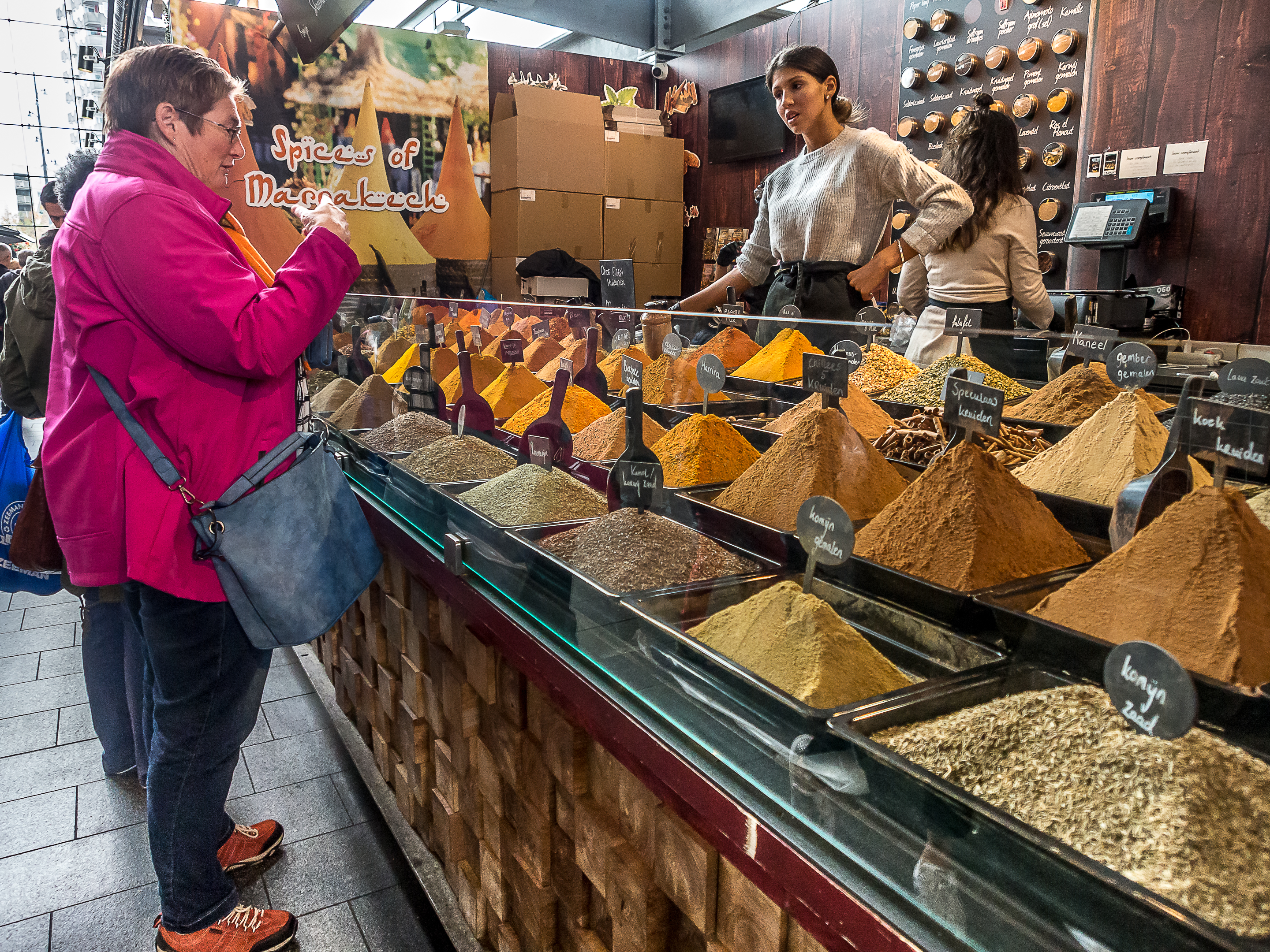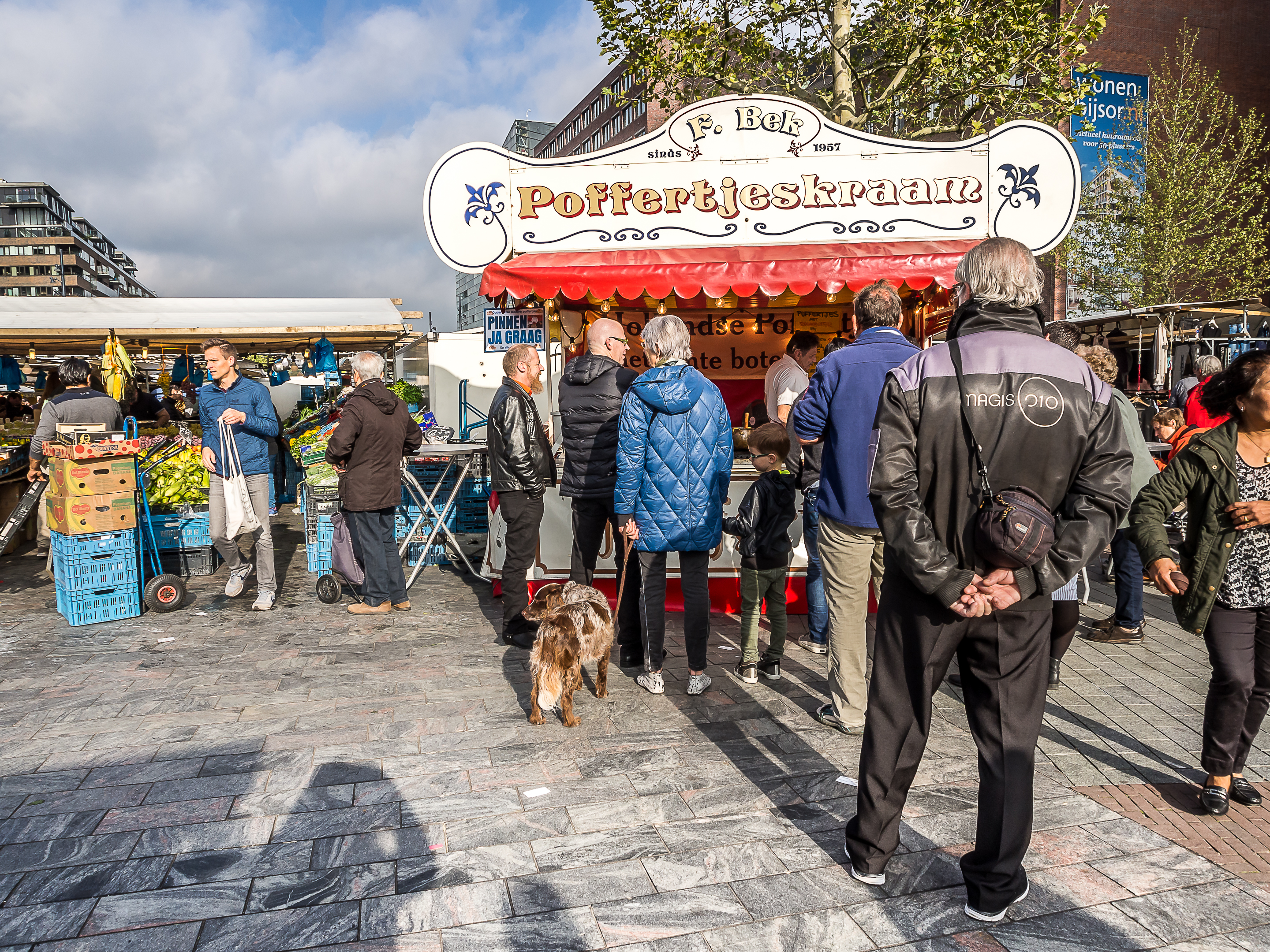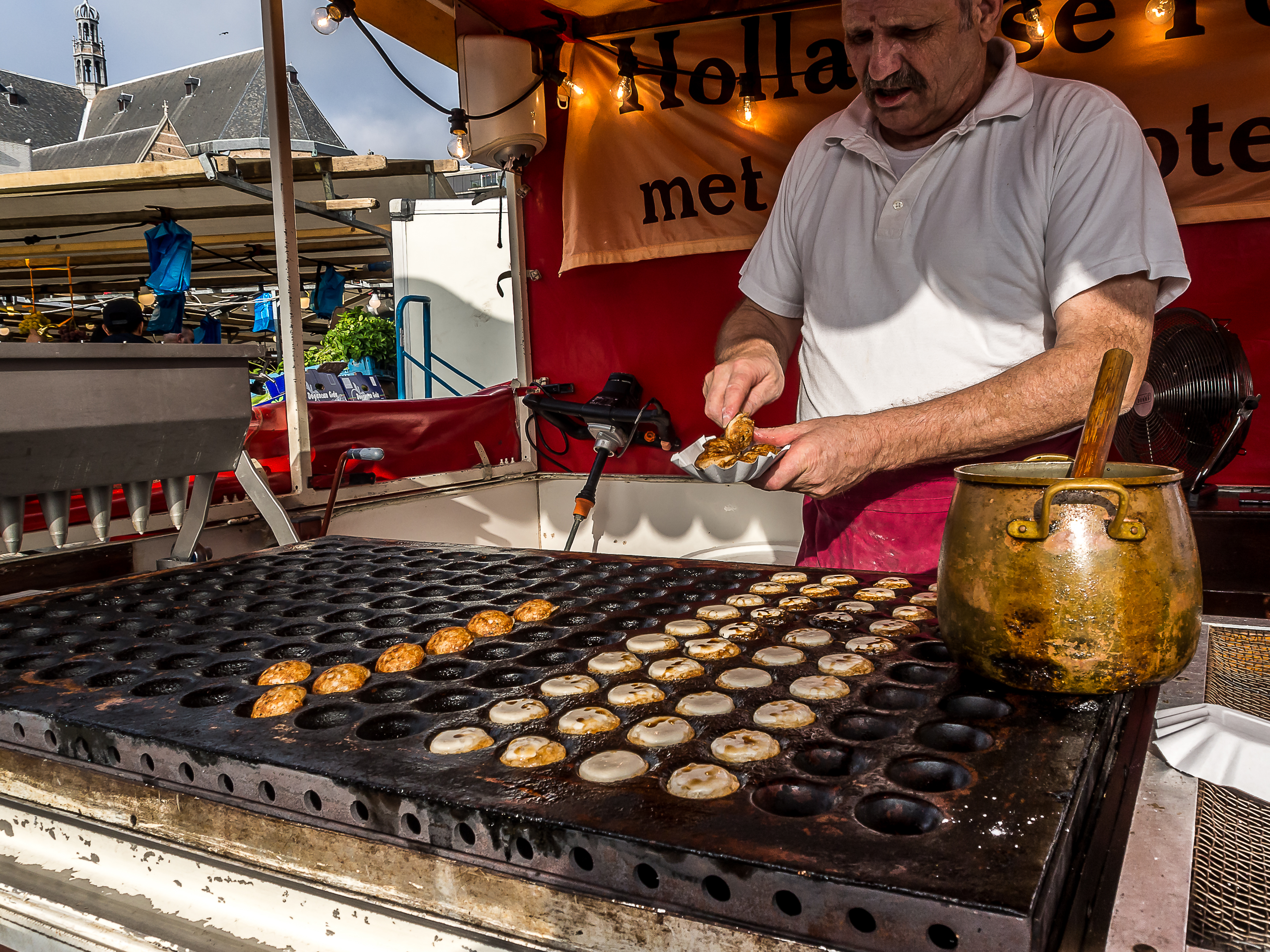 C’est du côté des vivants que mes pensées vont se tourner à présent, puisque avant d’arriver au Markthal, je me retrouve en plein marché : fruits légumes, BD, vinyles… on trouve de tout mais ce qui va attirer mon attention, c’est un petit kiosque ou une file imposante lézarde sur le trottoir : c’est un stand à poffertjes ! Les poffertjes, kesako ? Il s’agit d’espèces de mini pancakes bien gonflées et moelleuses qui sont servies avec un bon morceau de beure et du sucre impalpable. Si tu tombes sur une pareille merveille, fais-toi plaisir, Lectrice, Lecteur. Tu ne le regretteras pas ! Mais attention, c’est nourrissant et même une portion « enfants » va te remplir l’estomac !
