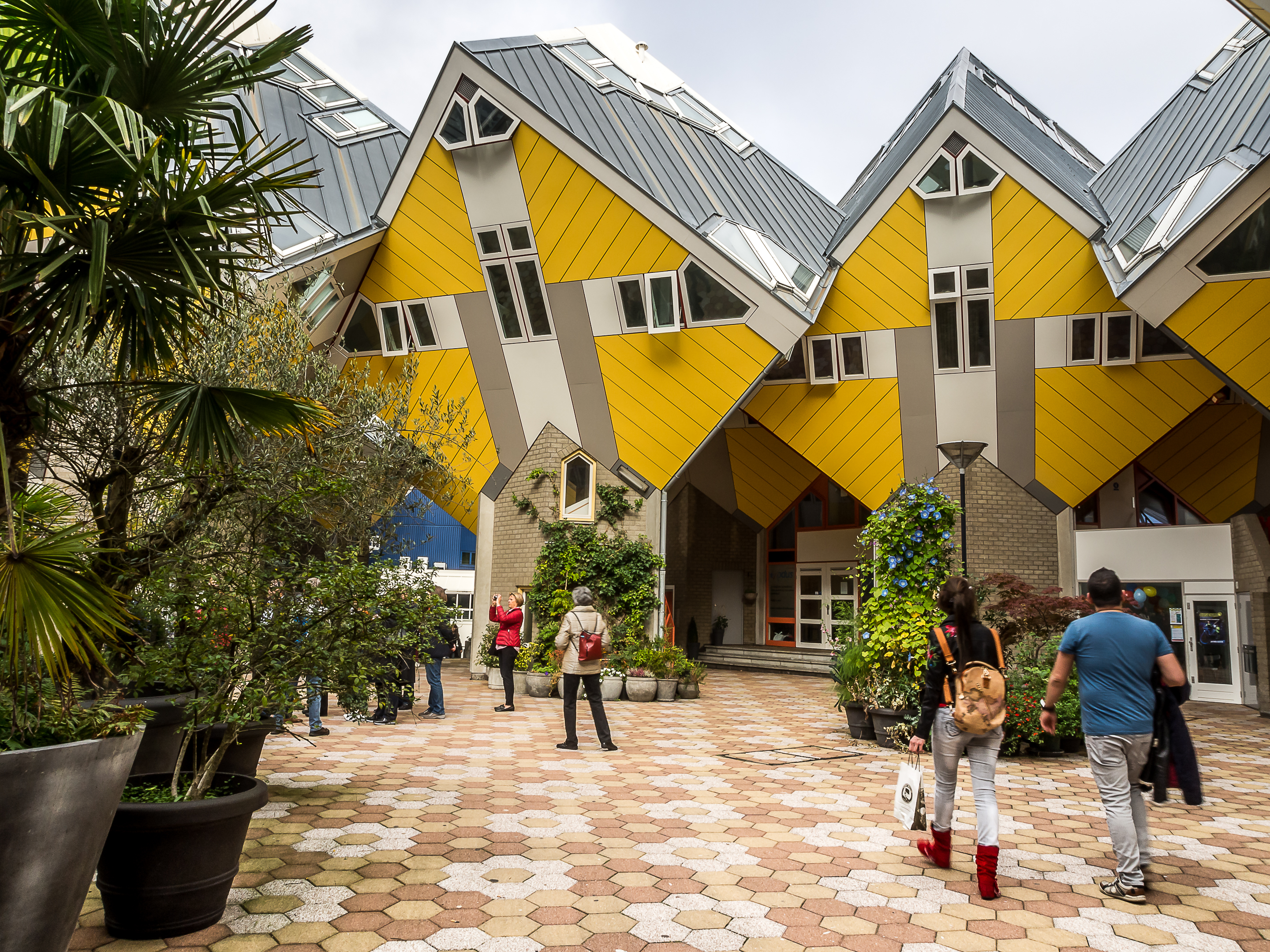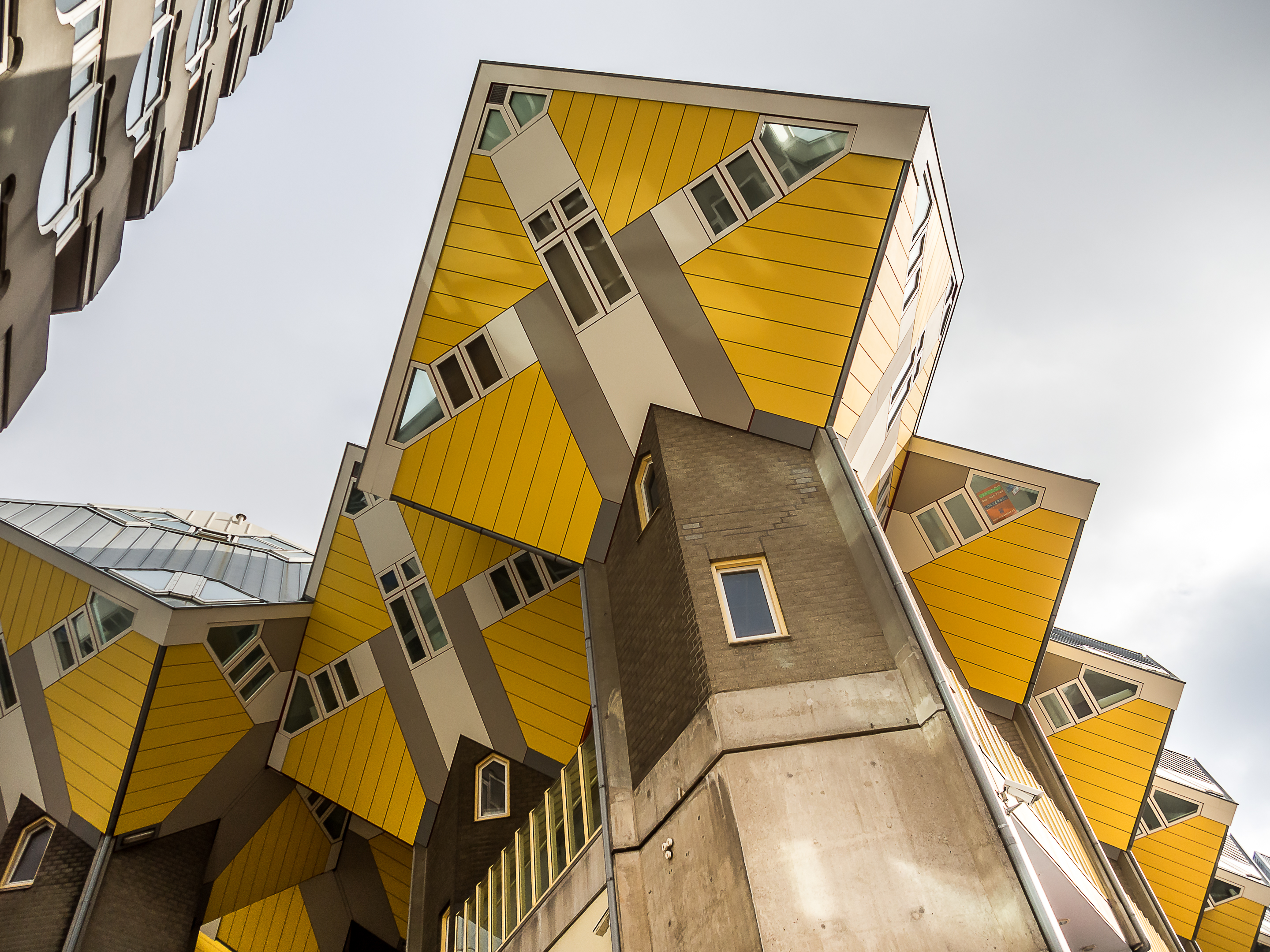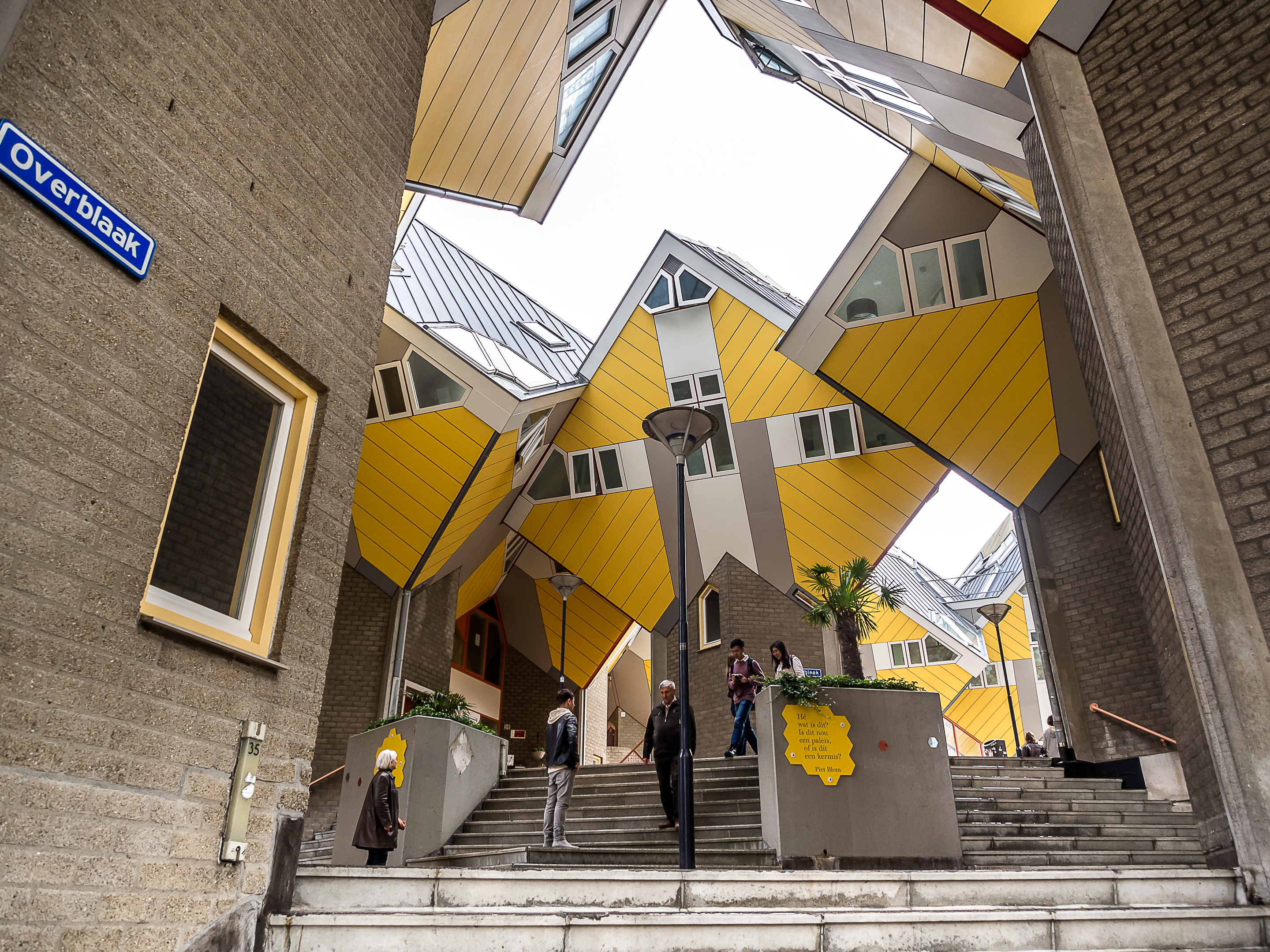 Nous sommes dans le quartier de Blaak et c’est justement ici que se trouvent les logements urbains parmi les plus insolites d’Europe : les maisons cubiques (Kubuswoningen en néerlandais).