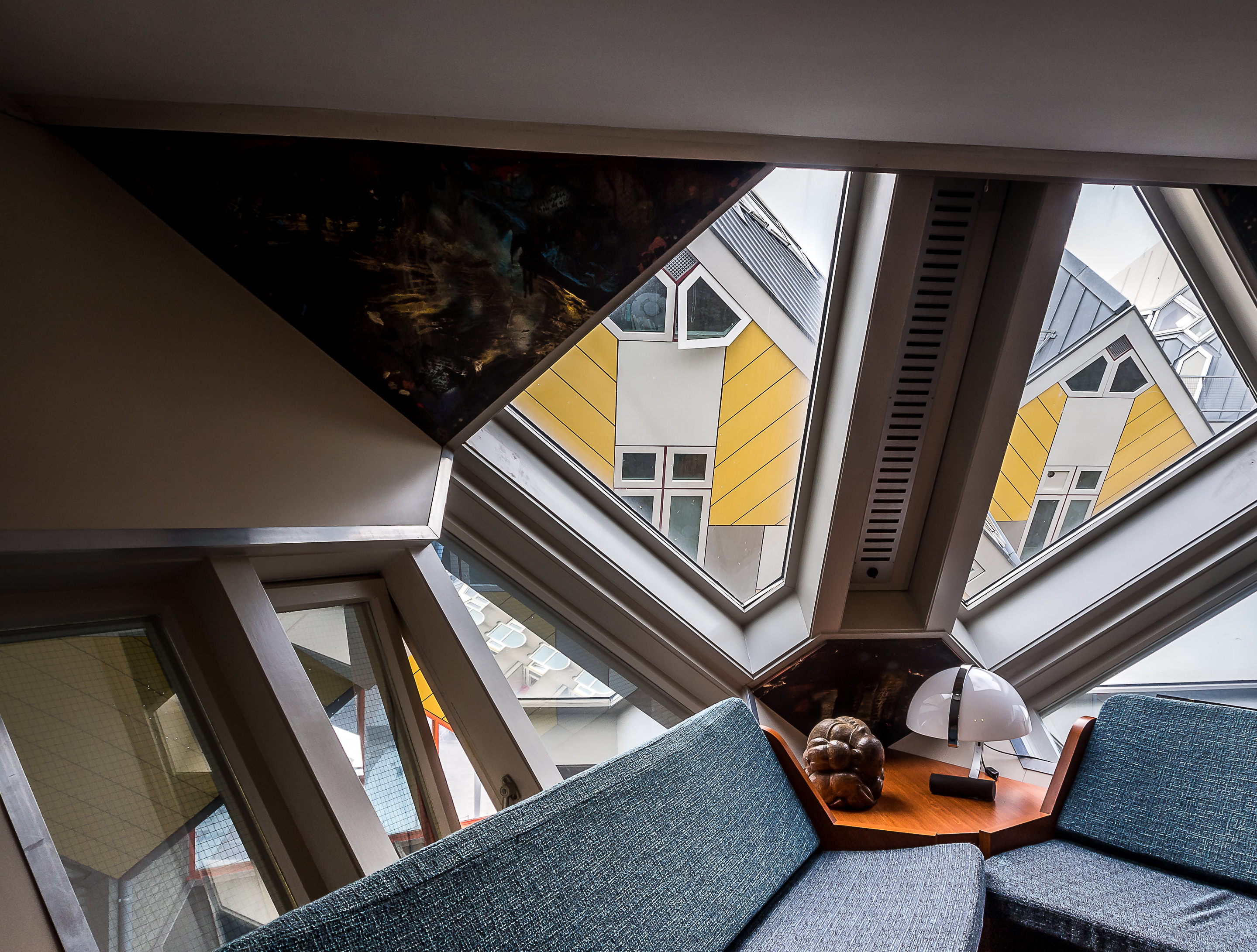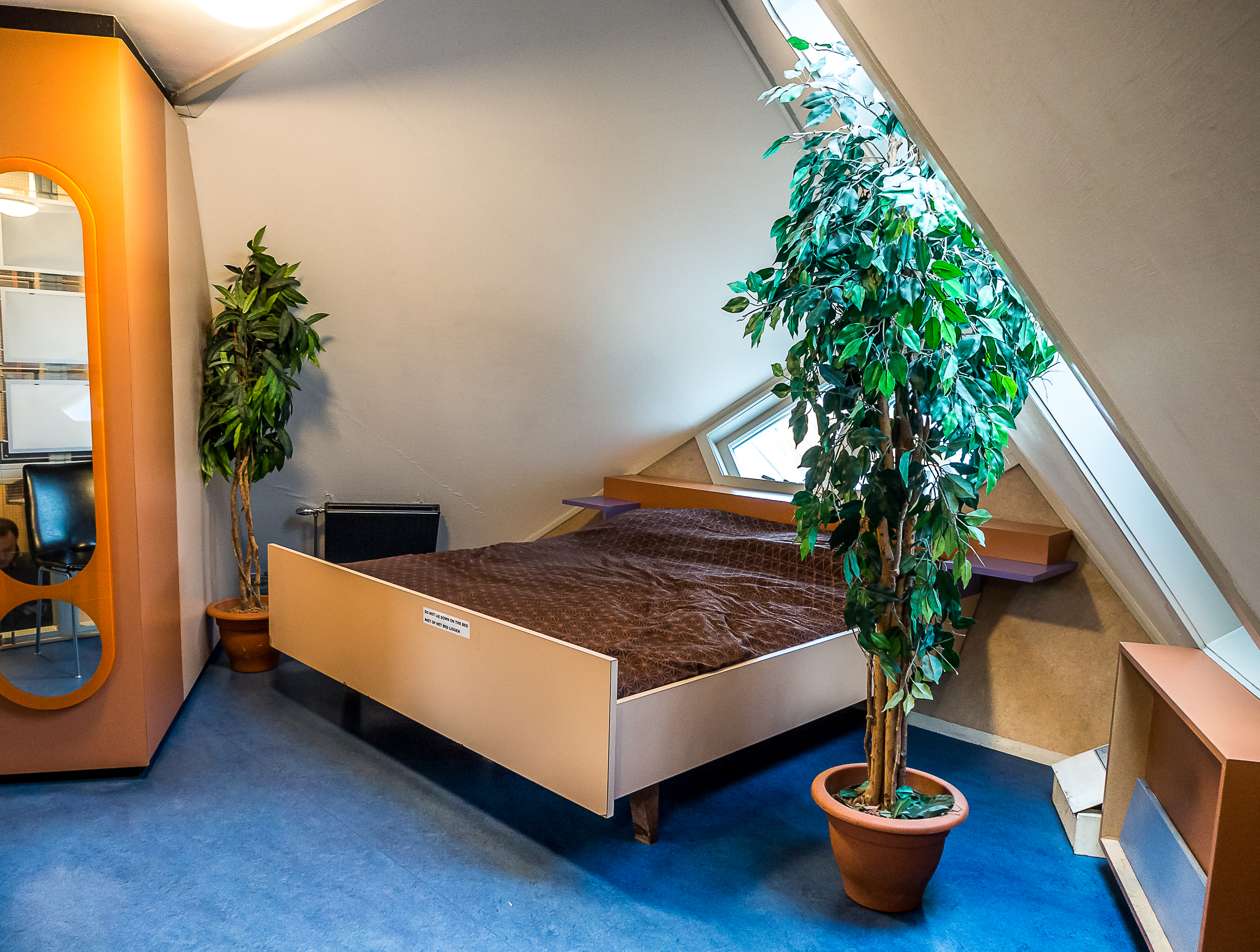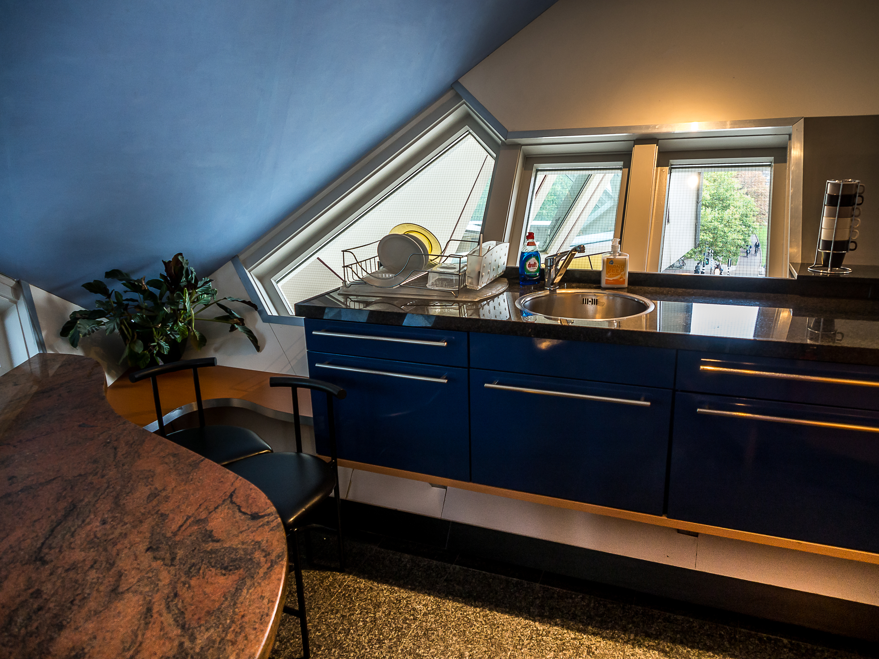 Et dès que l’on entre, on réalise au cas où on ne l’aurait pas deviné depuis l’extérieur, que vivre dans une maison cubique comporte quelques challenges : premièrement, grimper les raides escaliers à l’intérieur du pylône qui mène à l’habitation. Et non, il n’y a pas d’ascenseur pour les PMR ! Ensuite, il faut imaginer qua dans ces habitations, les murs sont inclinés à 45 degrés, ce qui vous donne une idée du défi que ça peut poser en matière d’ameublement et de rangement ! C’est plutôt comique mais vivre dans une maison aussi cool est à ce prix ! Chaque maison comporte 3 étages qui s’articulent autour d’un axe central. Tous les espaces sont donc ouverts et on peut y circuler librement sans portes : le premier, qui comprend le salon et la cuisine. Le deuxième est celui où se logent la chambre, salle de bain et le bureau et au sommet du cube (attention à la tête, il ne faut pas être grand, ce qui est drôle vu la taille moyenne des Hollandais), on y trouve un petit espace qui peut servir au choix de deuxième chambre, deuxième salon et de jardin d’hiver.