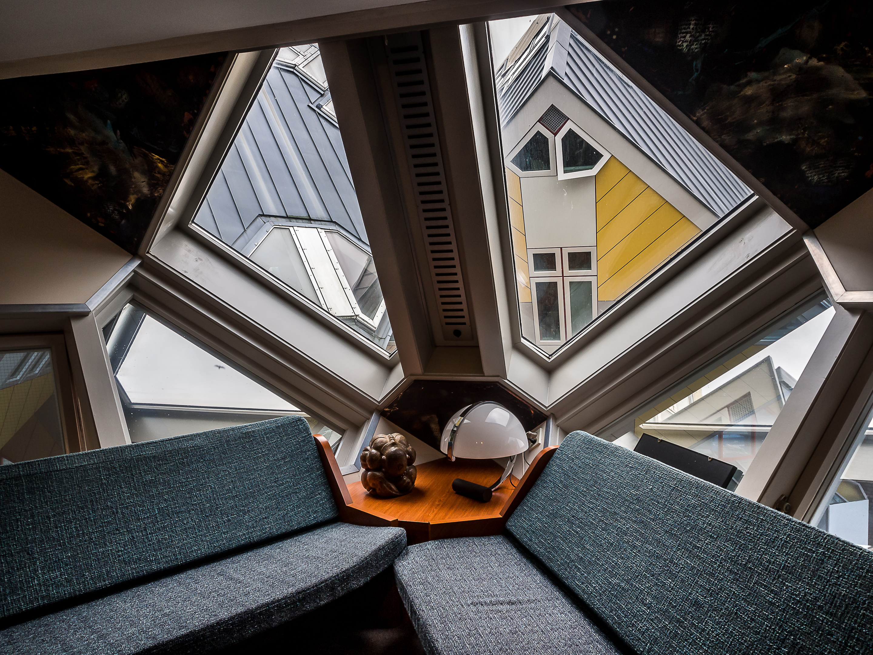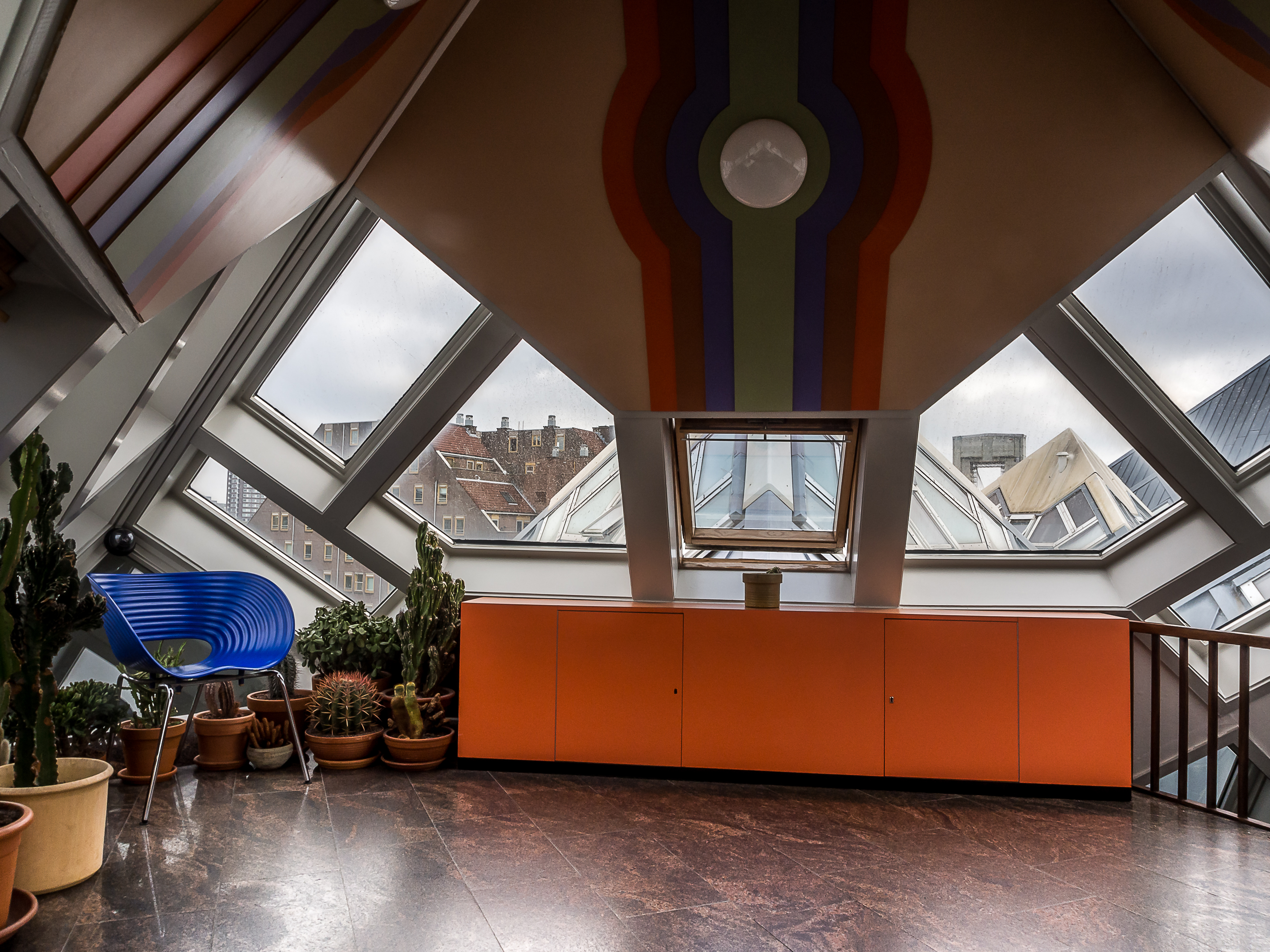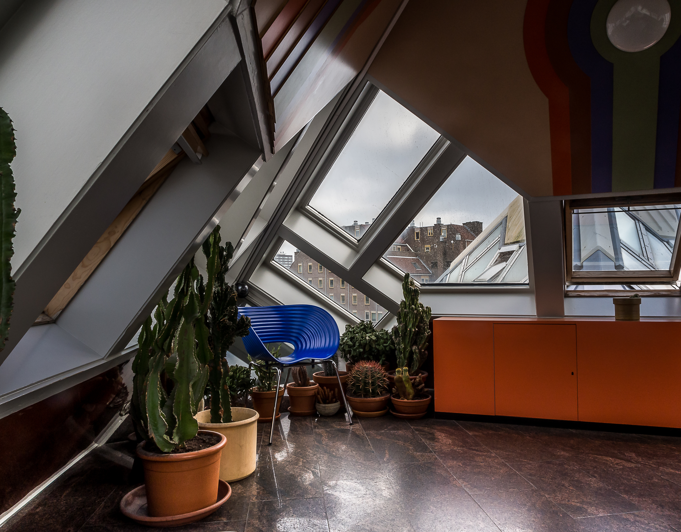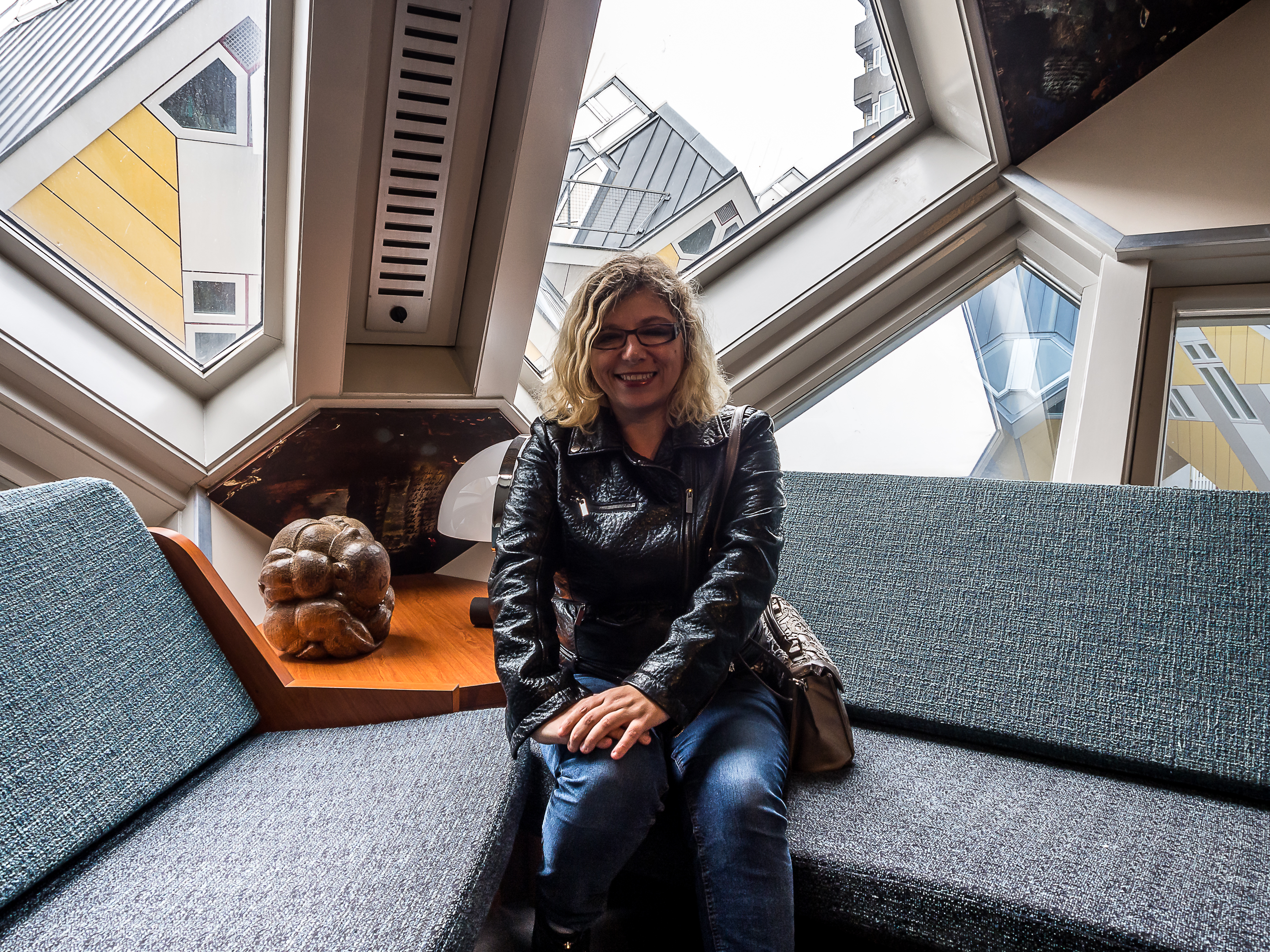 Et dès que l’on entre, on réalise au cas où on ne l’aurait pas deviné depuis l’extérieur, que vivre dans une maison cubique comporte quelques challenges : premièrement, grimper les raides escaliers à l’intérieur du pylône qui mène à l’habitation. Et non, il n’y a pas d’ascenseur pour les PMR ! Ensuite, il faut imaginer qua dans ces habitations, les murs sont inclinés à 45 degrés, ce qui vous donne une idée du défi que ça peut poser en matière d’ameublement et de rangement ! C’est plutôt comique mais vivre dans une maison aussi cool est à ce prix ! Chaque maison comporte 3 étages qui s’articulent autour d’un axe central. Tous les espaces sont donc ouverts et on peut y circuler librement sans portes : le premier, qui comprend le salon et la cuisine. Le deuxième est celui où se logent la chambre, salle de bain et le bureau et au sommet du cube (attention à la tête, il ne faut pas être grand, ce qui est drôle vu la taille moyenne des Hollandais), on y trouve un petit espace qui peut servir au choix de deuxième chambre, deuxième salon et de jardin d’hiver.