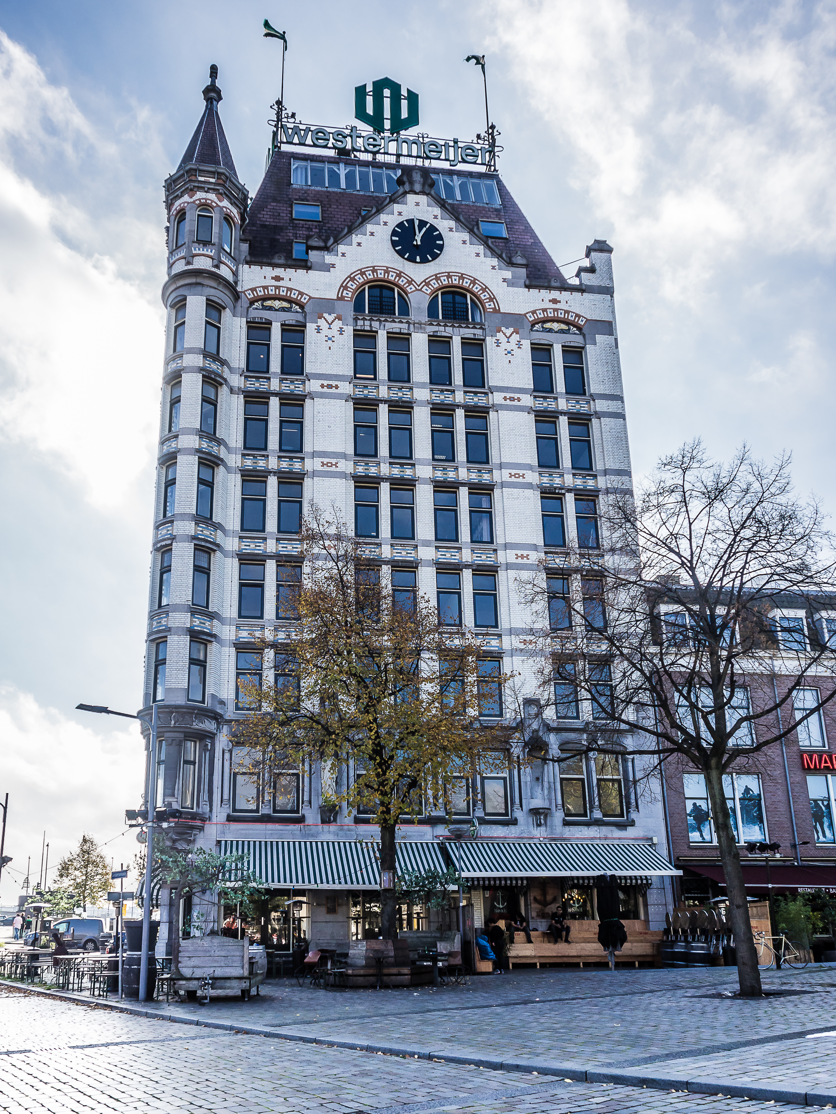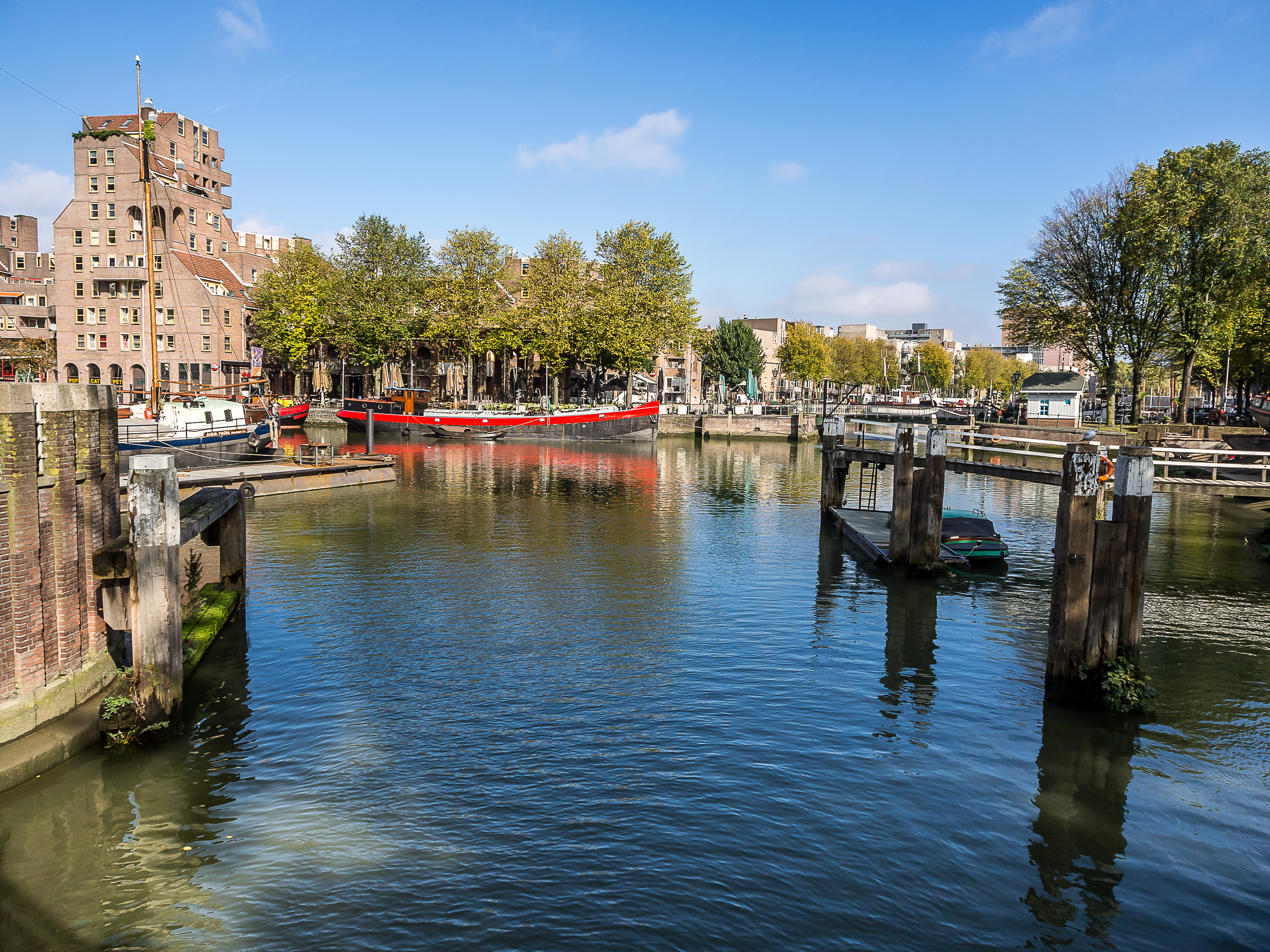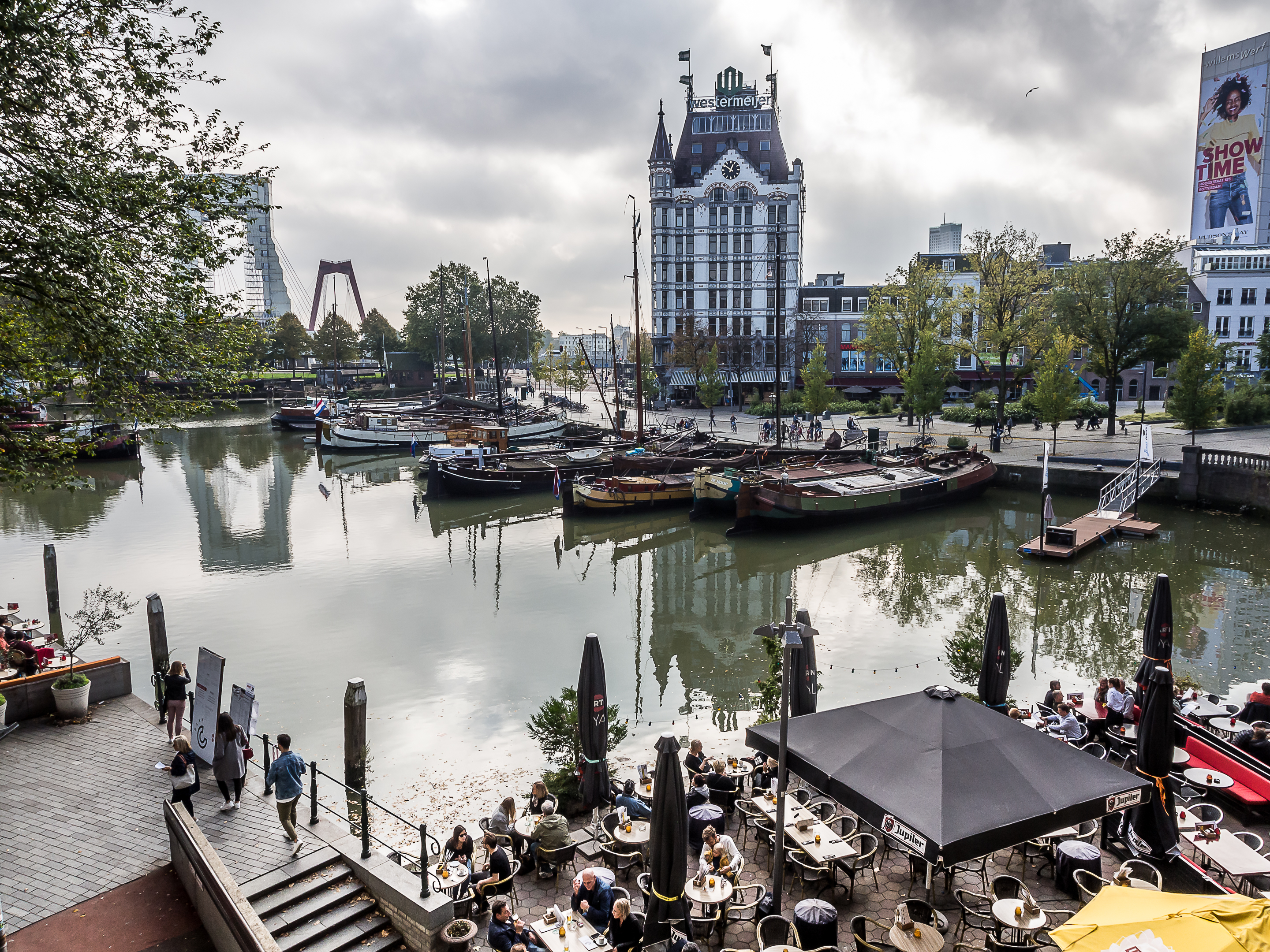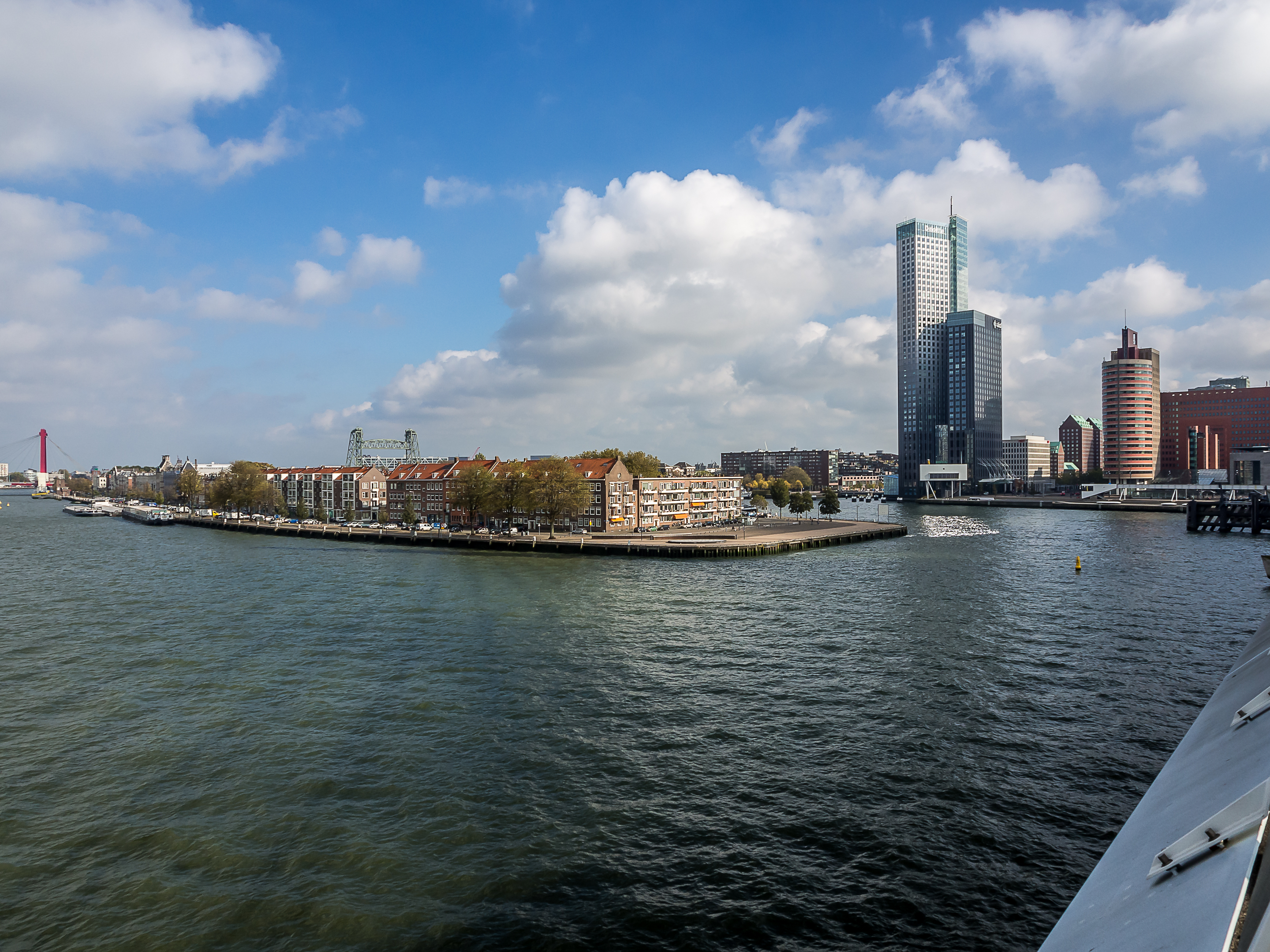 En sortant directement de la forêt de maisons cubiques, on arrive au vieux port, tout bordé de cafés et de restaurants qui sont joliment posés sur les quais. Il doit être bien agréable de prendre un petit café-advocaat en regardant les bateaux et les péniches. Si on continue en direction du Wijnhaven, on tombe nez-à-nez avec une autre survivante des bombardements : la Witte Huis (la maison blanche), le tout premier « gratte-ciel » de Rotterdam. Datant de la toute fin du XIXème siècle, la maison au style Art Nouveau se tient fièrement près des quais. A l’époque de sa construction, elle était un petit exploit d’architecture et d’ingénierie : il fallut créer 1000 pilotis pour pouvoir soutenir son poids dans le terrain meuble de bord de port. Je continue ma promenade en traversant le Regentessenbrug (pont de la Régente) pour arriver à la Nouvelle Meuse, un bras du delta commun du Rhin et de la Meuse.