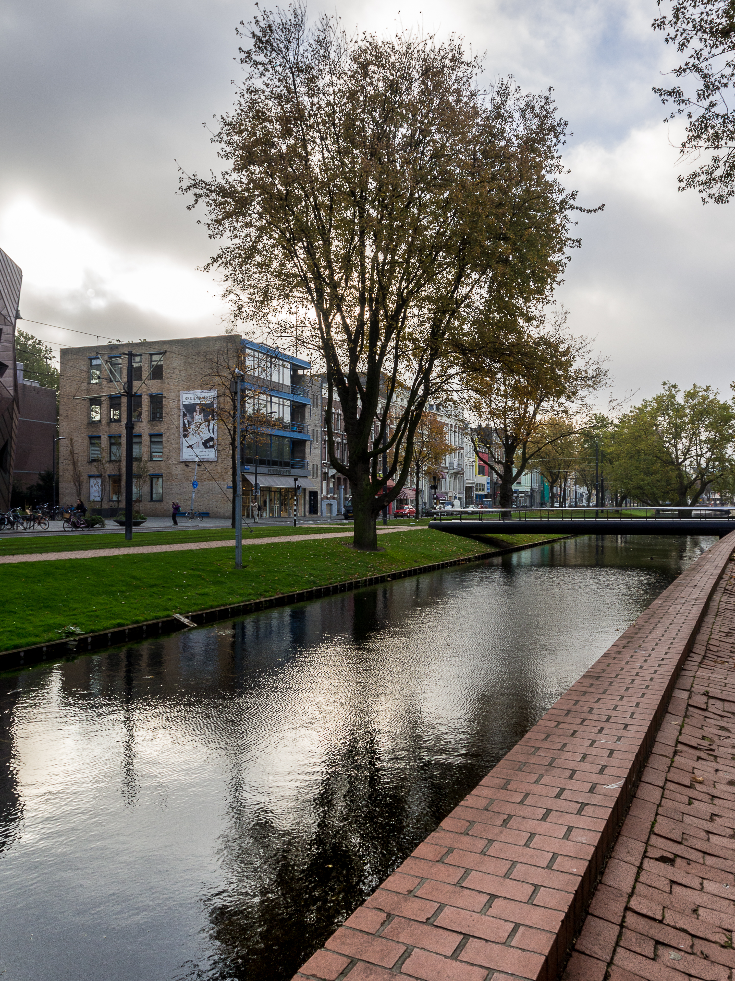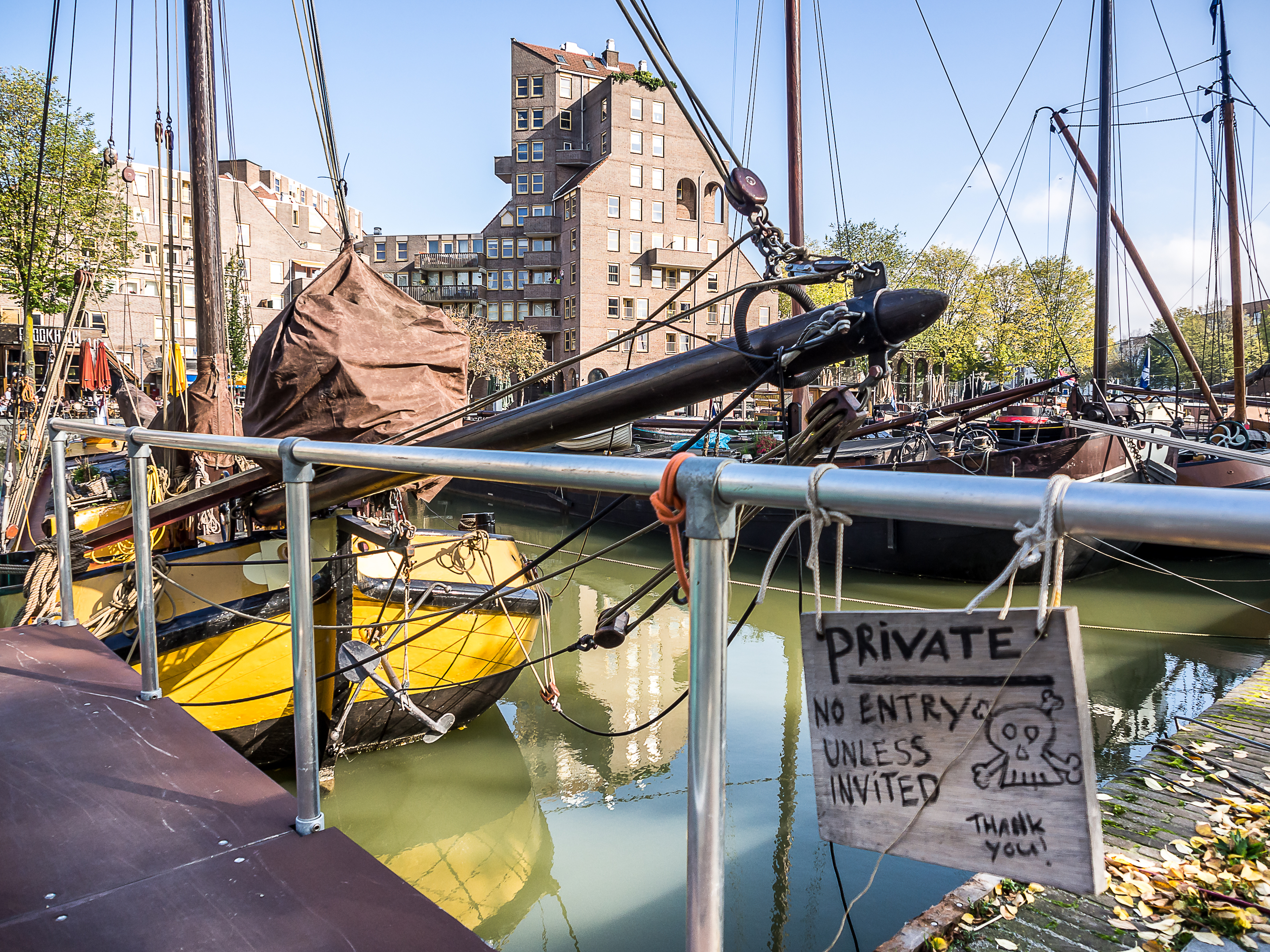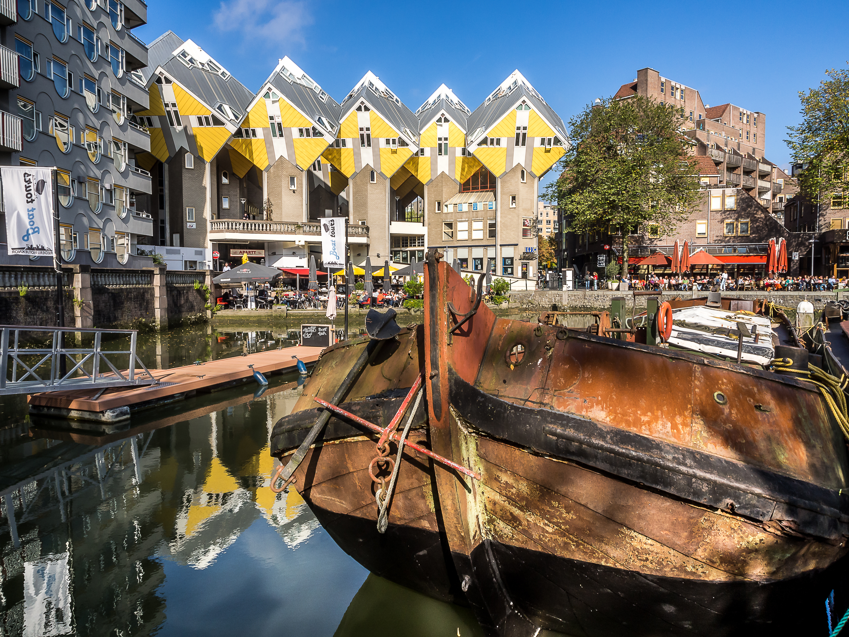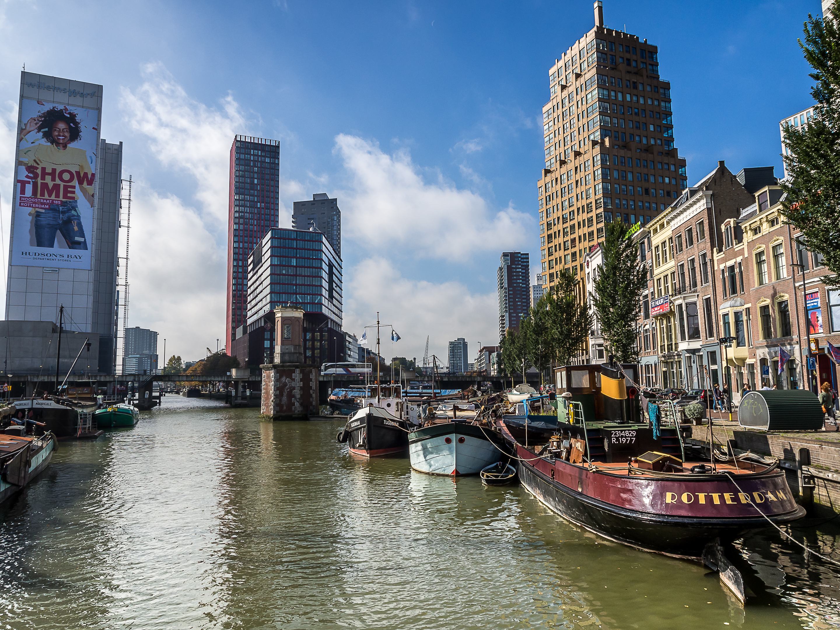 En sortant directement de la forêt de maisons cubiques, on arrive au vieux port, tout bordé de cafés et de restaurants qui sont joliment posés sur les quais. Il doit être bien agréable de prendre un petit café-advocaat en regardant les bateaux et les péniches. Si on continue en direction du Wijnhaven, on tombe nez-à-nez avec une autre survivante des bombardements : la Witte Huis (la maison blanche), le tout premier « gratte-ciel » de Rotterdam. Datant de la toute fin du XIXème siècle, la maison au style Art Nouveau se tient fièrement près des quais. A l’époque de sa construction, elle était un petit exploit d’architecture et d’ingénierie : il fallut créer 1000 pilotis pour pouvoir soutenir son poids dans le terrain meuble de bord de port. Je continue ma promenade en traversant le Regentessenbrug (pont de la Régente) pour arriver à la Nouvelle Meuse, un bras du delta commun du Rhin et de la Meuse.