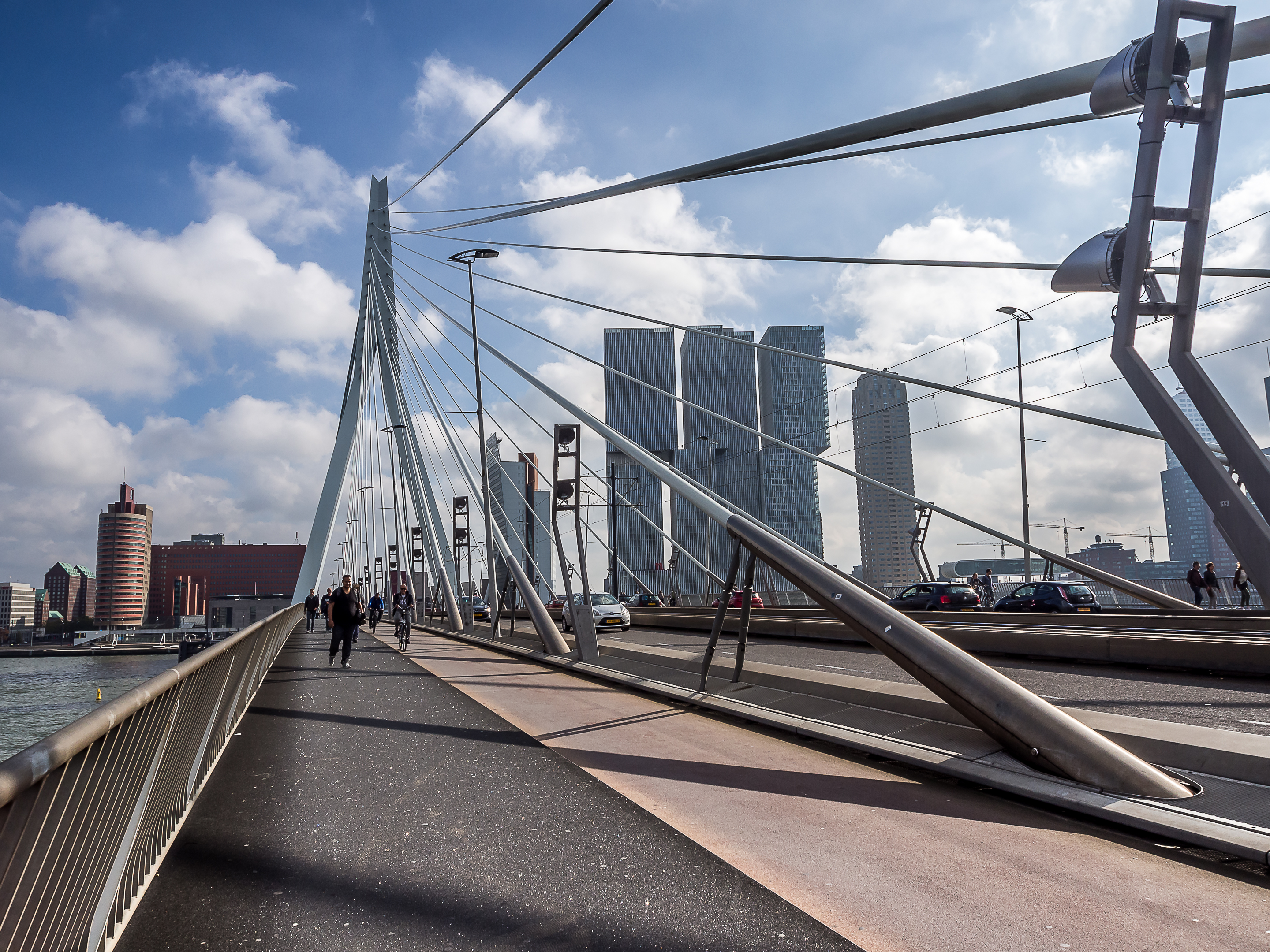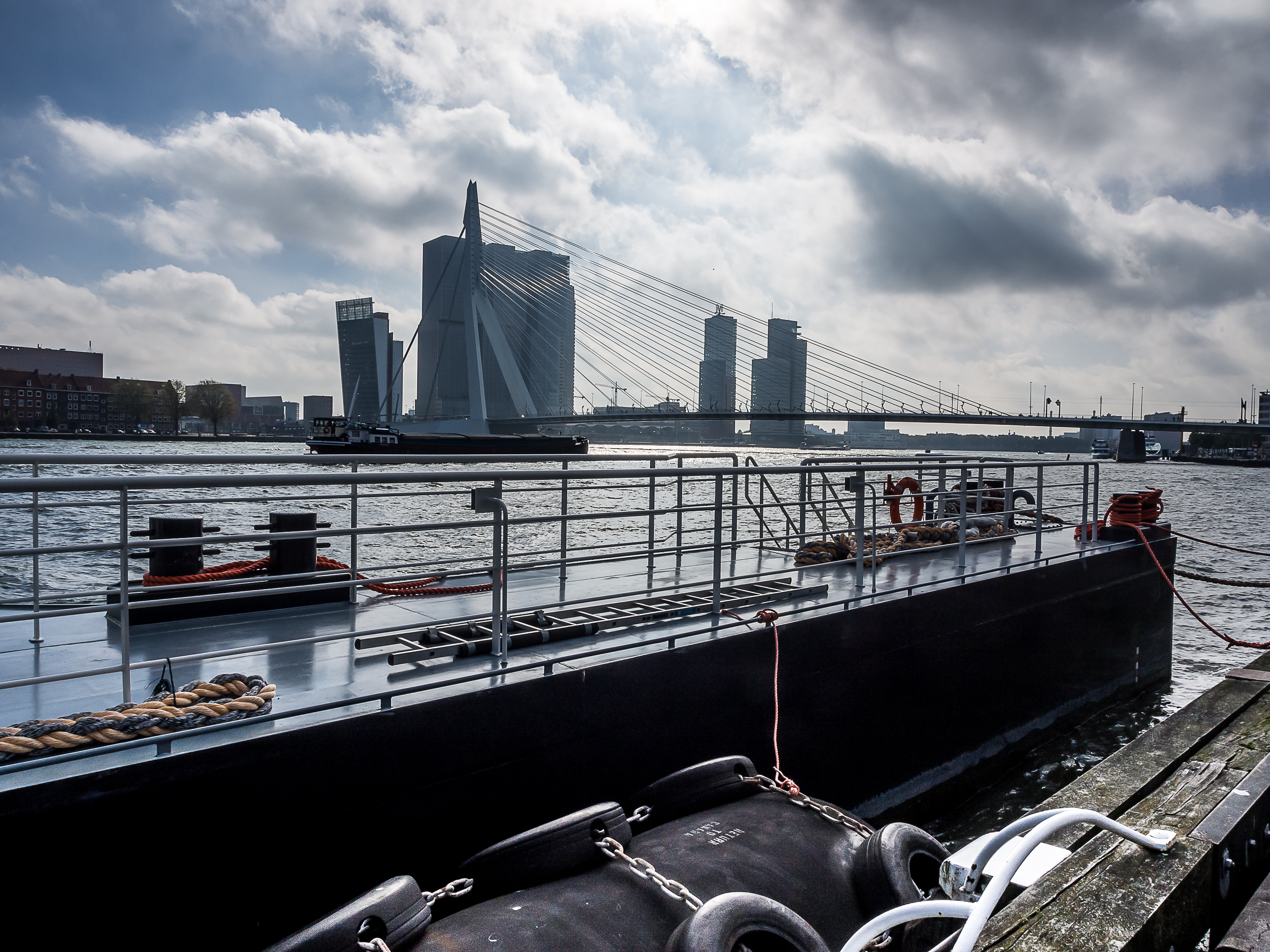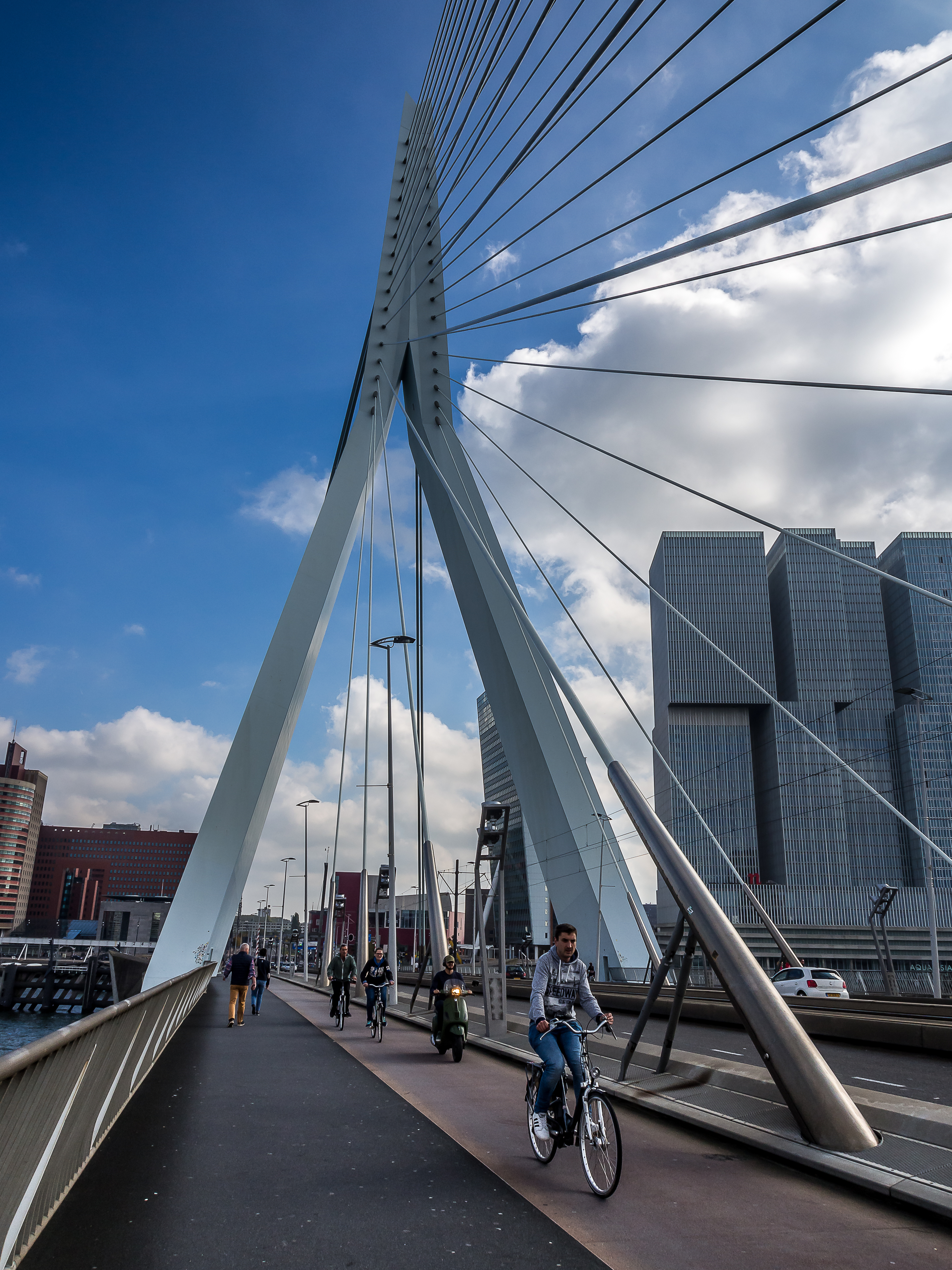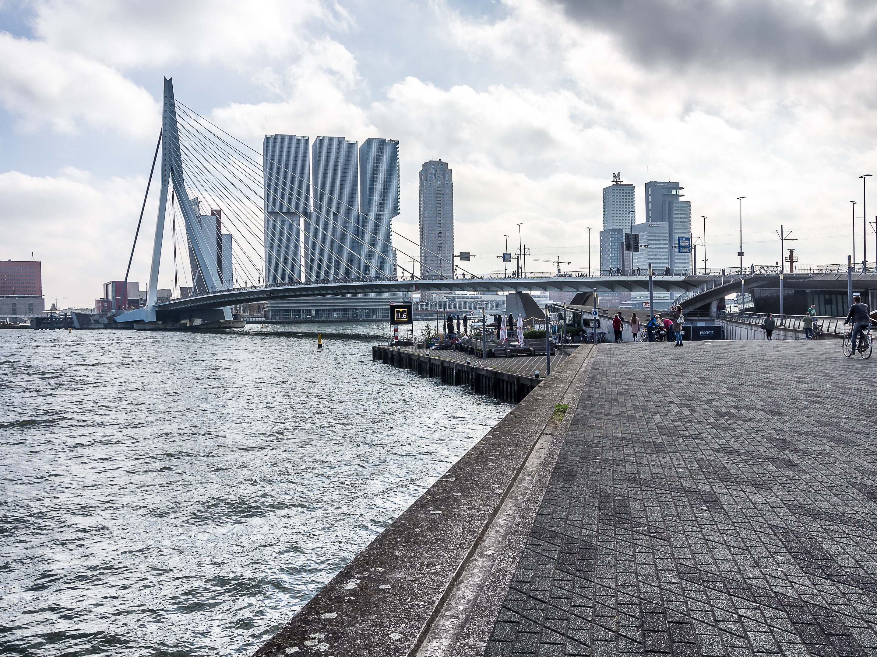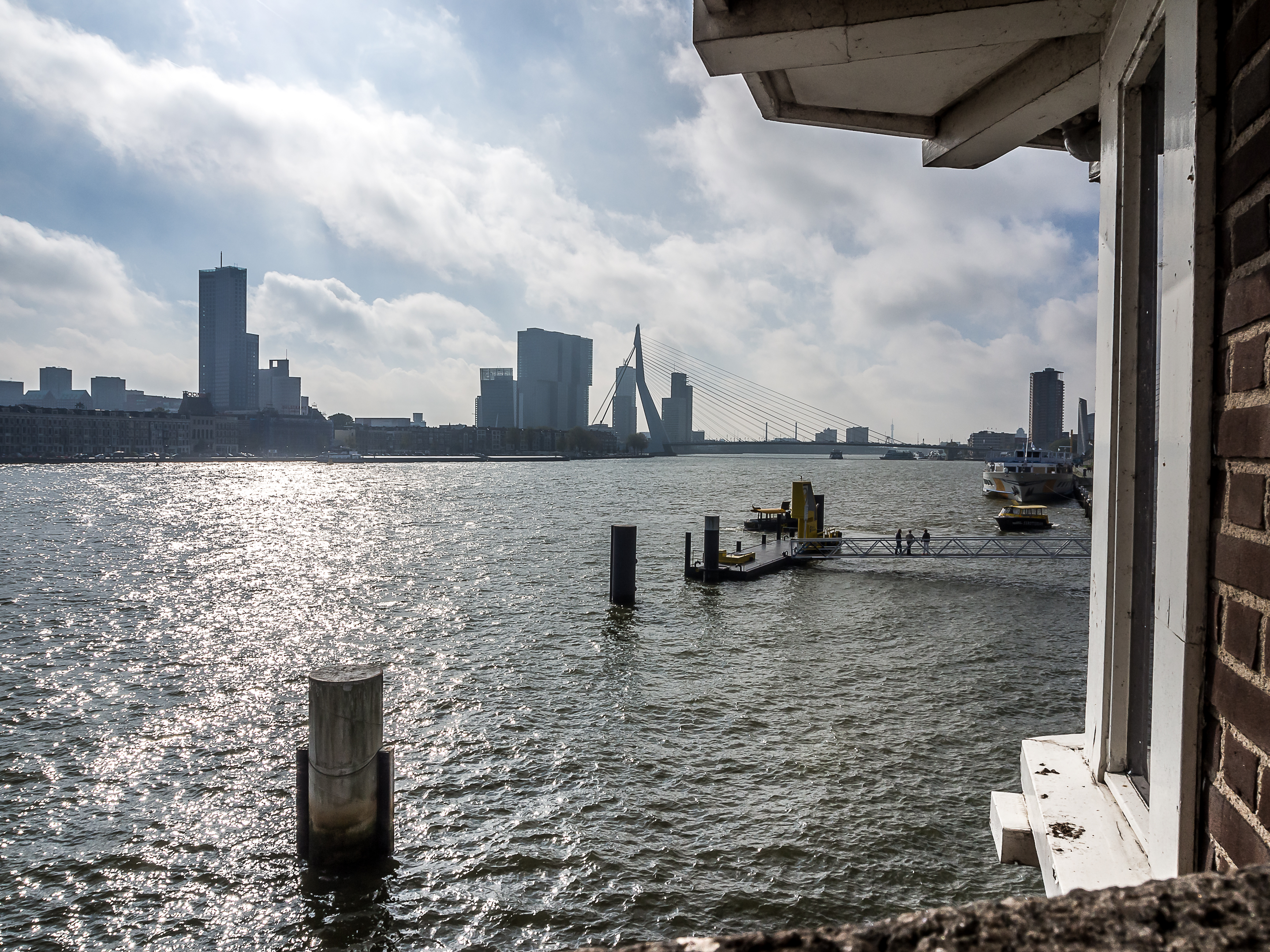 C’est ici qu’enfin, que je touche du pied ce qui fait Rotterdam et toute sa richesse : sa position aux embouchures de grands fleuves importants et son port sur la Mer du Nord. Le bras de mer est large et brille sous le soleil. Il y a comme un petit air de bords de mer avec le vent qui souffle, les mouettes qui se laissent porter le vent, les bateaux, les bateaux-taxis et péniches qui passent… A l’horizon, se dresse ma troisième étape : l’Erasmusbrug, le pont Erasme, du nom d’un des plus illustres citoyens de la ville : le grand humaniste qui a donné son nom à un certain programme d’échange étudiant. Ce pont construit dans les années 90 a vite été adopté comme une des icônes de la ville : tout blanc et léger, la forme de son pylône principal lui a donné son surnom de « cygne », avec son long coup qui se recourbe vers le haut. C’est aussi un haut lieu de promenade et la flâneuse que je suis doit éviter les joggeurs (heureusement, comme partout ailleurs au Pays-Bas les cyclistes ont leurs propres voies).