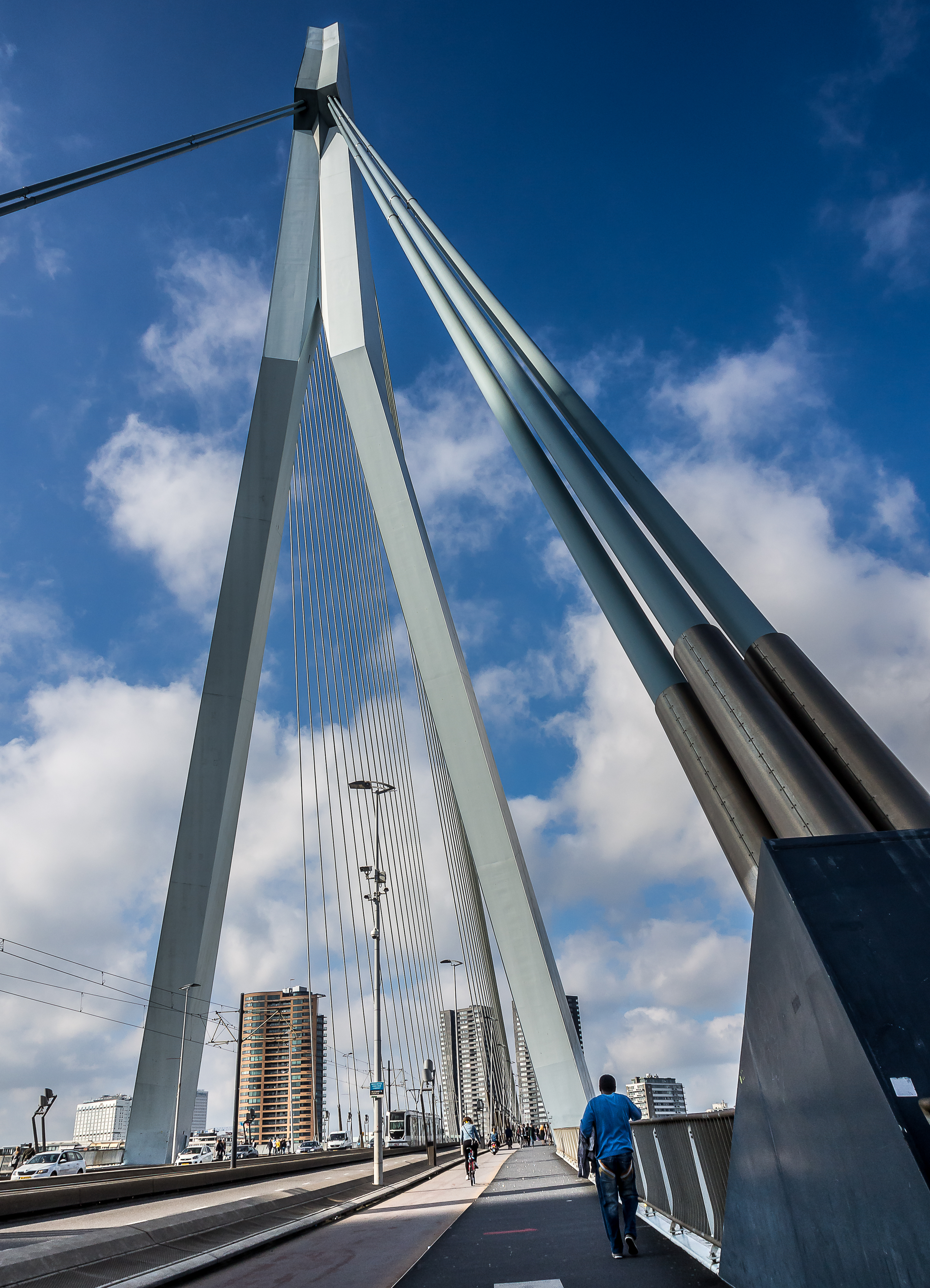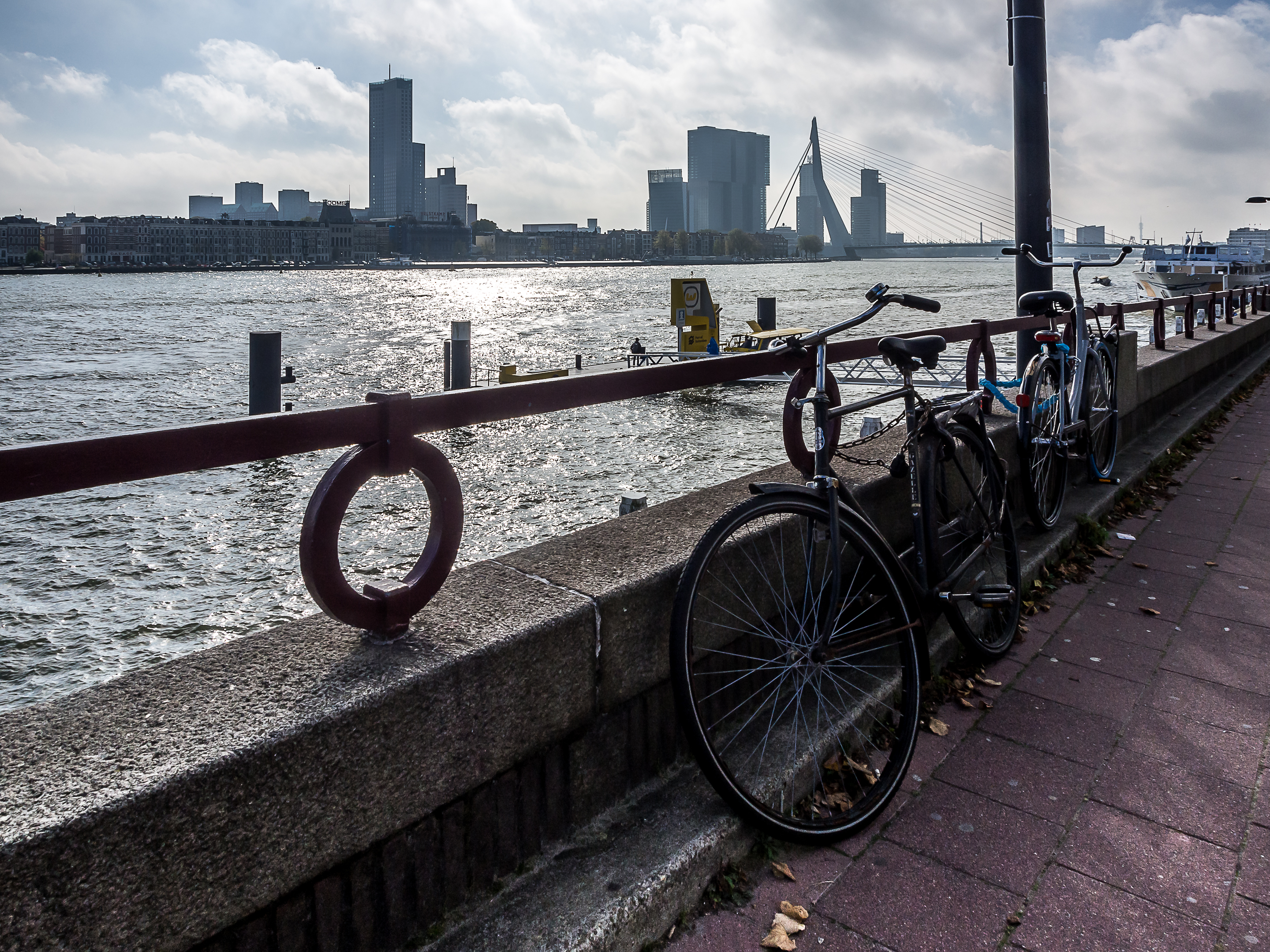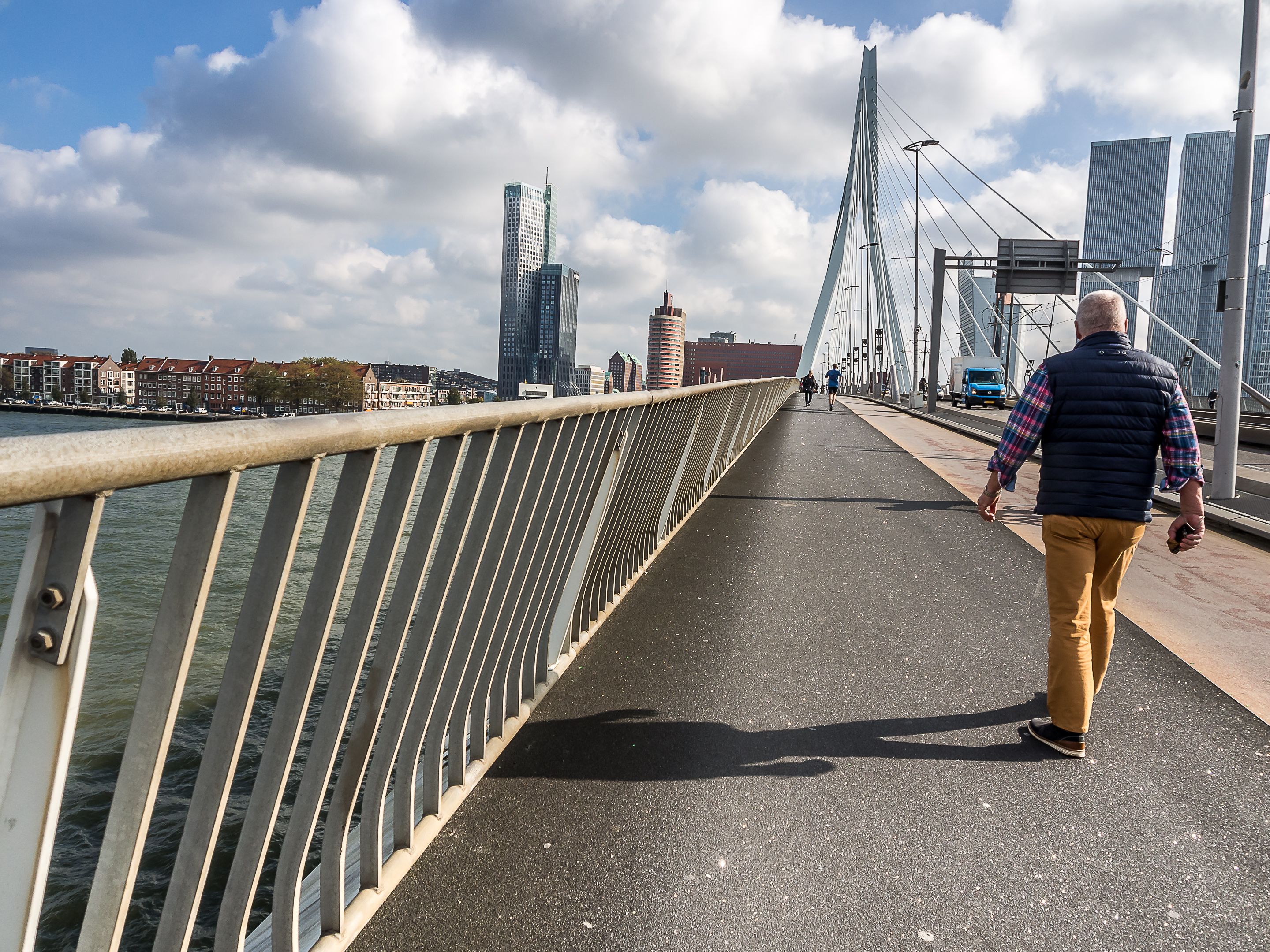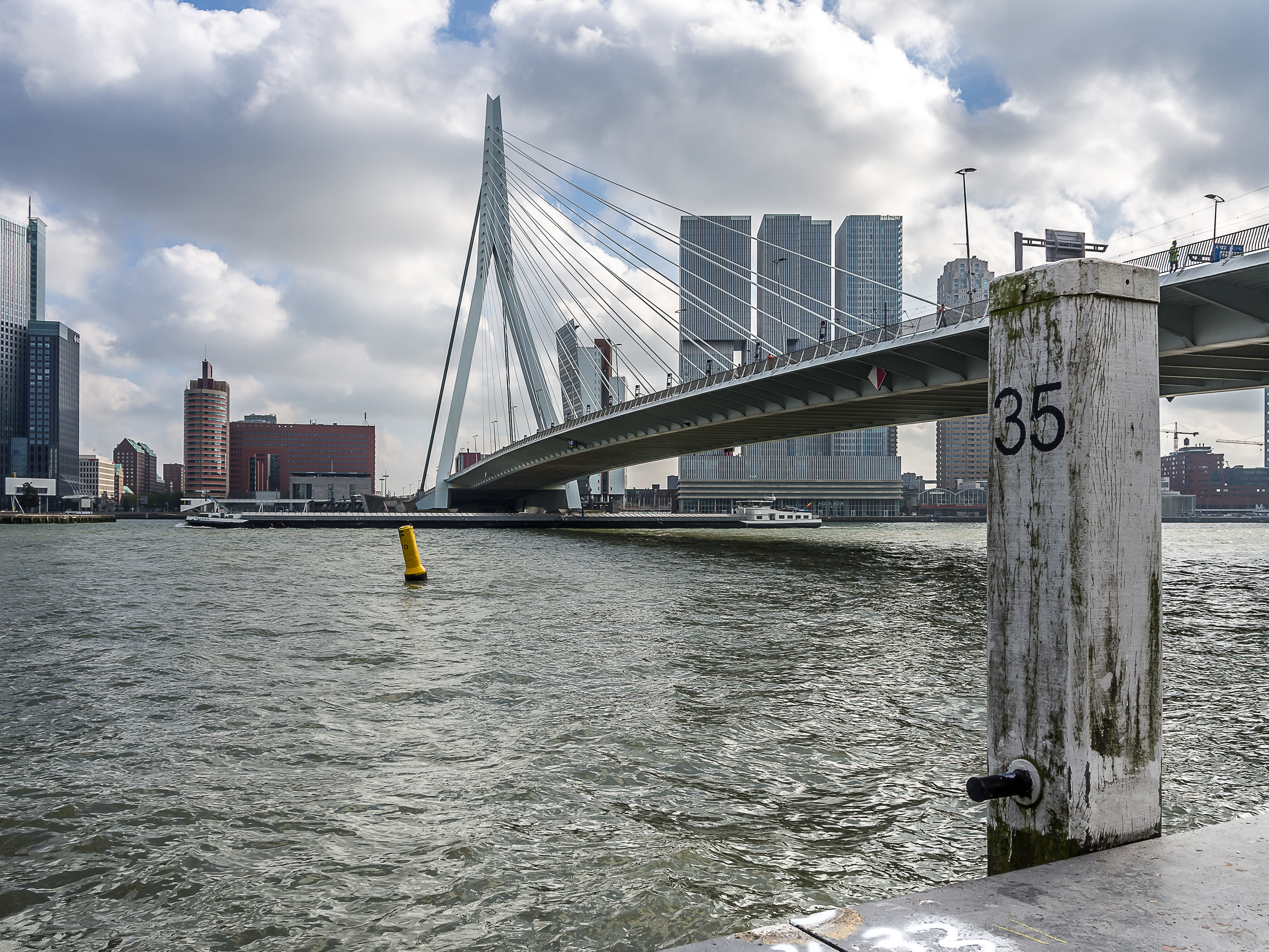 C’est ici qu’enfin, que je touche du pied ce qui fait Rotterdam et toute sa richesse : sa position aux embouchures de grands fleuves importants et son port sur la Mer du Nord. Le bras de mer est large et brille sous le soleil. Il y a comme un petit air de bords de mer avec le vent qui souffle, les mouettes qui se laissent porter le vent, les bateaux, les bateaux-taxis et péniches qui passent… A l’horizon, se dresse ma troisième étape : l’Erasmusbrug, le pont Erasme, du nom d’un des plus illustres citoyens de la ville : le grand humaniste qui a donné son nom à un certain programme d’échange étudiant. Ce pont construit dans les années 90 a vite été adopté comme une des icônes de la ville : tout blanc et léger, la forme de son pylône principal lui a donné son surnom de « cygne », avec son long coup qui se recourbe vers le haut. C’est aussi un haut lieu de promenade et la flâneuse que je suis doit éviter les joggeurs (heureusement, comme partout ailleurs au Pays-Bas les cyclistes ont leurs propres voies).