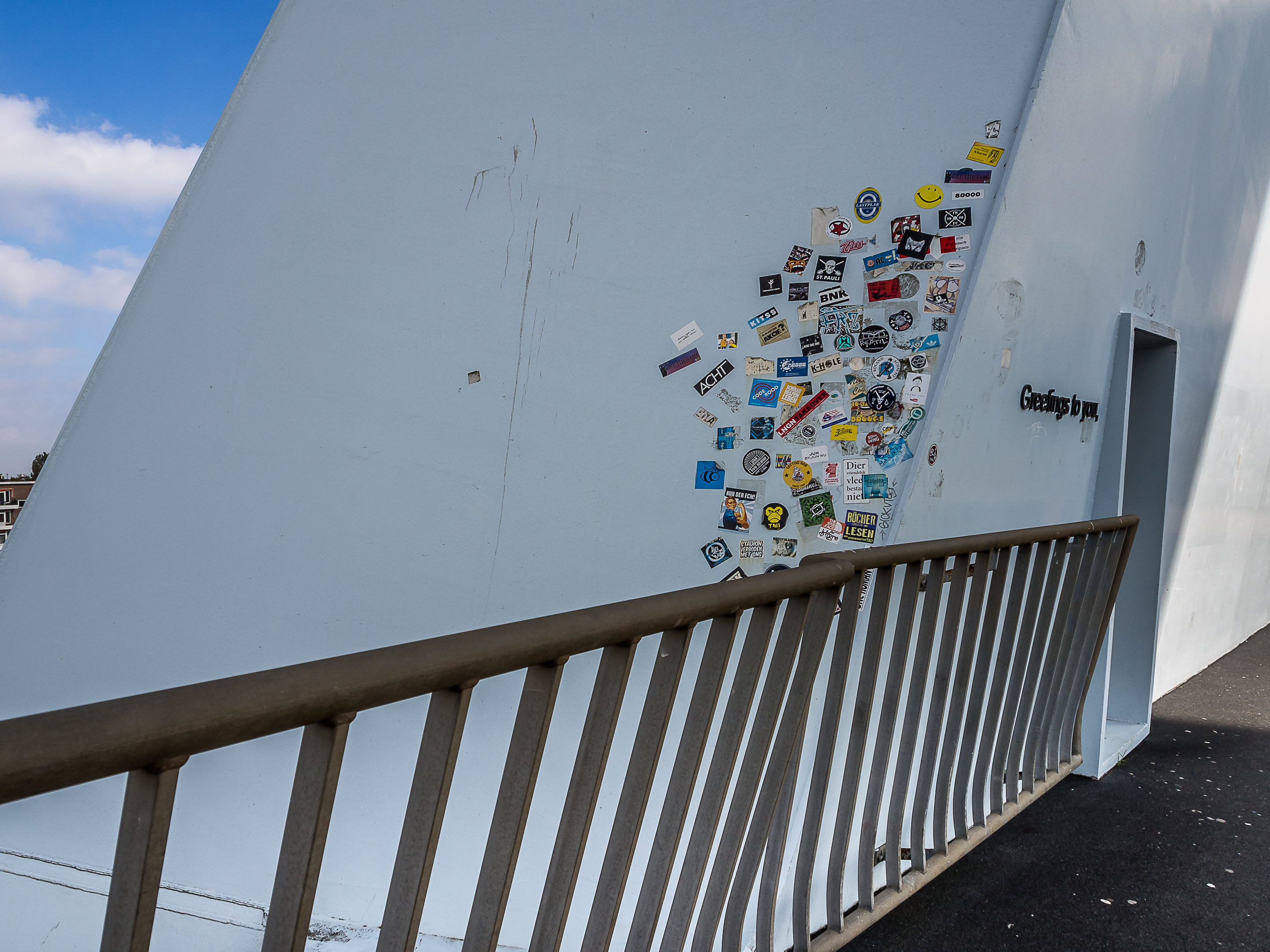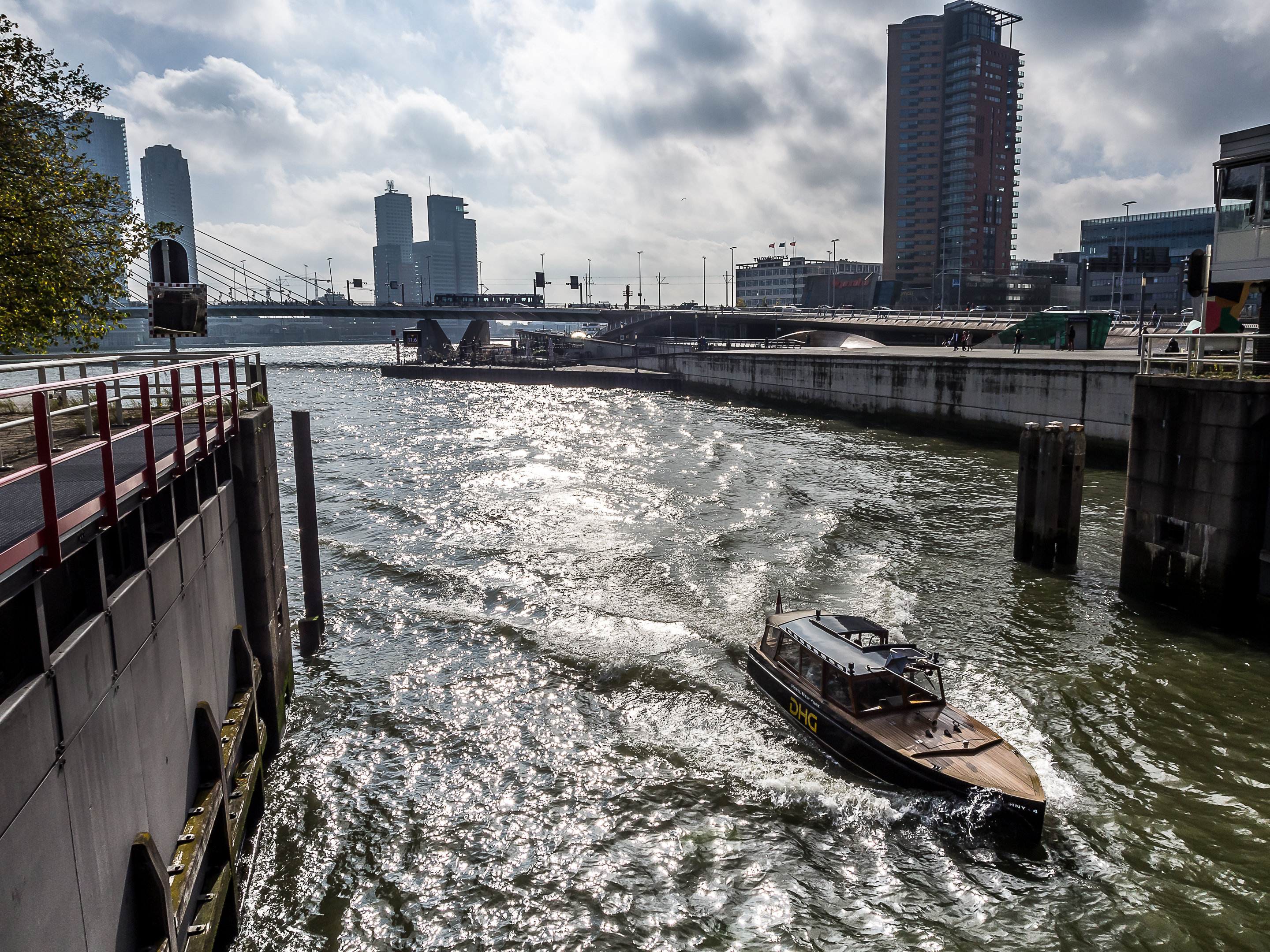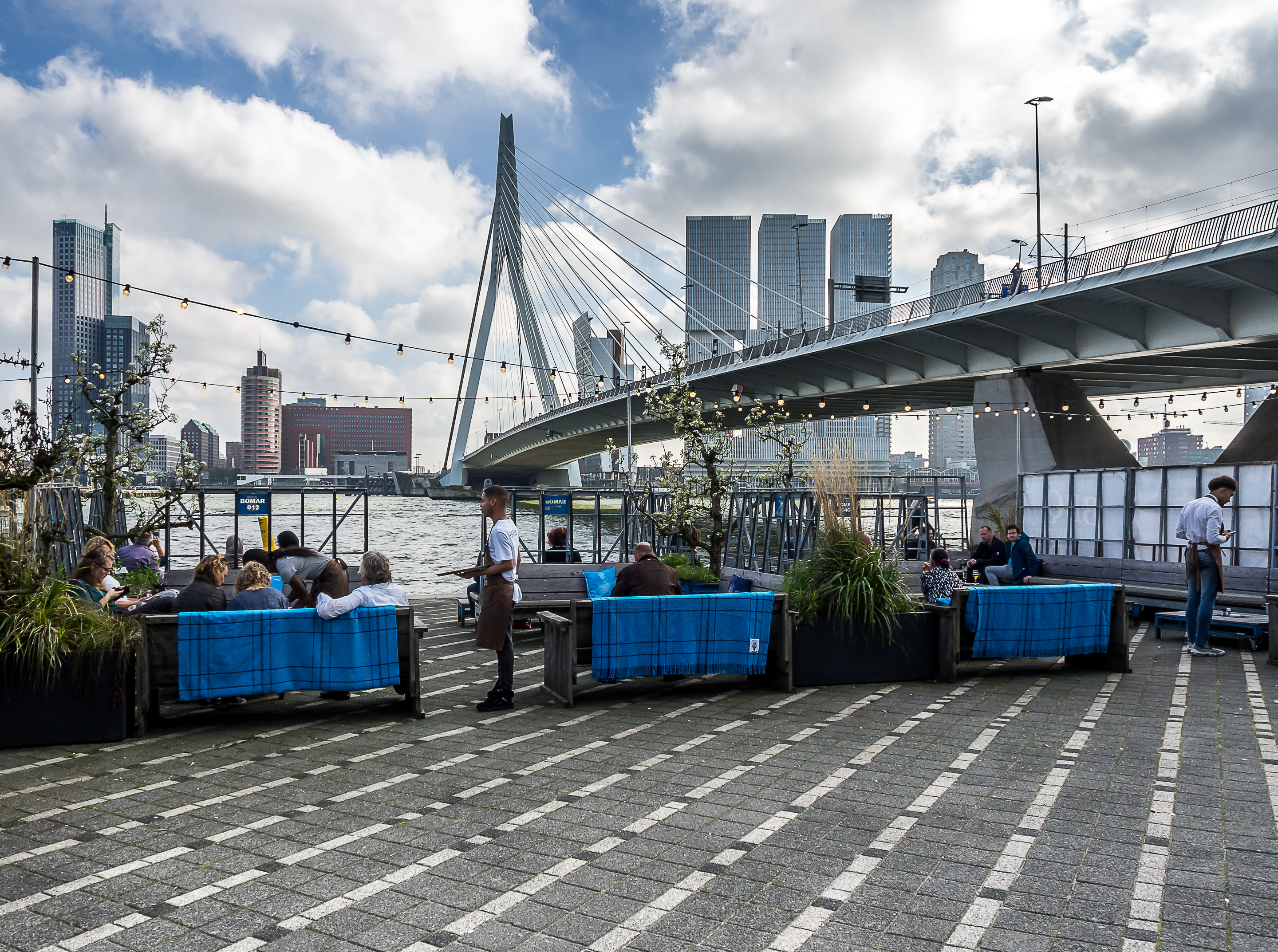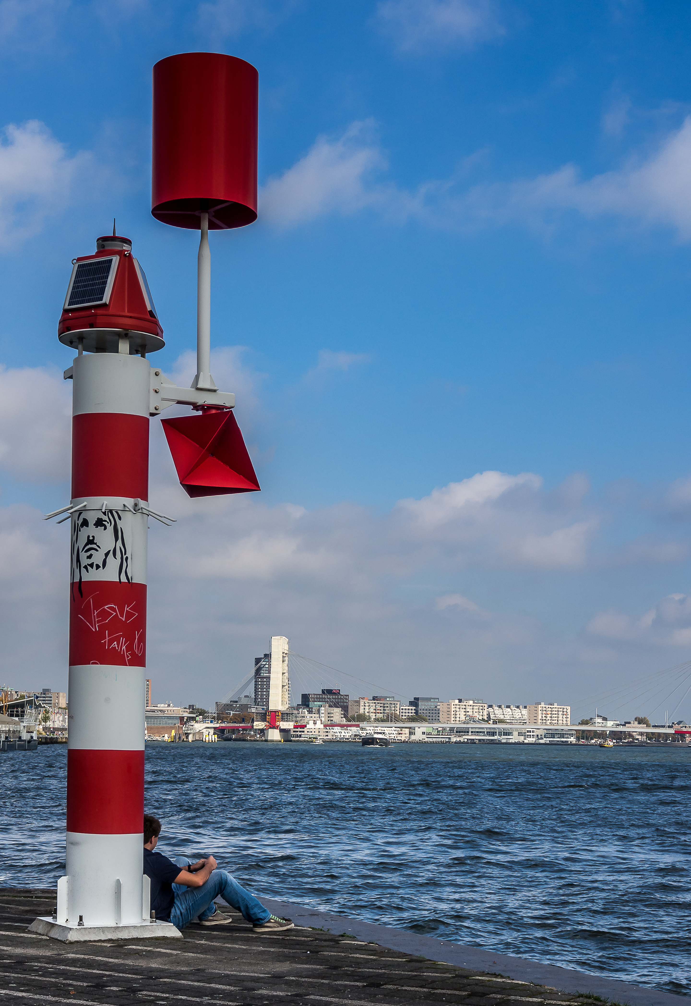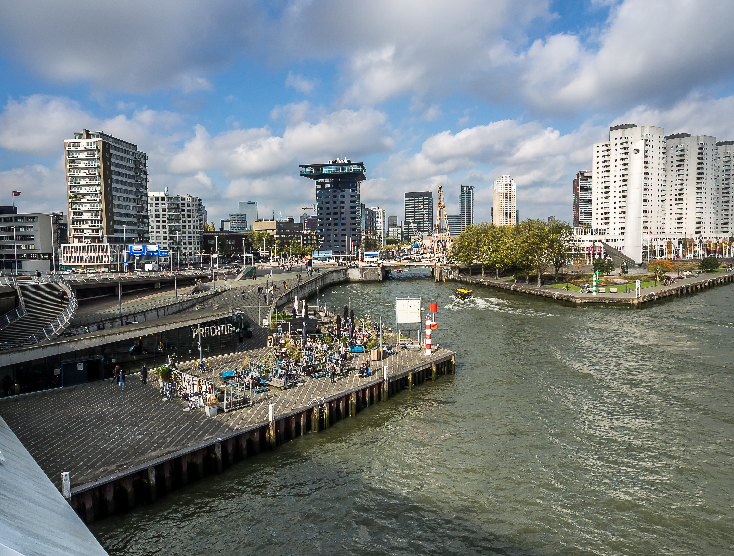 C’est ici qu’enfin, que je touche du pied ce qui fait Rotterdam et toute sa richesse : sa position aux embouchures de grands fleuves importants et son port sur la Mer du Nord. Le bras de mer est large et brille sous le soleil. Il y a comme un petit air de bords de mer avec le vent qui souffle, les mouettes qui se laissent porter le vent, les bateaux, les bateaux-taxis et péniches qui passent… A l’horizon, se dresse ma troisième étape : l’Erasmusbrug, le pont Erasme, du nom d’un des plus illustres citoyens de la ville : le grand humaniste qui a donné son nom à un certain programme d’échange étudiant. Ce pont construit dans les années 90 a vite été adopté comme une des icônes de la ville : tout blanc et léger, la forme de son pylône principal lui a donné son surnom de « cygne », avec son long coup qui se recourbe vers le haut. C’est aussi un haut lieu de promenade et la flâneuse que je suis doit éviter les joggeurs (heureusement, comme partout ailleurs au Pays-Bas les cyclistes ont leurs propres voies).