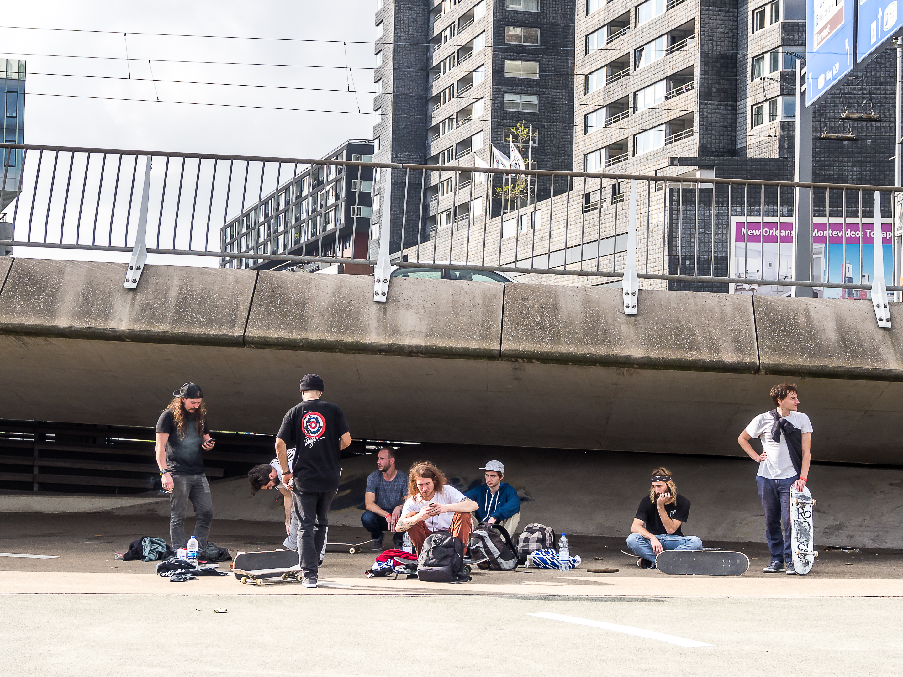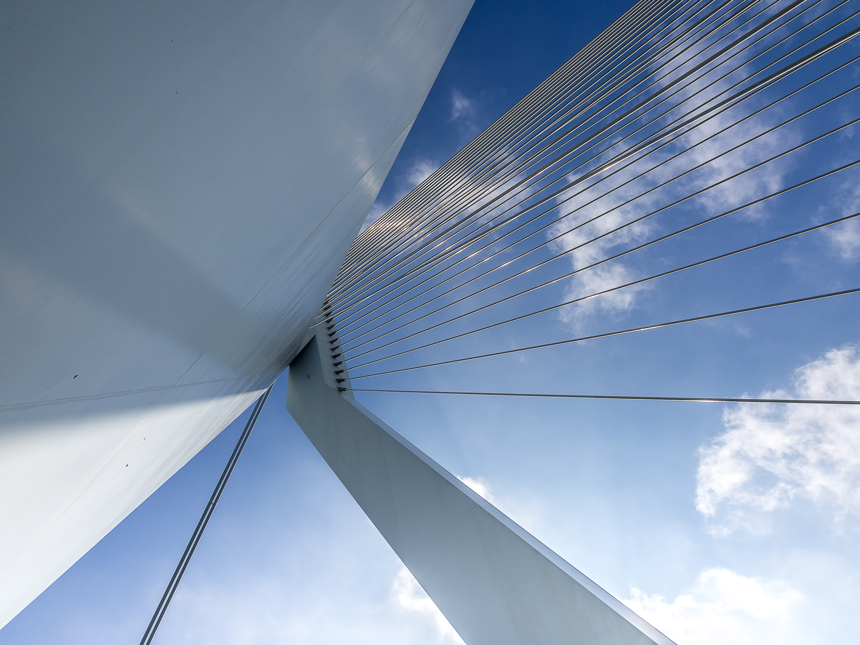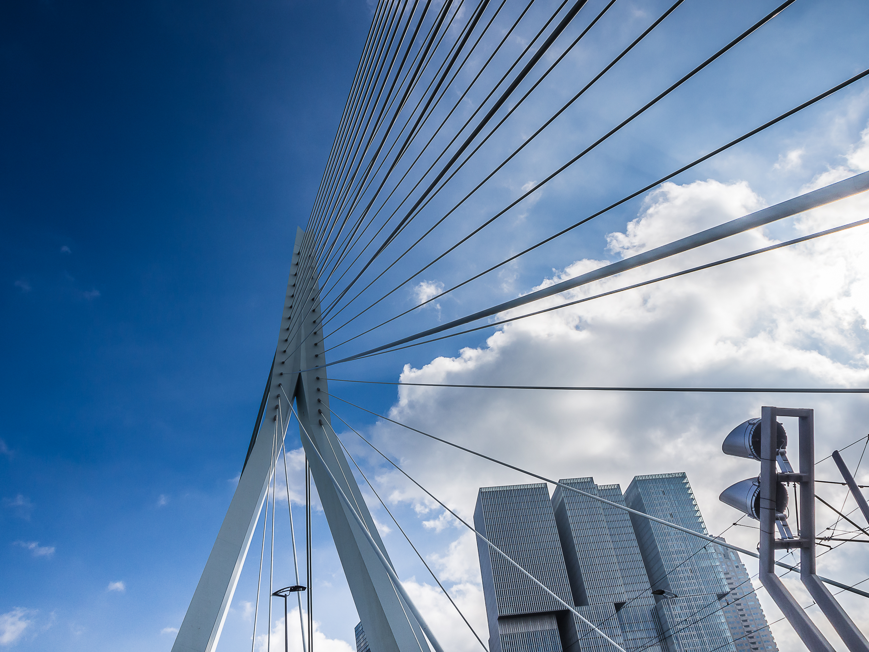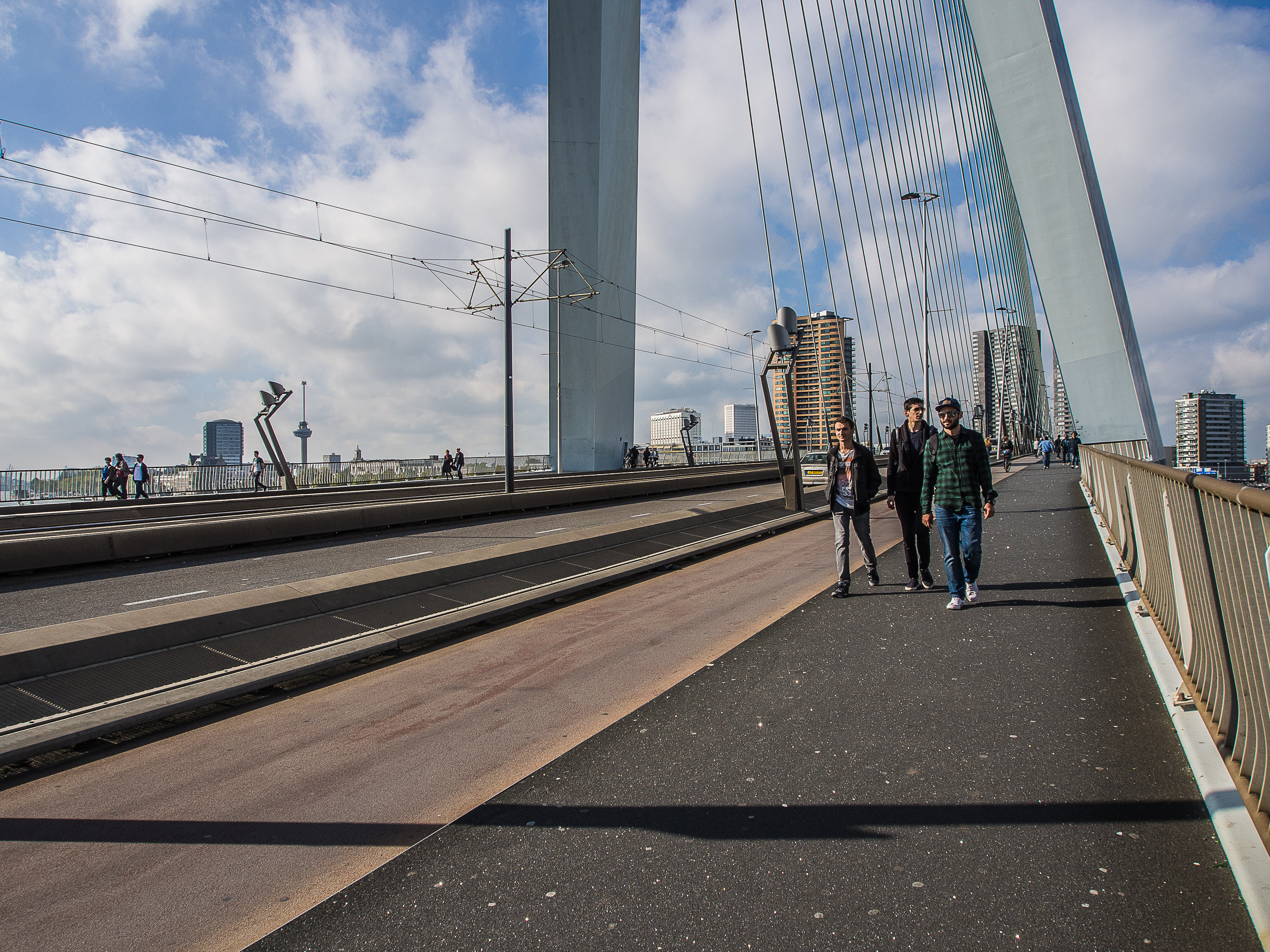 En revanche, regardez le sol de la voie pour piéton, on a mélangé au revêtement une substance brillante et qui le fait luire comme du diamant noir au soleil. Traverser l’Erasmusbrug, c’est aussi profiter de la « Skyline » de l’autre rive de la Meuse : les blocs des trois tours de « De Rotterdam », les tours penchées des « Toren Op Zuid » ou la géante « Montevideo ». Les fans d’architecture seront au paradis !