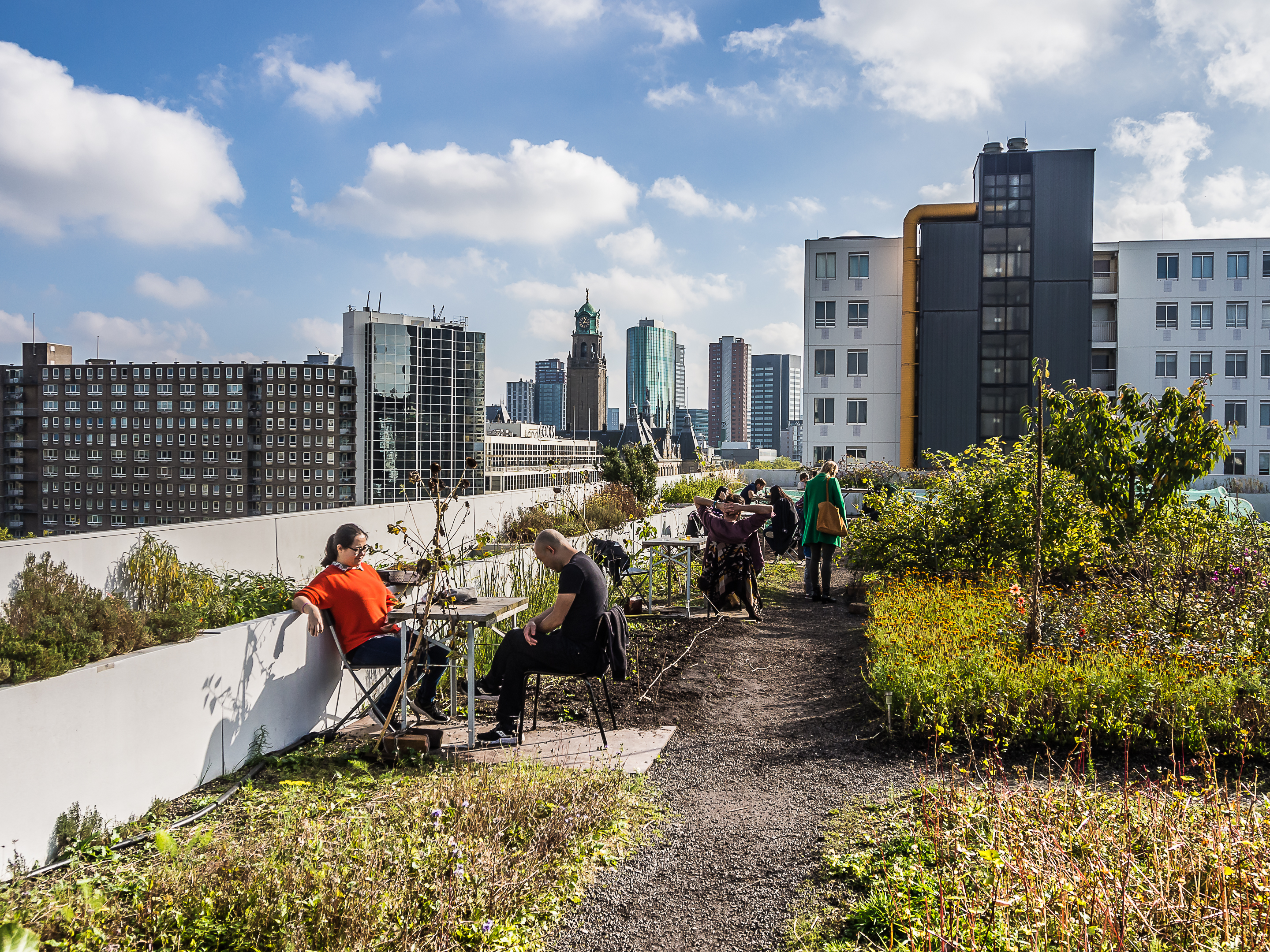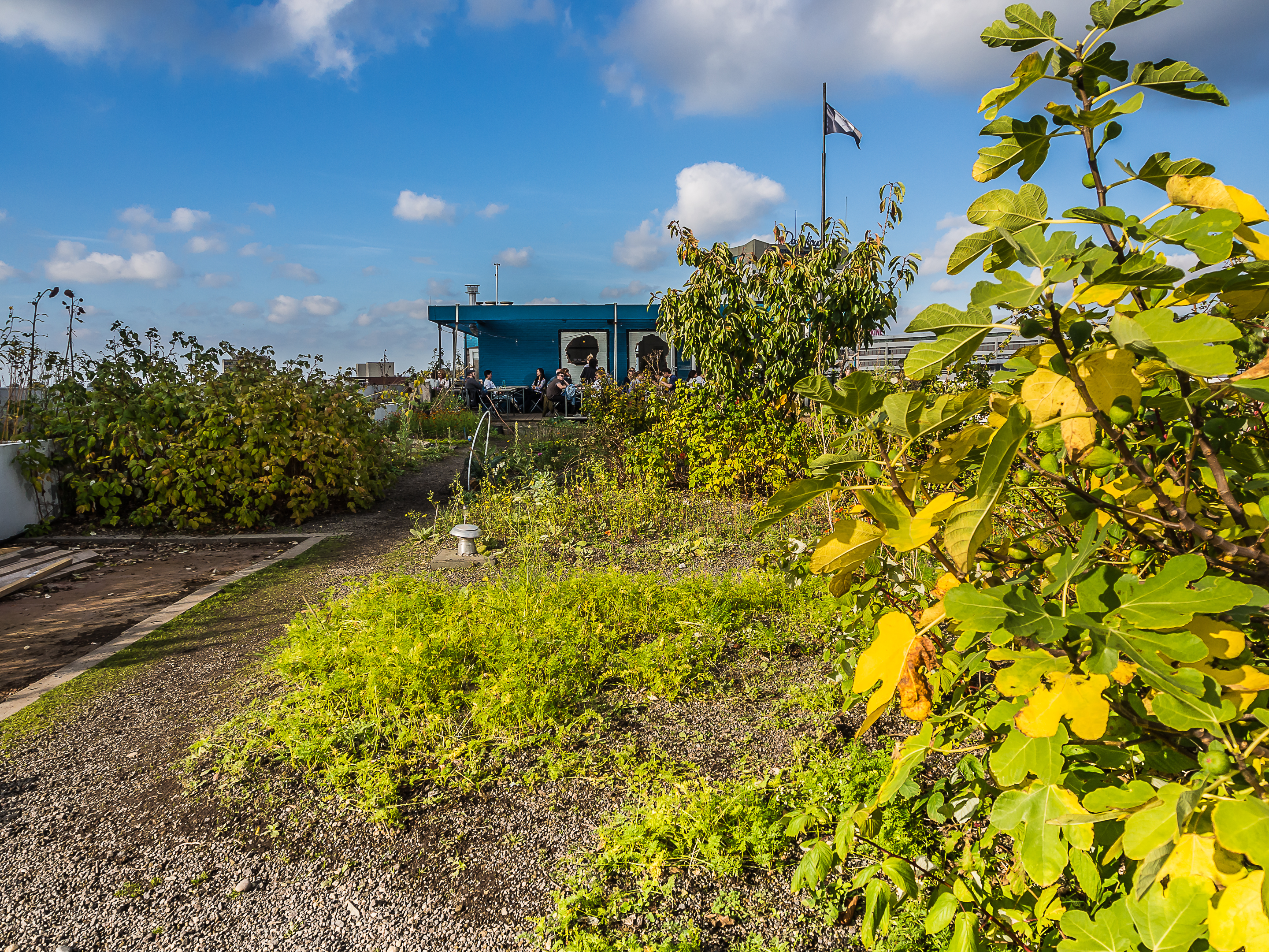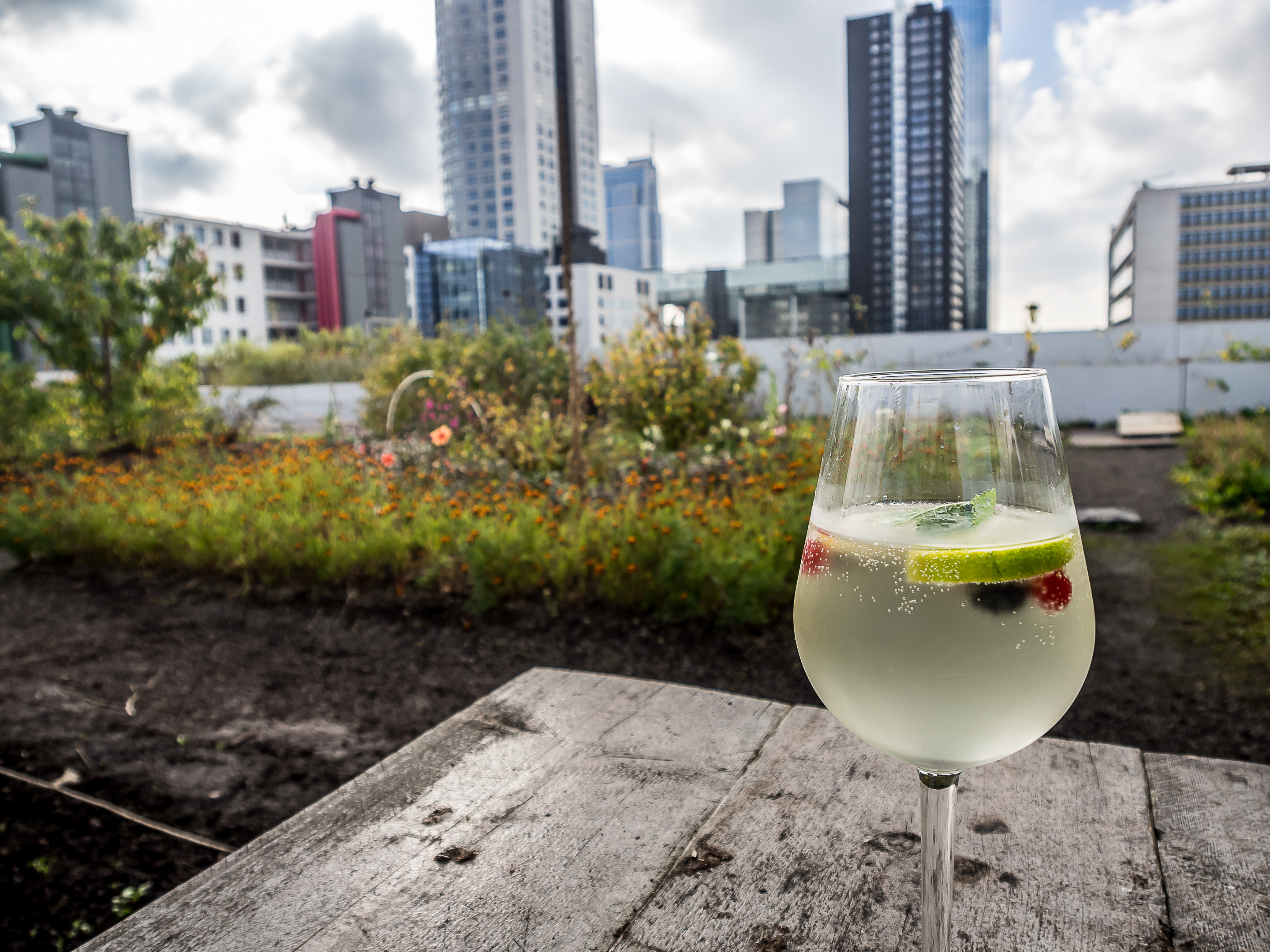 Avant de reprendre le bus, sur les conseils d’Au Gout d’Emma et de Living by the Sea, je me suis précipitée sur « Op Het Dak« . Situé à deux pas de la Gare centrale sur le toit d’un building, « Op Het Dak » est probablement le rooftop le plus cool qu’il m’ait été donné de voir ! Certes, la vue est évidemment géniale mais ce qui fait le charme du lieu, c’est que l’on y planté un véritable jardin avec de la terre et tout, et tout : fleurs, buissons, légumes, herbes y sont plantés et les tables disposées à travers le jardin. On y mange les pieds dans la terre et les herbes sont utilisées dans la confection du menu. Comme le menu est fait avec des produits de saison, je commande une soupe de potiron, servie avec des graines de courges, fleurs comestibles et du pain fait maison (on voit d’ailleurs les sacs de farine à l’entrée). Gros, gros coup de cœur pour ce rooftop qui n’ouvre que pendant la journée ! On est bien, la tête plus près du ciel et les chaussures dans l’herbe.