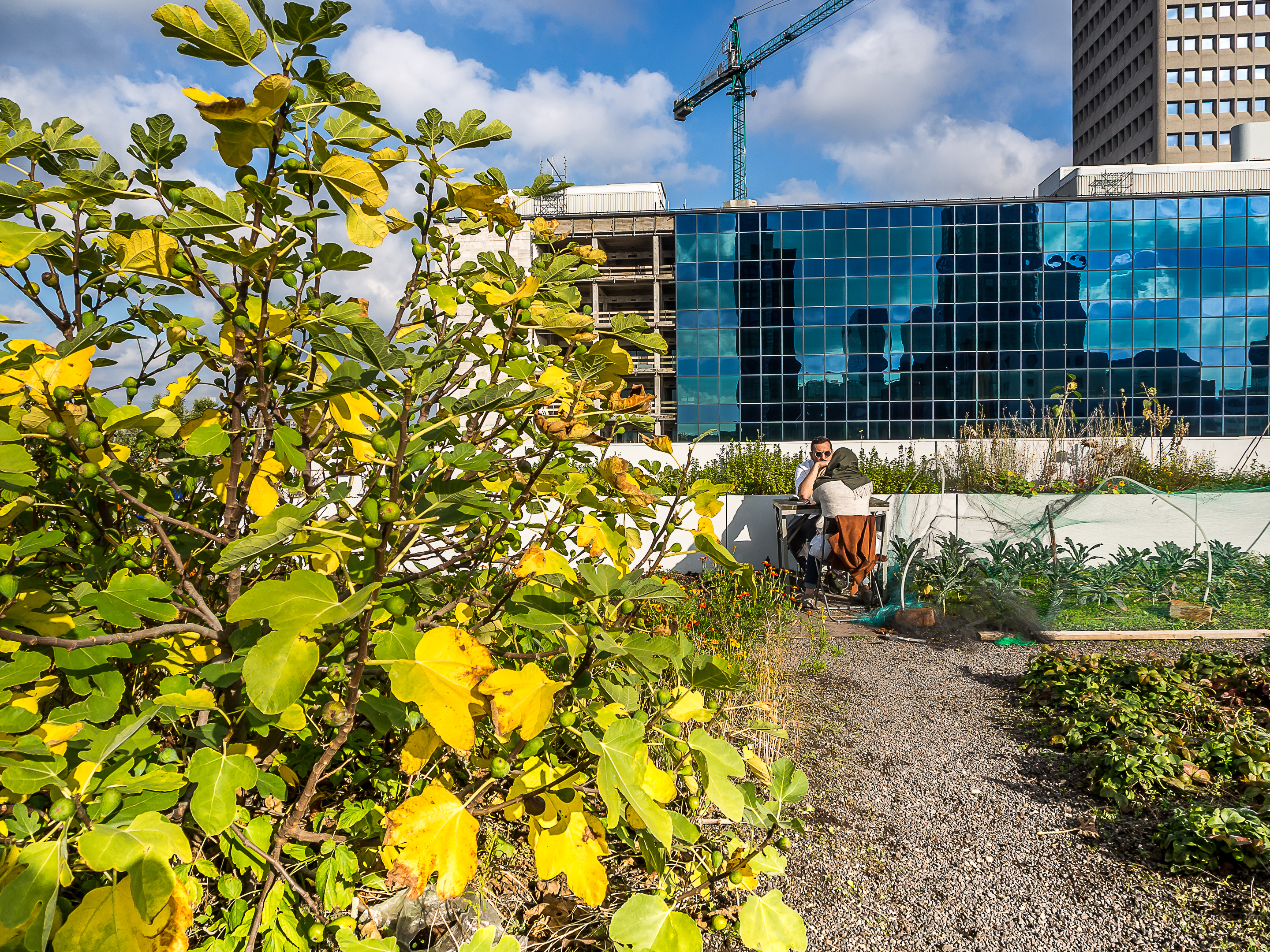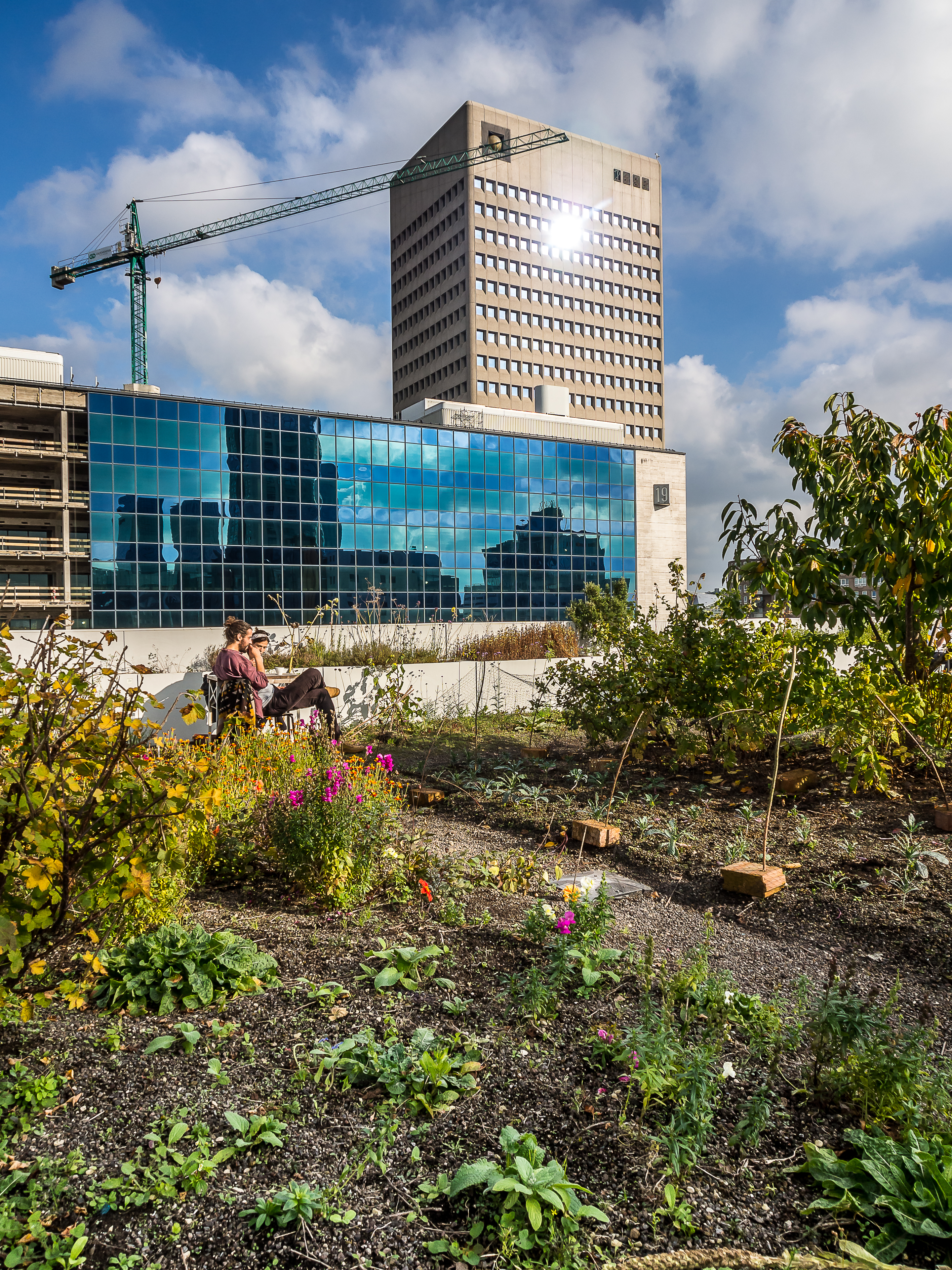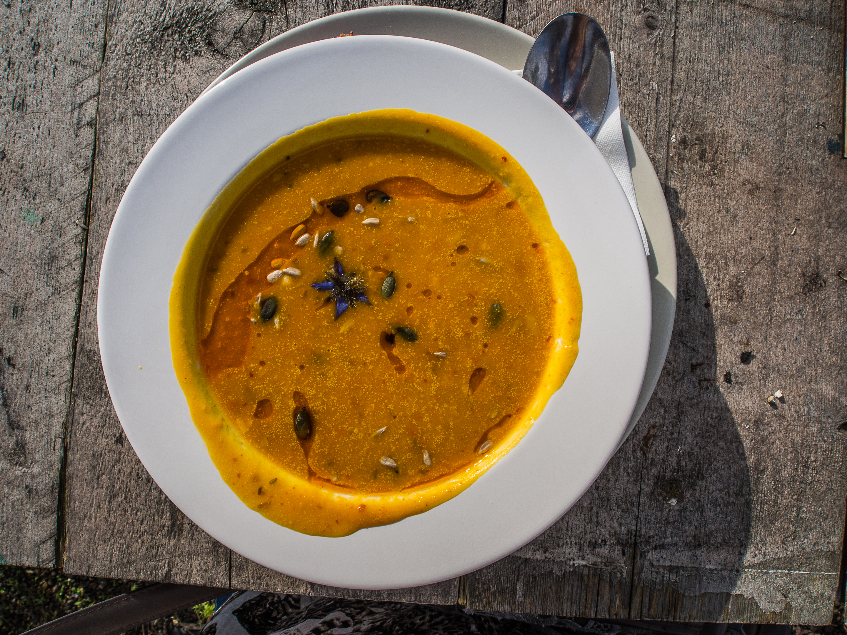 Avant de reprendre le bus, sur les conseils d’Au Gout d’Emma et de Living by the Sea, je me suis précipitée sur « Op Het Dak« . Situé à deux pas de la Gare centrale sur le toit d’un building, « Op Het Dak » est probablement le rooftop le plus cool qu’il m’ait été donné de voir ! Certes, la vue est évidemment géniale mais ce qui fait le charme du lieu, c’est que l’on y planté un véritable jardin avec de la terre et tout, et tout : fleurs, buissons, légumes, herbes y sont plantés et les tables disposées à travers le jardin. On y mange les pieds dans la terre et les herbes sont utilisées dans la confection du menu. Comme le menu est fait avec des produits de saison, je commande une soupe de potiron, servie avec des graines de courges, fleurs comestibles et du pain fait maison (on voit d’ailleurs les sacs de farine à l’entrée). Gros, gros coup de cœur pour ce rooftop qui n’ouvre que pendant la journée ! On est bien, la tête plus près du ciel et les chaussures dans l’herbe.
