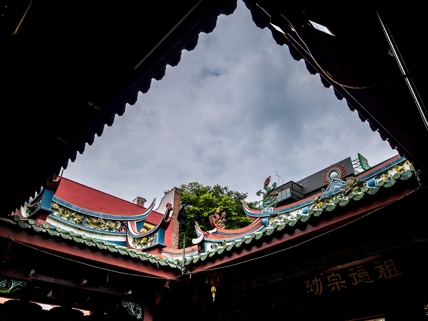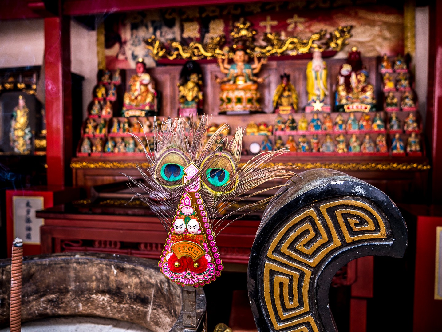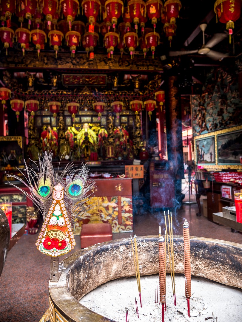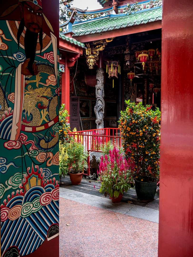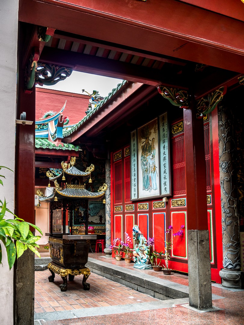 Je ne vais pas tarder à me frotter à toute la diversité de Singapour lorsqu’à 5 minutes de l’hôtel, je passe devant le Tan Si Song Chu, le temple ancestral du clan Tan. Selon les croyances traditionnelles chinoises, toutes personnes portant le même nom de famille sont issues de la même lignée. Les famille Tan, immigrées de Chine, étaient répandues en Malaisie et à Singapour. Au XIXème siècle, deux Tans firent construire le temple, qui se trouvait alors près de la rivière Singapour. A présent, c’est plutôt une espèce d’autoroute urbaine qui passe à côté mais c’est un lieu d’un calme impressionnant. On ne peut pas le louper avec son entrée ornée de lampions rouges, on franchit son grand seuil et tout d’un coup, Lectrice, Lecteur, te voilà transporté(e) à des milliers de kilomètres d’ici, sur la terre chinoise des ancêtres. Je me fais silencieuse, pendant qu’une douce musique se fait entendre et que le parfum de l’encens vient me chatouiller les narines !