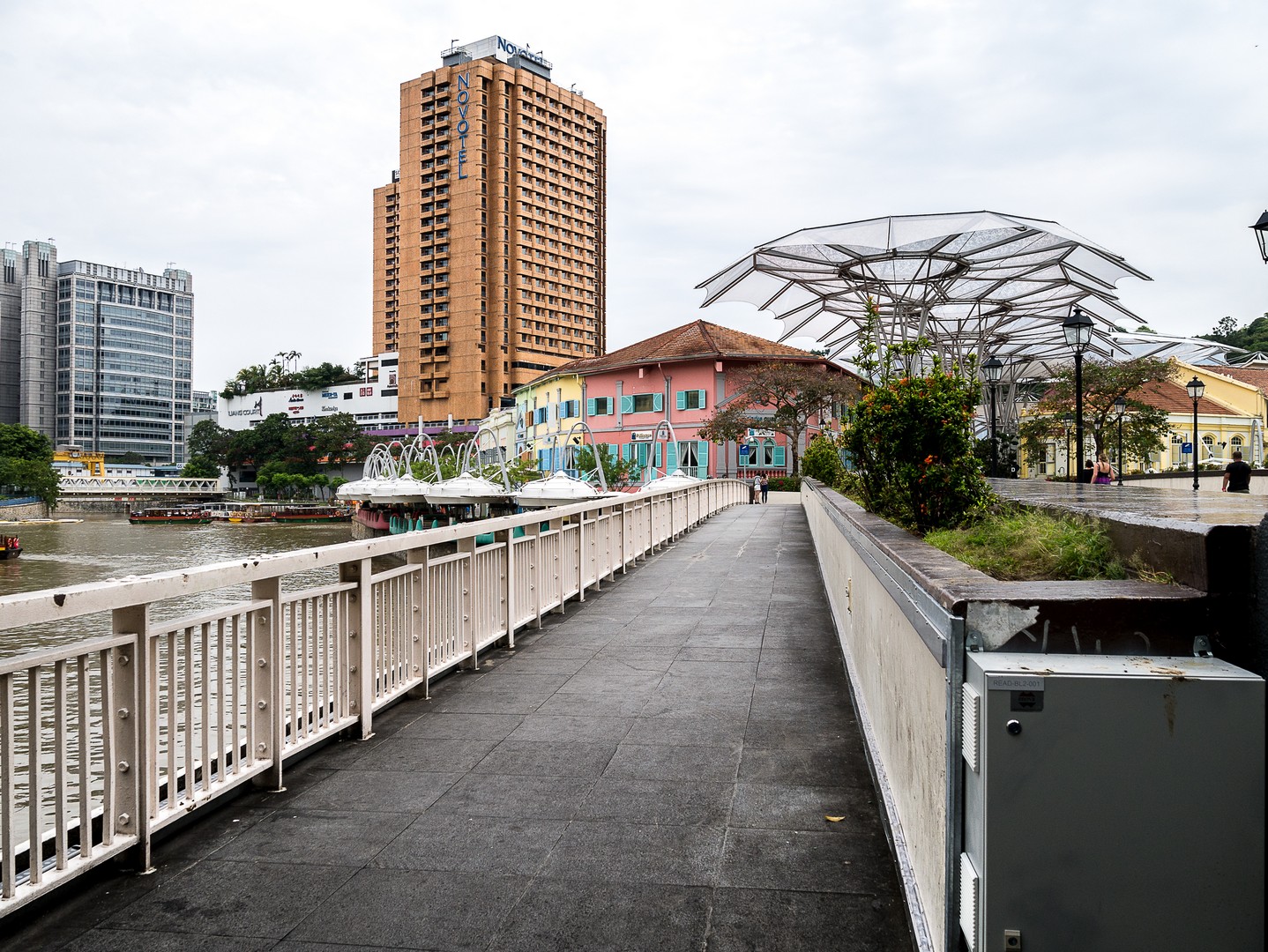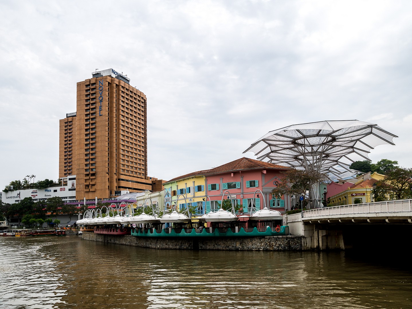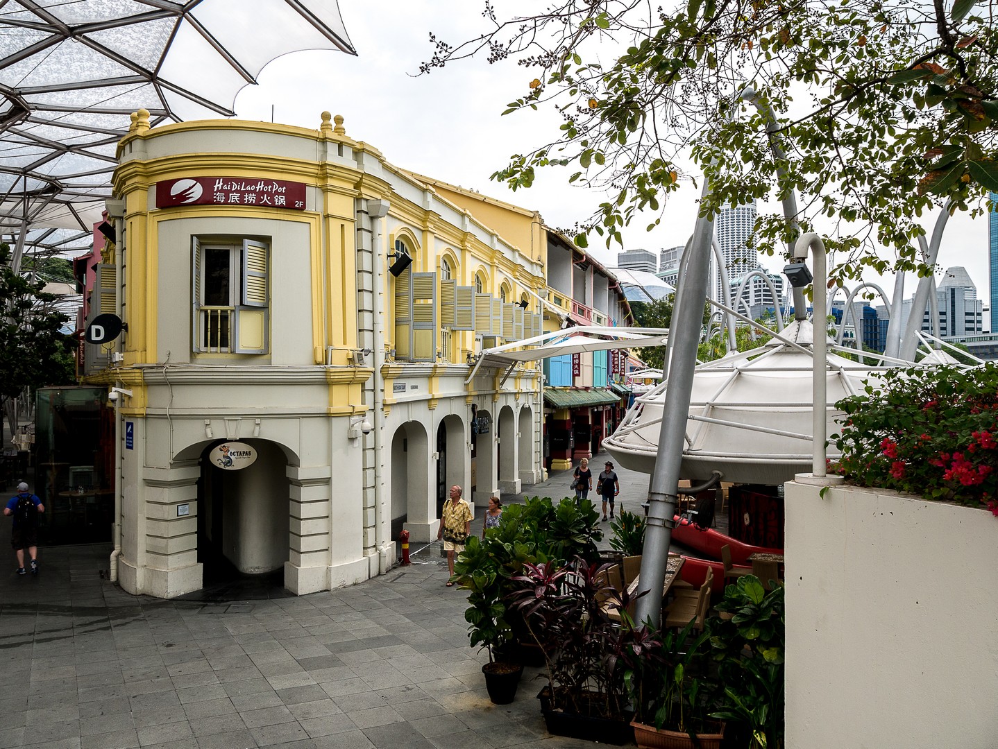 Je passe le pont qui surplombe la rivière pour me replonger dans la modernité : c’est ici que se trouve Clarcke Quay, l’endroit où il faut venir boire un verre le soir (pas de chance, nous sommes en fin de matinée). Ces anciens quais et hangars qui ont joué un rôle important à Singapour ont été convertis en bars, restaurants et nightclubs ! Un véritable Disneyland pour adultes qui mêle l’architecture industrielle du XIXème avec des éléments contemporains. Je ne sais pas trop quoi en penser. L’endroit est joli. Un peu kitsch, mais joli… mais tout semble tellement avoir été planifié au cordeau que j’en ressors avec l’impression de voir une ville de carton-pâte.