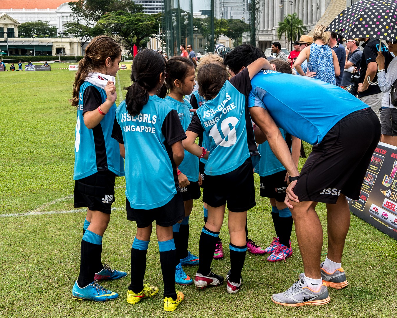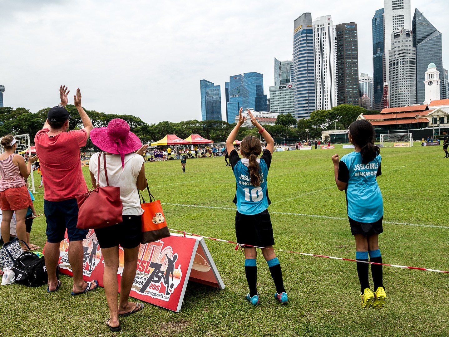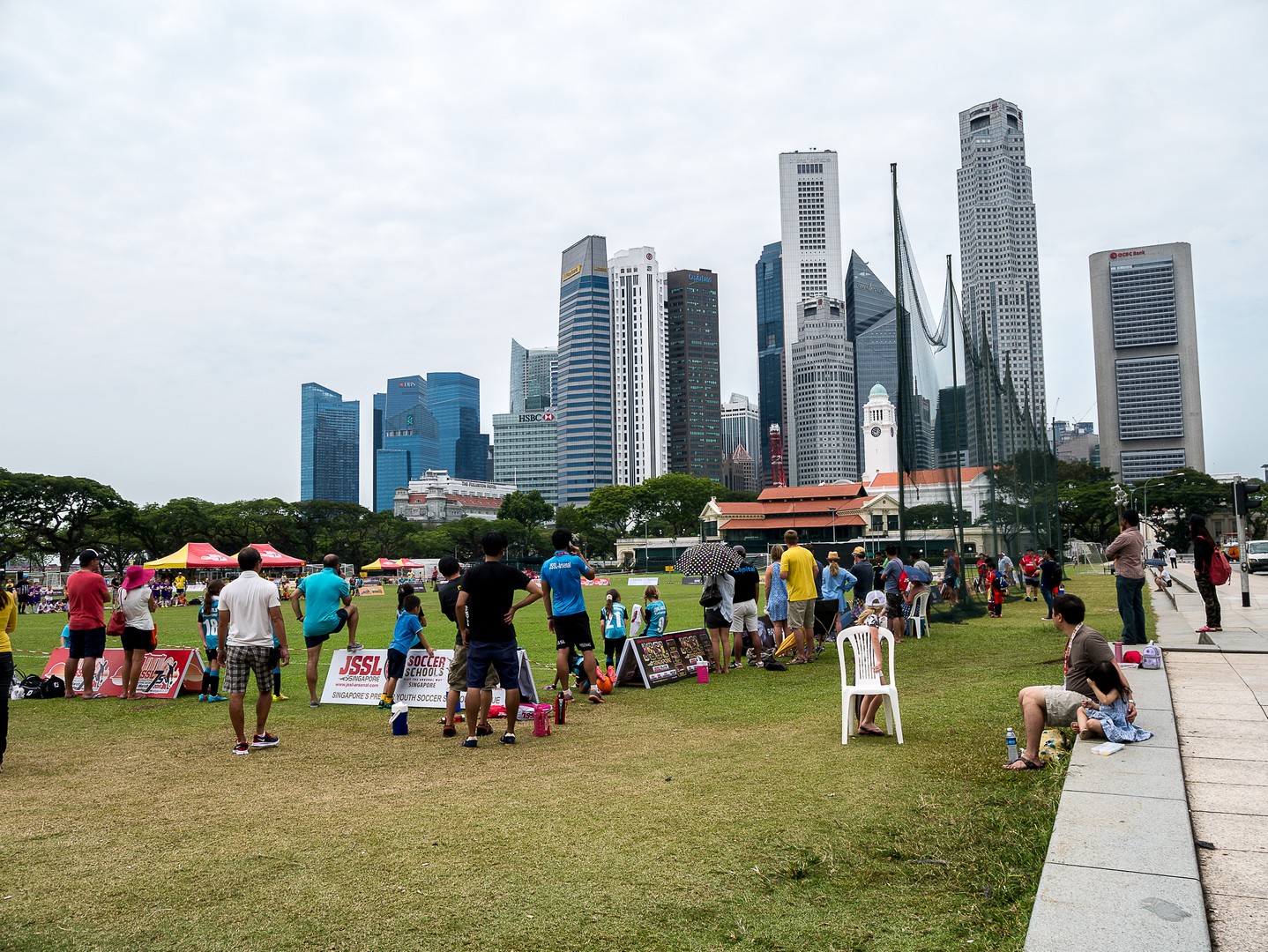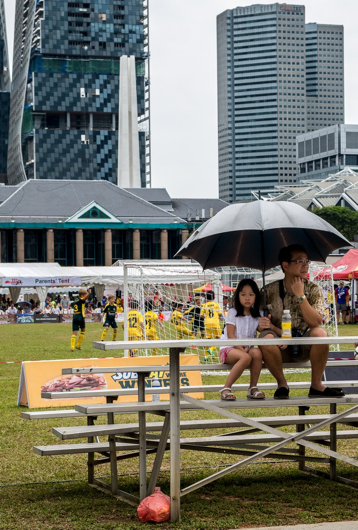 Ma promenade me conduit du côté d’un Parc mais nous sommes samedi et ce matin, au parc, c’est matinée football pour les enfants ! Une foule de petits garçons, de petites filles et leurs parents ont envahi les pelouses pour les matchs ! Ce sera ici que j’aurai pour la première fois une réelle vision des communautés qui forment Singapour. Si à l’origine, Singapour est un prolongement de la Malaisie mais la colonisation britannique va marquer sa démographie, faisant venir sur l’île des travailleurs chinois et indiens. A présent, les Chinois forment la majorité des Singapouriens, suivi des Malais, des Indiens et des Occidentaux, souvent descendus des Britanniques établis ici. Une diversité de peuples, de cultures et de religions. Et ce sont tous ces visages que je retrouve sur le terrain, courant ensemble derrière le petit ballon. L’image la plus touchante reste certainement les bras ces petites filles qui entouraient leur coach pour un dernier conseil avant la reprise du match. Une belle image d’harmonie. Singapour aurait-elle trouvé la recette de la cohabitation heureuse ?