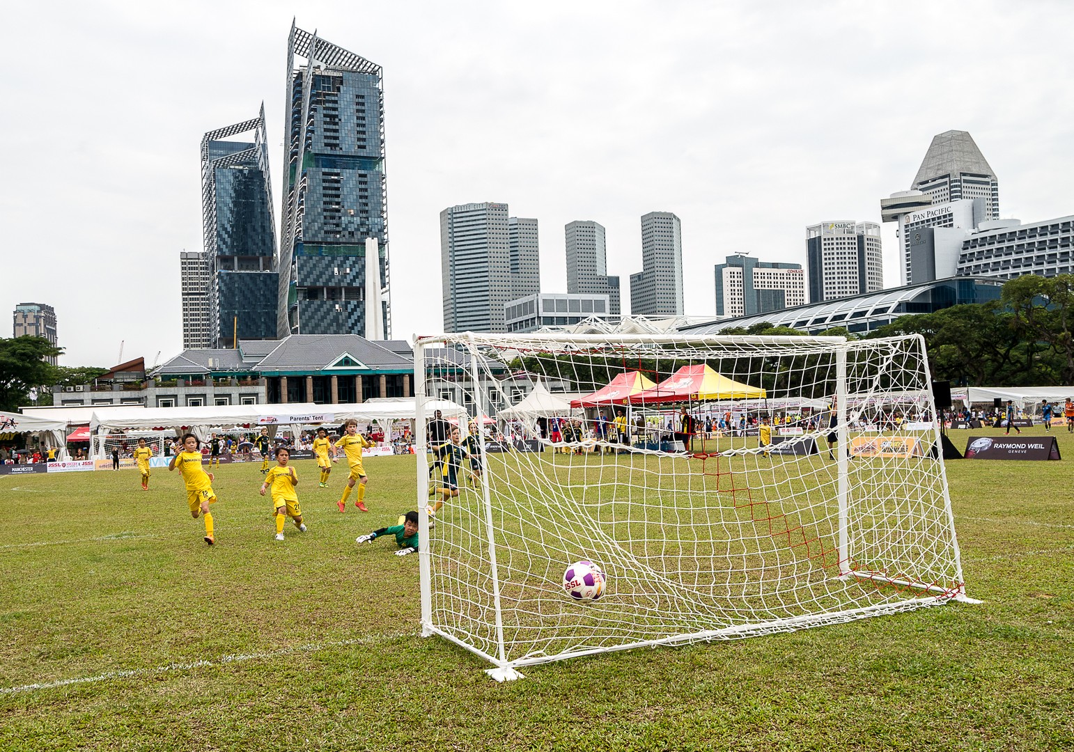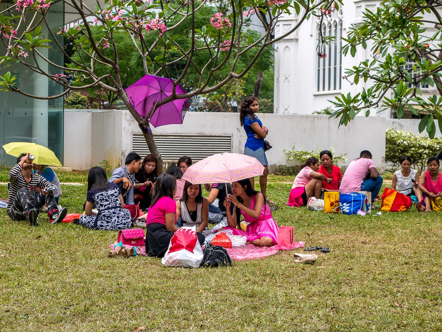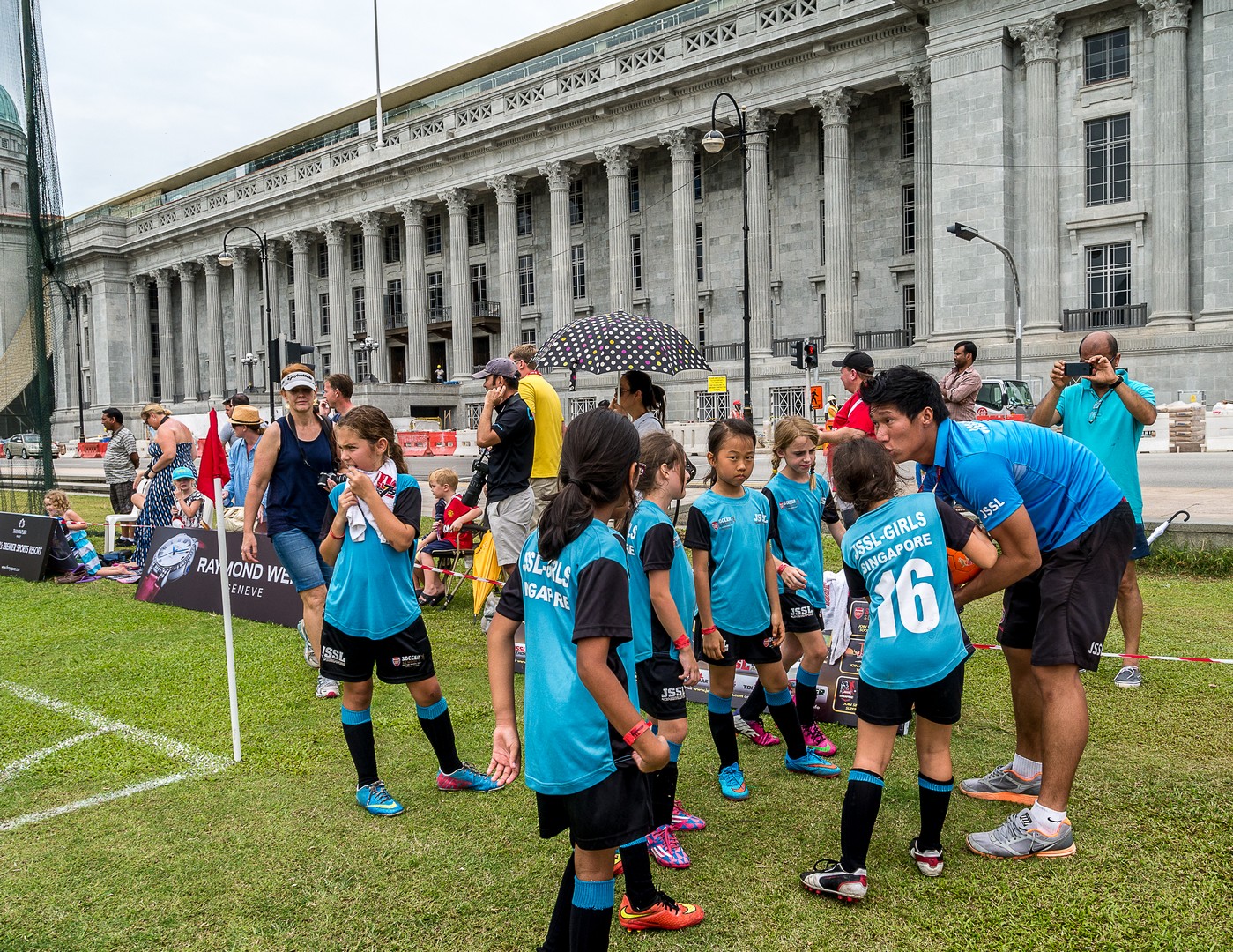 Ma promenade me conduit du côté d’un Parc mais nous sommes samedi et ce matin, au parc, c’est matinée football pour les enfants ! Une foule de petits garçons, de petites filles et leurs parents ont envahi les pelouses pour les matchs ! Ce sera ici que j’aurai pour la première fois une réelle vision des communautés qui forment Singapour. Si à l’origine, Singapour est un prolongement de la Malaisie mais la colonisation britannique va marquer sa démographie, faisant venir sur l’île des travailleurs chinois et indiens. A présent, les Chinois forment la majorité des Singapouriens, suivi des Malais, des Indiens et des Occidentaux, souvent descendus des Britanniques établis ici. Une diversité de peuples, de cultures et de religions. Et ce sont tous ces visages que je retrouve sur le terrain, courant ensemble derrière le petit ballon. L’image la plus touchante reste certainement les bras ces petites filles qui entouraient leur coach pour un dernier conseil avant la reprise du match. Une belle image d’harmonie. Singapour aurait-elle trouvé la recette de la cohabitation heureuse ?