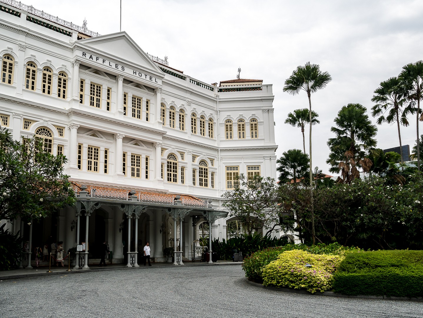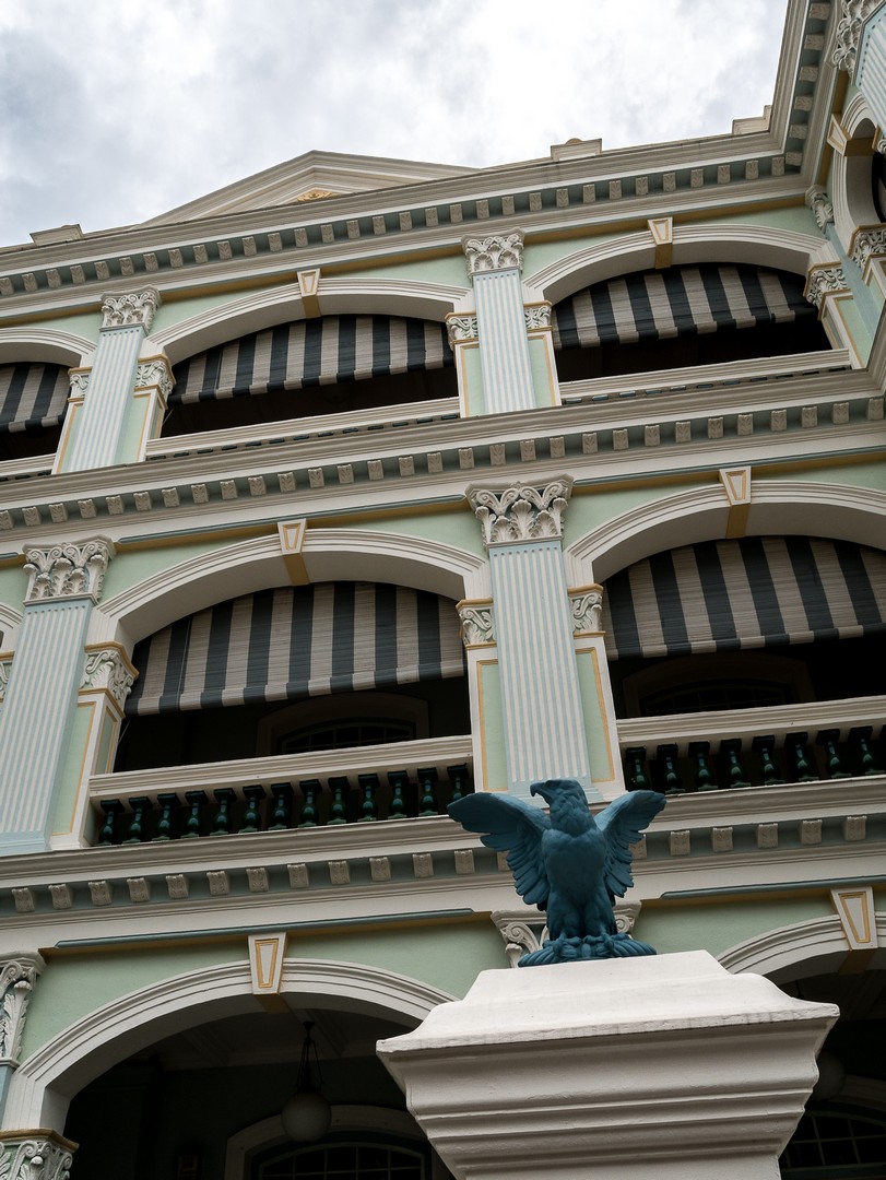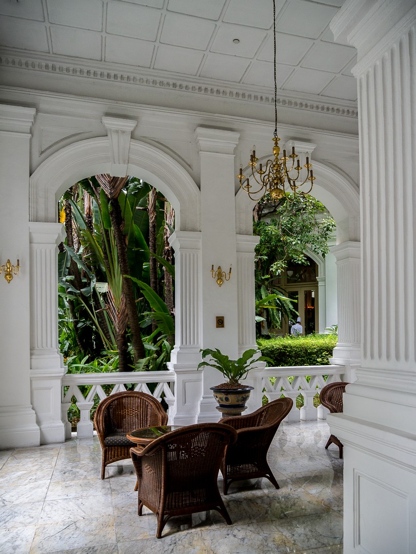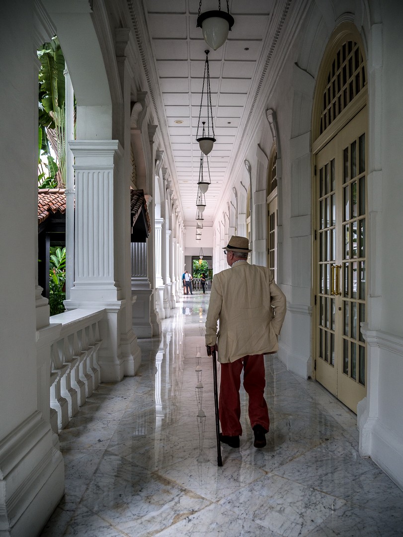 Le passé colonial, je vais le retrouver chez une institution singapourienne, l’un de ses plus célèbres hôtels : le Raffles Hotel ! Le Raffles porte le nom de Thomas Stamford Raffles qui créât le comptoir qui allait devenir Singapour. Oui, ce même Raffles dont je parlais quand je t’ai raconté Borobudur, Lectrice, Lecteur. Cet hôtel a le charme que les bâtisses coloniales peuvent prendre sous les tropiques. Sans doute l’incongruité d’un tel bâtiment et le symbole d’une époque révolue. Je croise d’ailleurs la silhouette d’un vieux monsieur bien mis, Occidental, bien trop habillé pour la chaleur tropicale. Sa silhouette qui se soutient avec une canne me laisse songeuse. Il a l’air d’être un habitué et de circuler en sans avoir l’air de se demander où il va. Il fait peut-être partie de ces Britanniques nés dans ces anciennes colonies de parents déjà nés ici mais plus british que les Britanniques eux-mêmes. Élevé dans le souvenir distant d’une patrie idéalisée. Je le laisse continuer son chemin sur le marbre immaculé de l’hôtel. Tout respire l’opulence ici… l’architecture, les décorations, la profusion de plantes… le lieu est tellement exclusif que vous ne pourrez pas mettre un pied dans le lobby (ce qui est EXTRÊMEMENT rare dans un hôtel). Par contre, vous ne rencontrerez aucun problème pour y manger ou y boire un verre. Comme il est presque midi, je n’ai aucun complexe à aller m’asseoir à la table d’un des bars puisque c’est ici même que l’on a crée un classique des cocktails : le Singapore Sling ! Plutôt que de m’installer au fameux Long Bar, j’ai préféré m’attabler au bar qui se trouve dans le jardin, à l’ombre des arbres pour déguster ce breuvage qui a, selon la légende, été inventé pour permettre aux dames de boire un peu d’alcool, à l’époque où ce n’était pas socialement acceptable, en le faisant passer pour un simple punch. Sa couleur rose donné par la grenadine fit le reste !