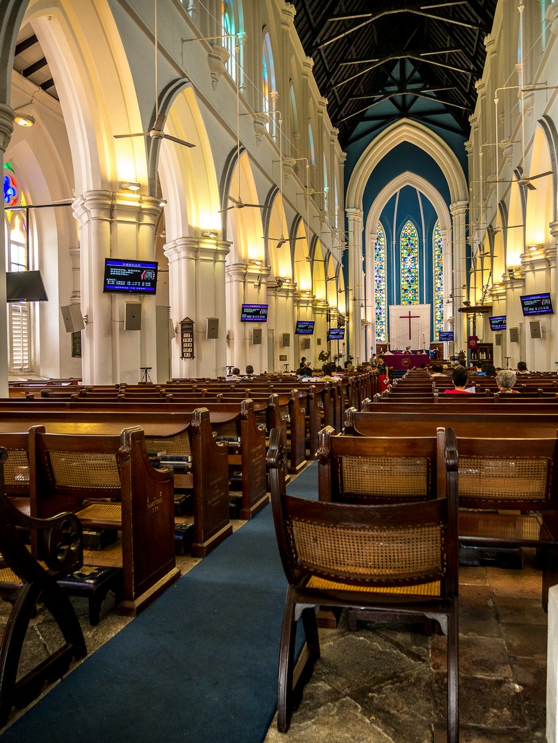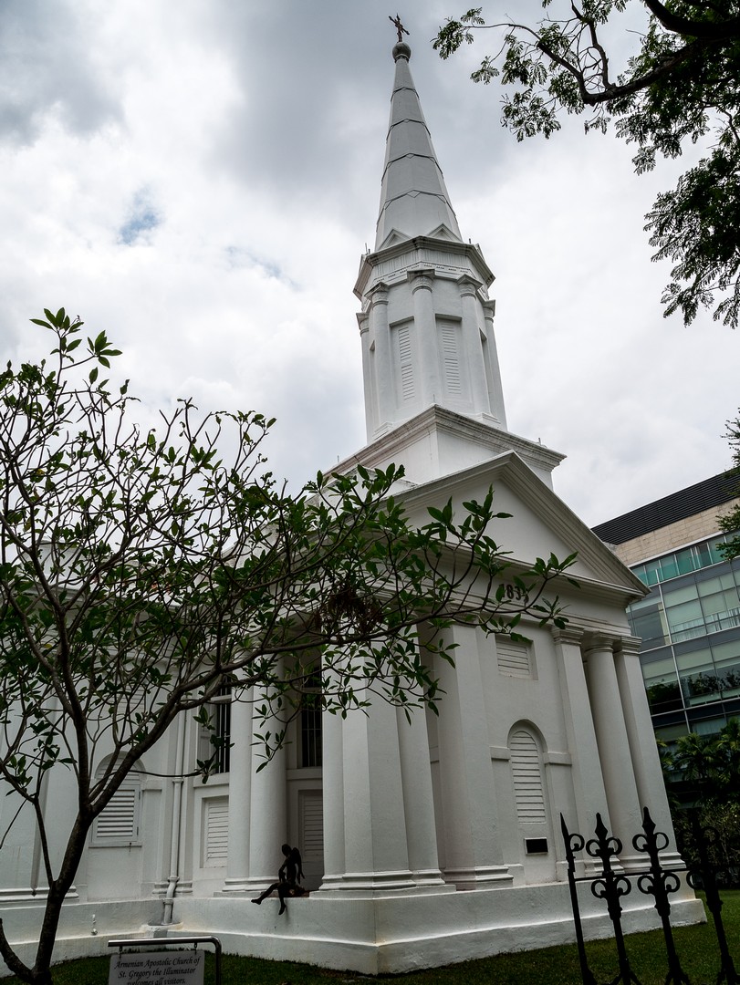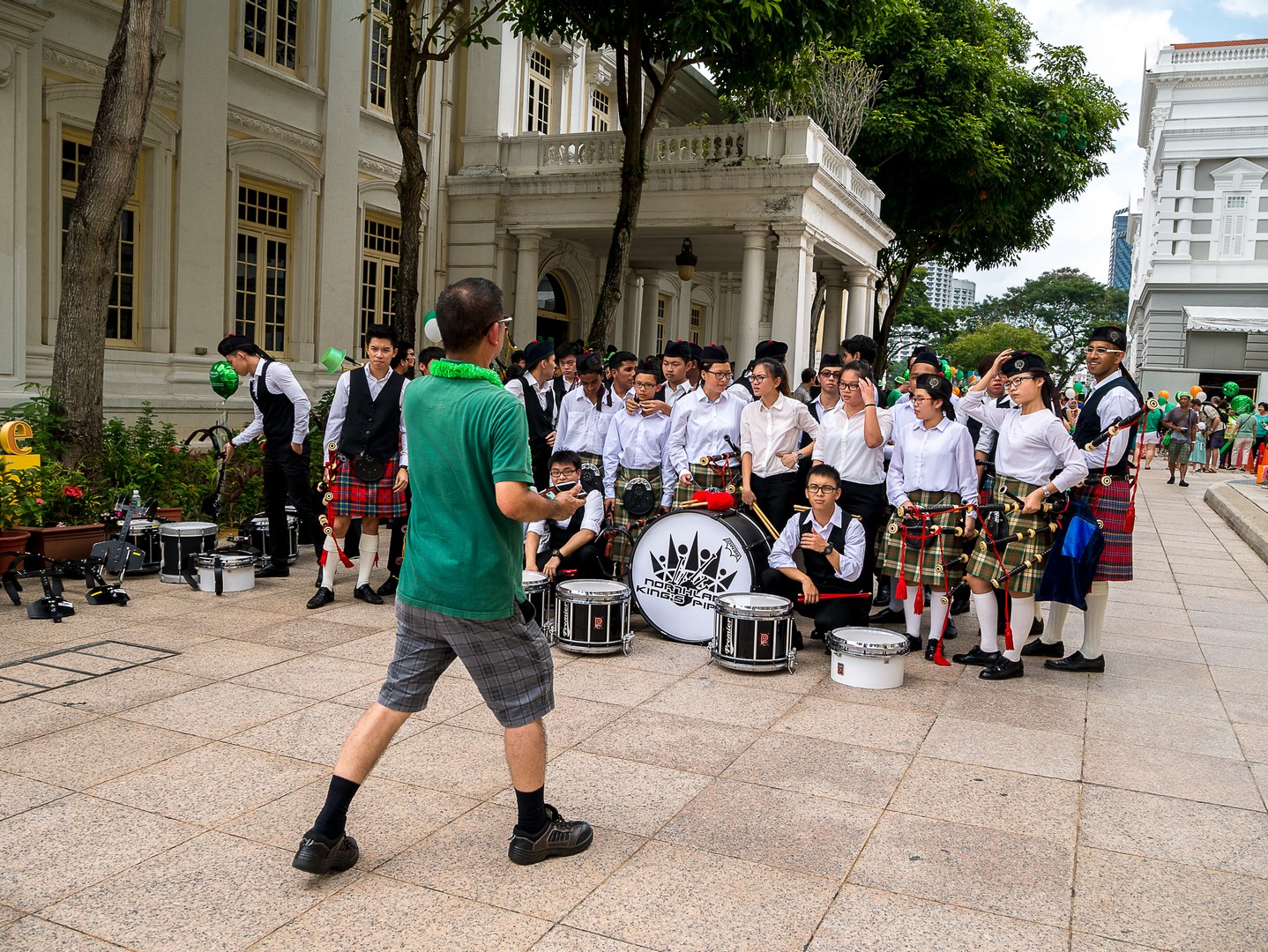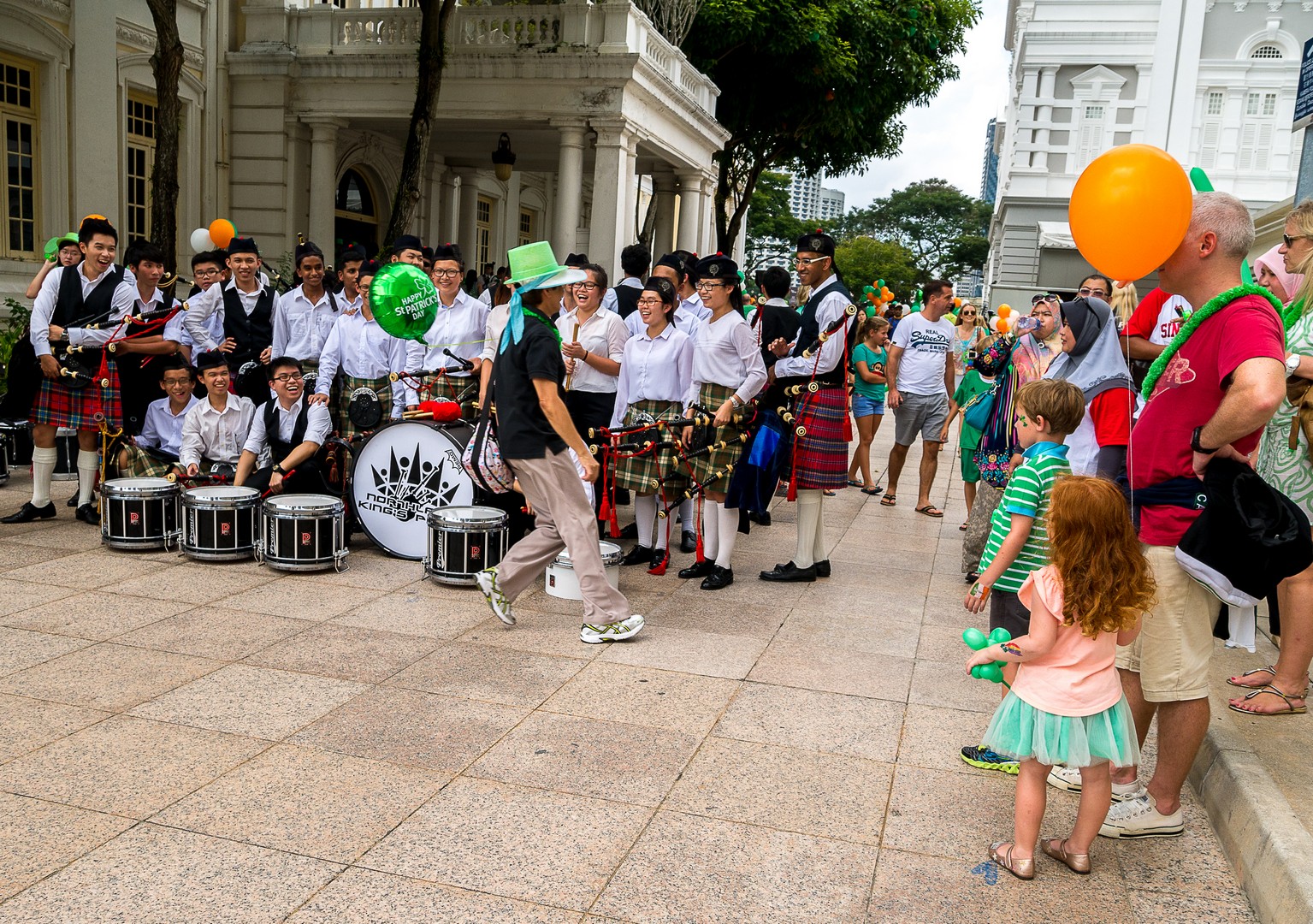 J’entame la longue marche vers le front de mer, passant devant différent lieux d’intérêt qu’il convient de visiter quand on a le temps, comme le Singapore Art Museum, l’Eglise arménienne de Singapour (la toute première église chrétienne du pays) et son joli cimetière où la cathédrale anglicane de Saint Andrew et son plafond bleu. Quoi que je fasse, j’ai l’impression que mes pas me ramènent toujours vers la rivière : la voilà bordée d’immeubles de bureaux et d’hôtels de luxe. Alors que je m’apprête à emprunter un des deux ponts à ma disposition pour passer à l’autre rive, je tombe sur une vision incongrue : une fanfare de cornemuse et une petite foule rassemblée munie de ballons verts et orange. Je réfléchis… nous sommes le 17 mars et c’est a Saint-Patrick ! Moment surréaliste… on vit vraiment dans un monde globalisé !