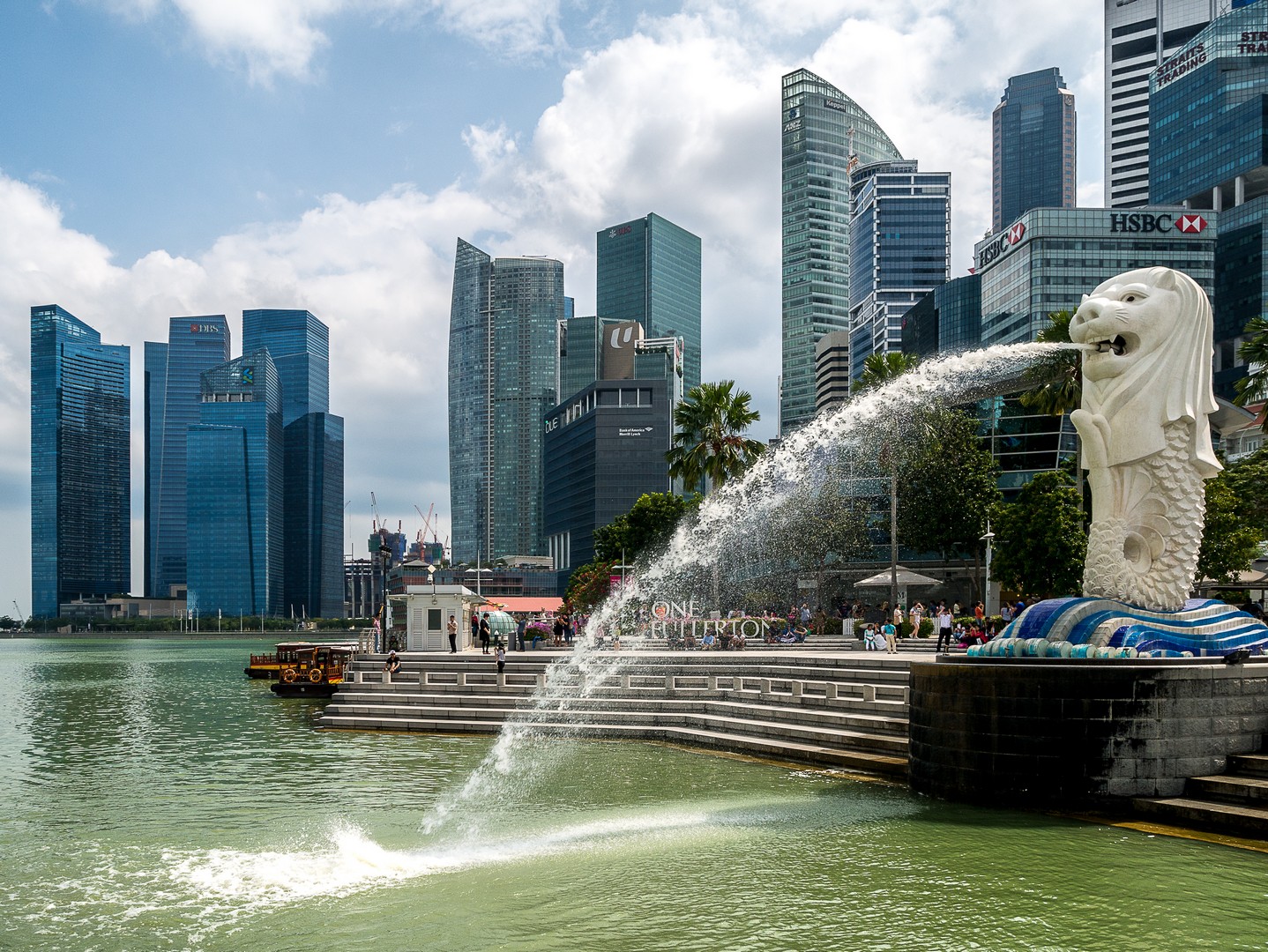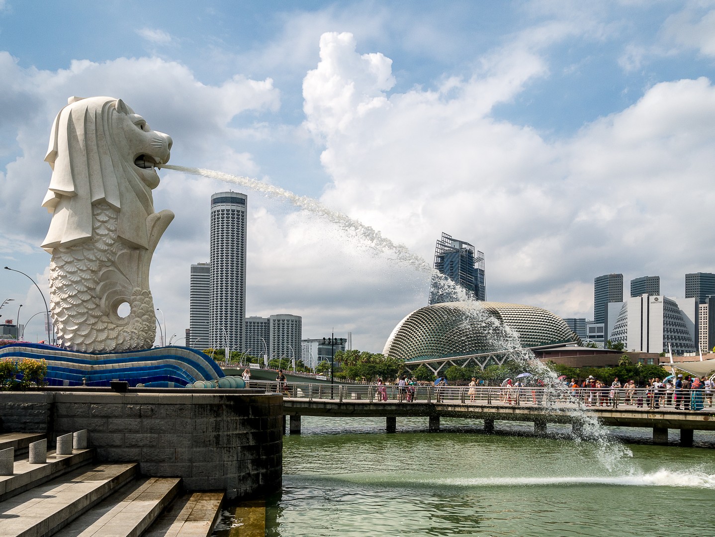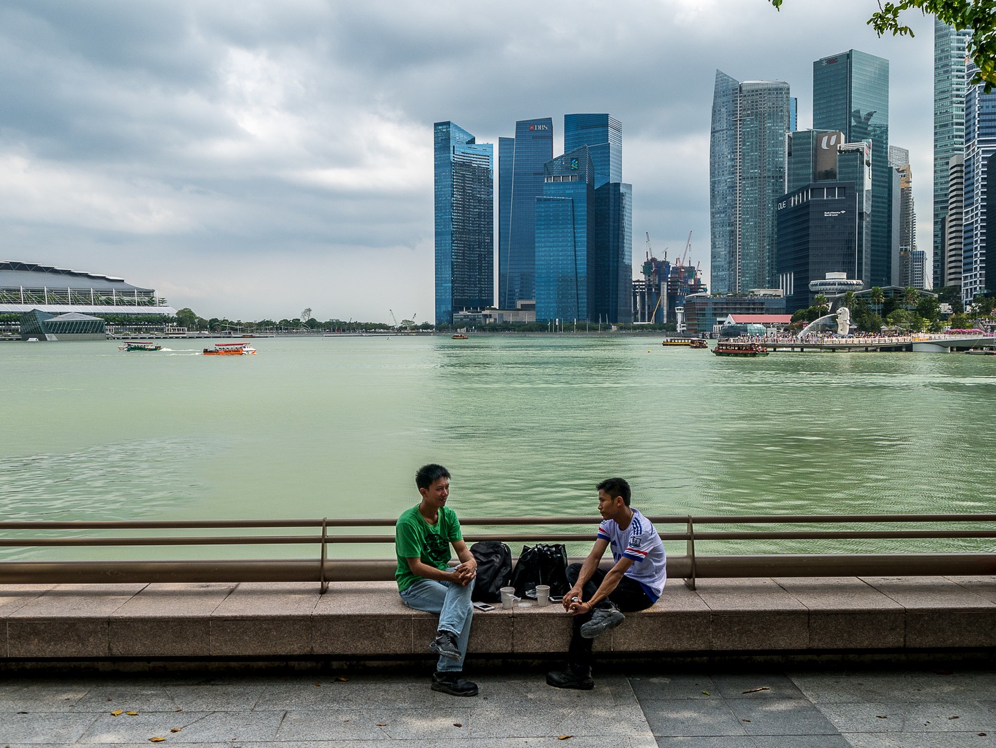 La promenade touche à sa fin ; me voilà à Merlion Park devant l’équivalent de notre Manneken Pis : le Merlion, une créature hybride de lion à queue de poisson, symbolisant les débuts de la ville comme simple village de pêcheurs, avant de prendre le nom de « Singapura », la « ville lion » en malais. C’est à présent l’une des icônes de la ville qui crache son eau à l’embouchure du fleuve. La vue sur la ville d’ici vaut vraiment la peine. D’un côté, on a le skyline du CBD, de l’autre, le quartier des Gardens by the Bay et le paquebot surélevé du Marina Bay Sand, le plus luxueux des hôtels de Singapour, que j’irais visiter après-demain.