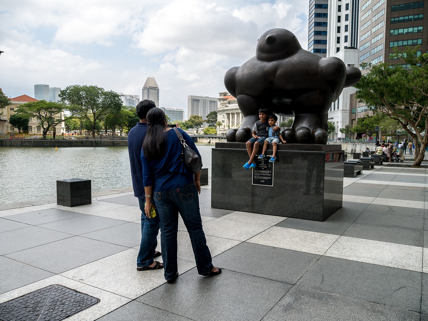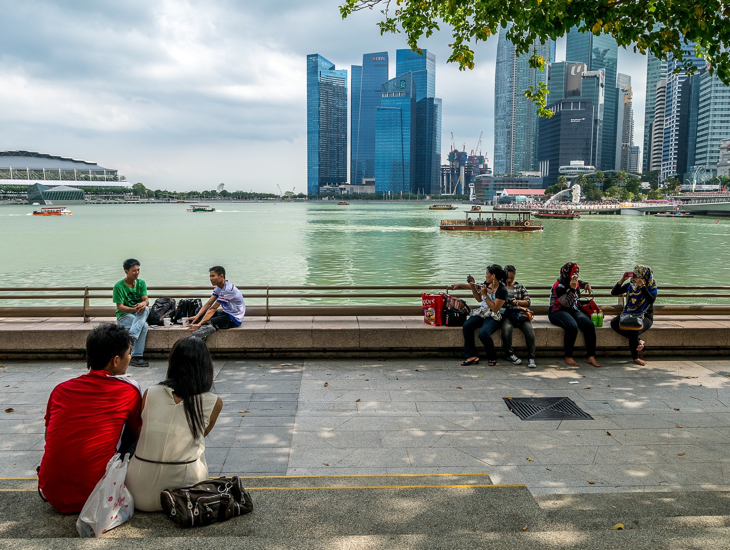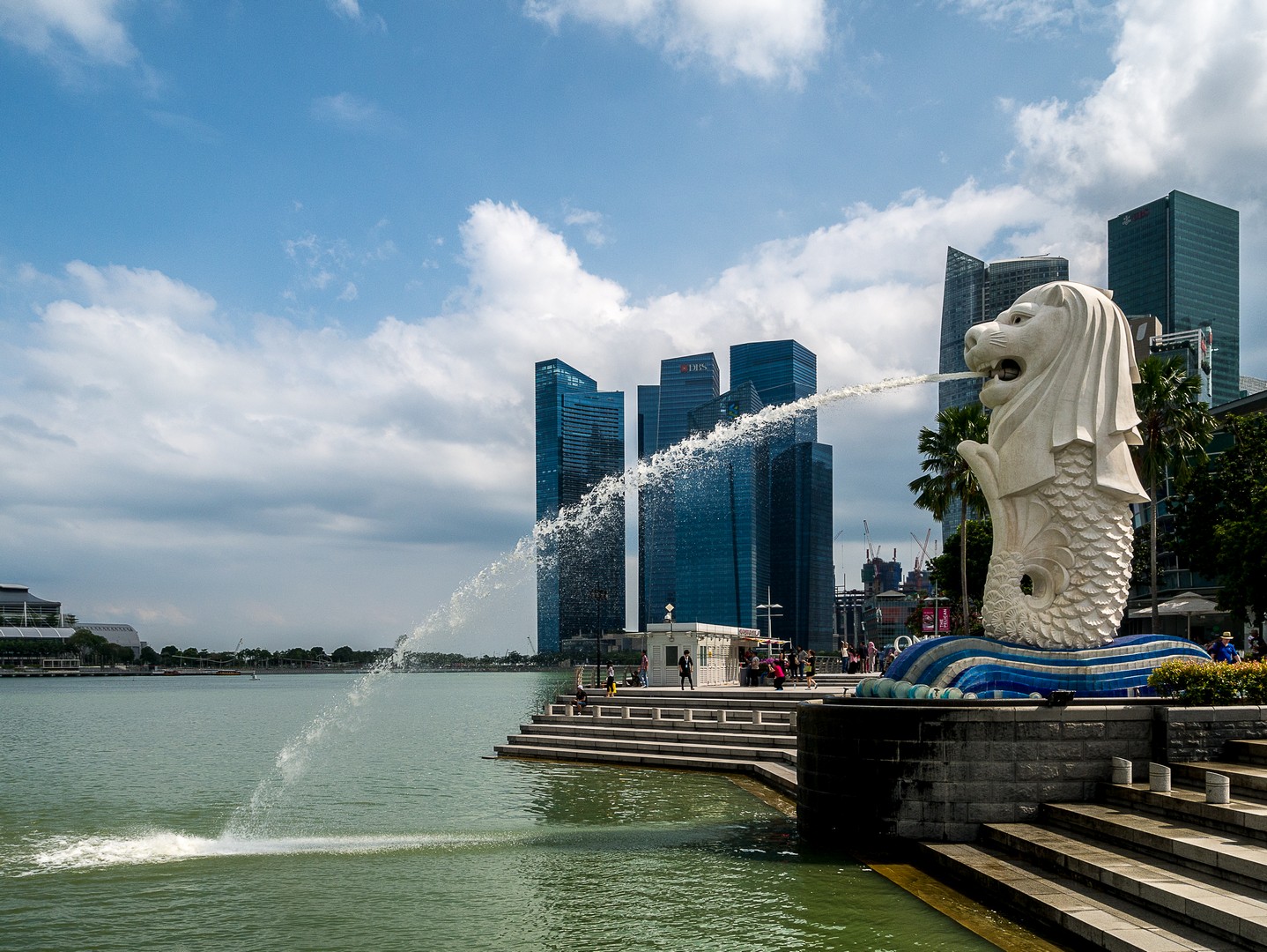 La promenade touche à sa fin ; me voilà à Merlion Park devant l’équivalent de notre Manneken Pis : le Merlion, une créature hybride de lion à queue de poisson, symbolisant les débuts de la ville comme simple village de pêcheurs, avant de prendre le nom de « Singapura », la « ville lion » en malais. C’est à présent l’une des icônes de la ville qui crache son eau à l’embouchure du fleuve. La vue sur la ville d’ici vaut vraiment la peine. D’un côté, on a le skyline du CBD, de l’autre, le quartier des Gardens by the Bay et le paquebot surélevé du Marina Bay Sand, le plus luxueux des hôtels de Singapour, que j’irais visiter après-demain.