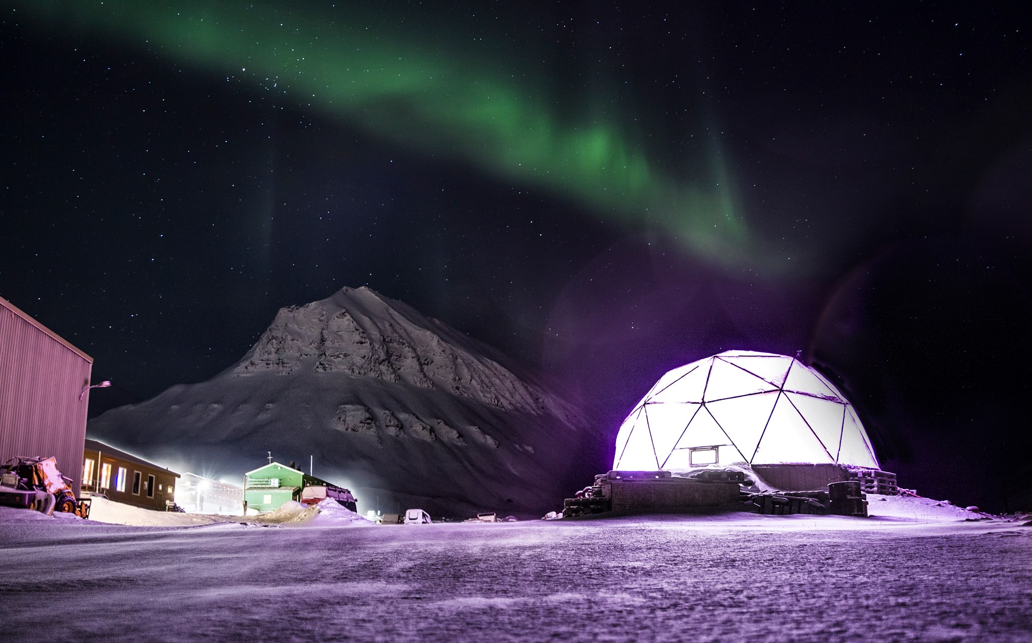 Ce qui le frappe au Svalbard, c’est évidement l’énorme quantité de produits qui doit être importée. Même le poisson est importé alors qu’ils sont au bord de la mer. Cela le fait réfléchir… et si il était possible de cultiver quelques herbes et légumes localement ? C’est ainsi que l’idée de Polar Permaculture est née. Benjamin se met donc à la recherche d’expériences de culture dans un environnement semblable, se documente, apprend tout ce qu’il peut, notamment sur le compostage, sur l’hydroponie qui semble particulièrement indiquée avec un sol gelé en permanence. La solution qui semble la meilleure, c’est de cultiver sous un dôme en plastique. Certains le font en Alaska, alors pourquoi pas au Svalbard ? Et voilà notre apprenti agriculteur qui se lance, non sans difficultés car importer du terreau (et des vers) dans un environnement aussi protégé demande pas de démarches et d’études. Finalement, il arrive à réaliser son objectif ! Une petit terrain lui est prêté à Nybyen, un quartier de Longyearbyen et son dôme illuminé de pourpre va vite devenir une icône dans un paysage blanc et noir.
