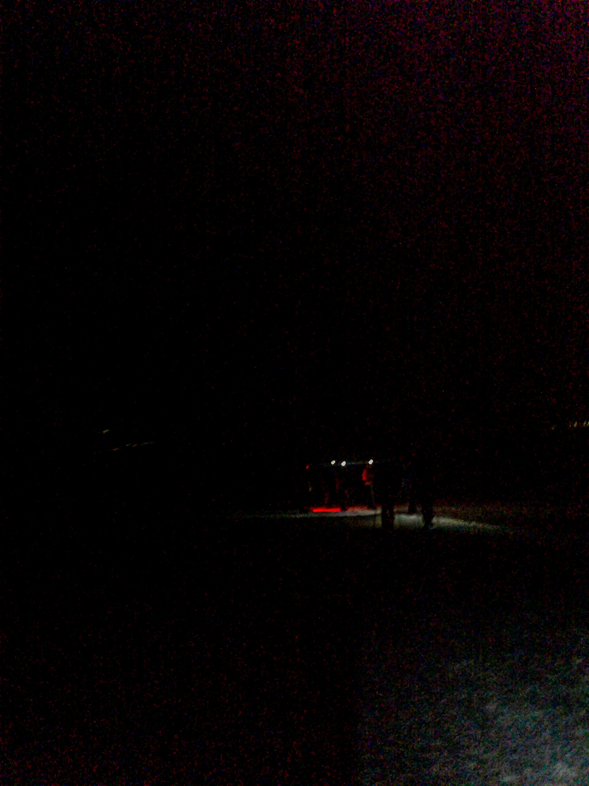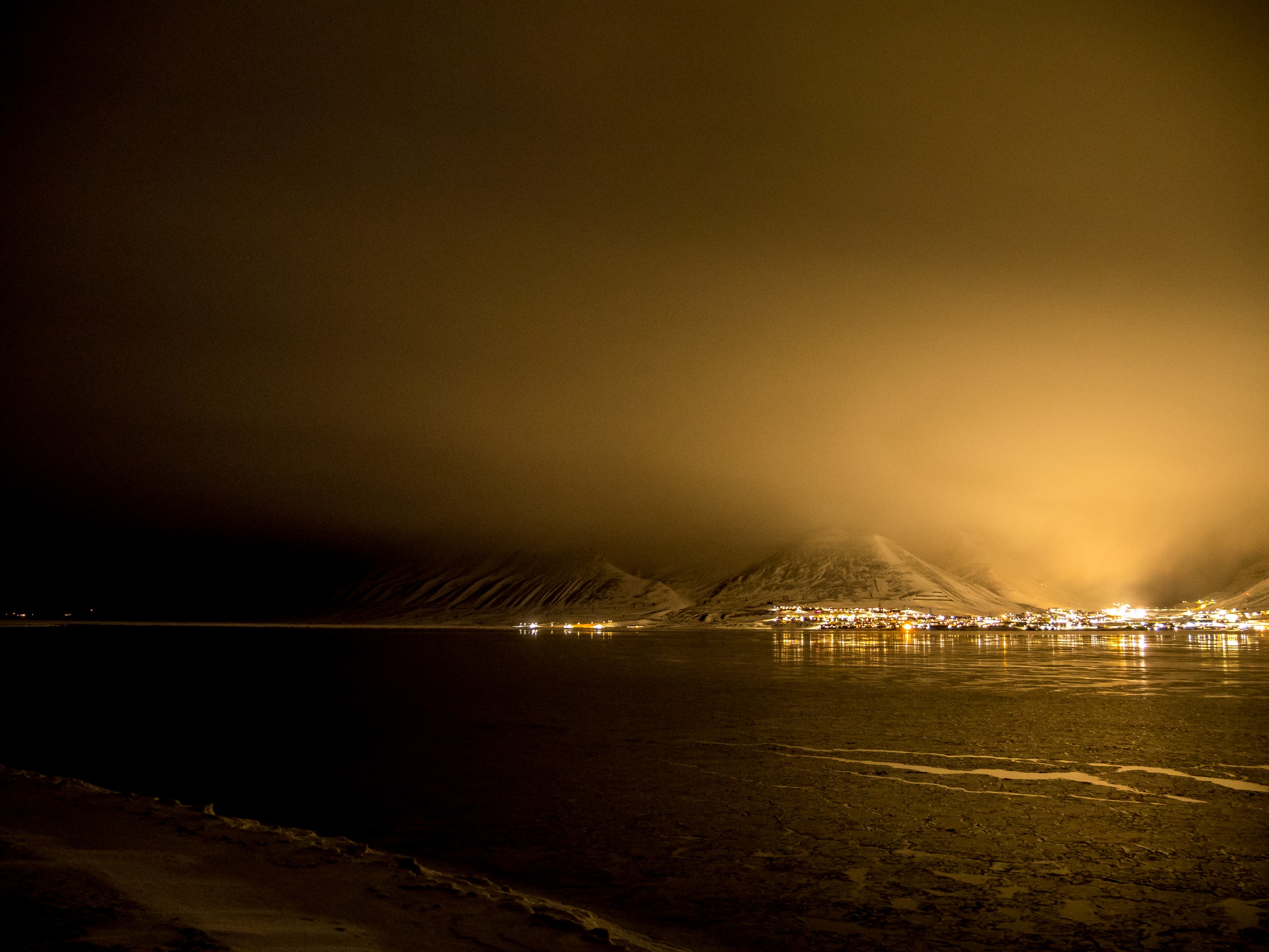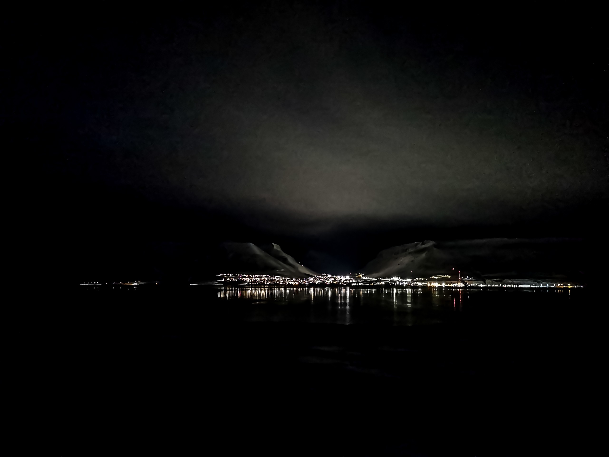 Un rappel efficace que sous ces latitudes arctiques, nos fragiles vies humaines sont en fait en danger. C’est à la fois effrayant et enivrant. Je regarde un peu autour de moi et vois un fantôme de montagne qui a presque l’air d’un mirage. Loin devant nous, les lumières de la route qui longent le fjord nous appellent mais dans le noir, difficile de se rendre compte des distances et j’ai beau marcher, les lumières ont beau avoir l’air proches même, nous continuons inlassablement d’avancer sans pouvoir sembler les rejoindre.