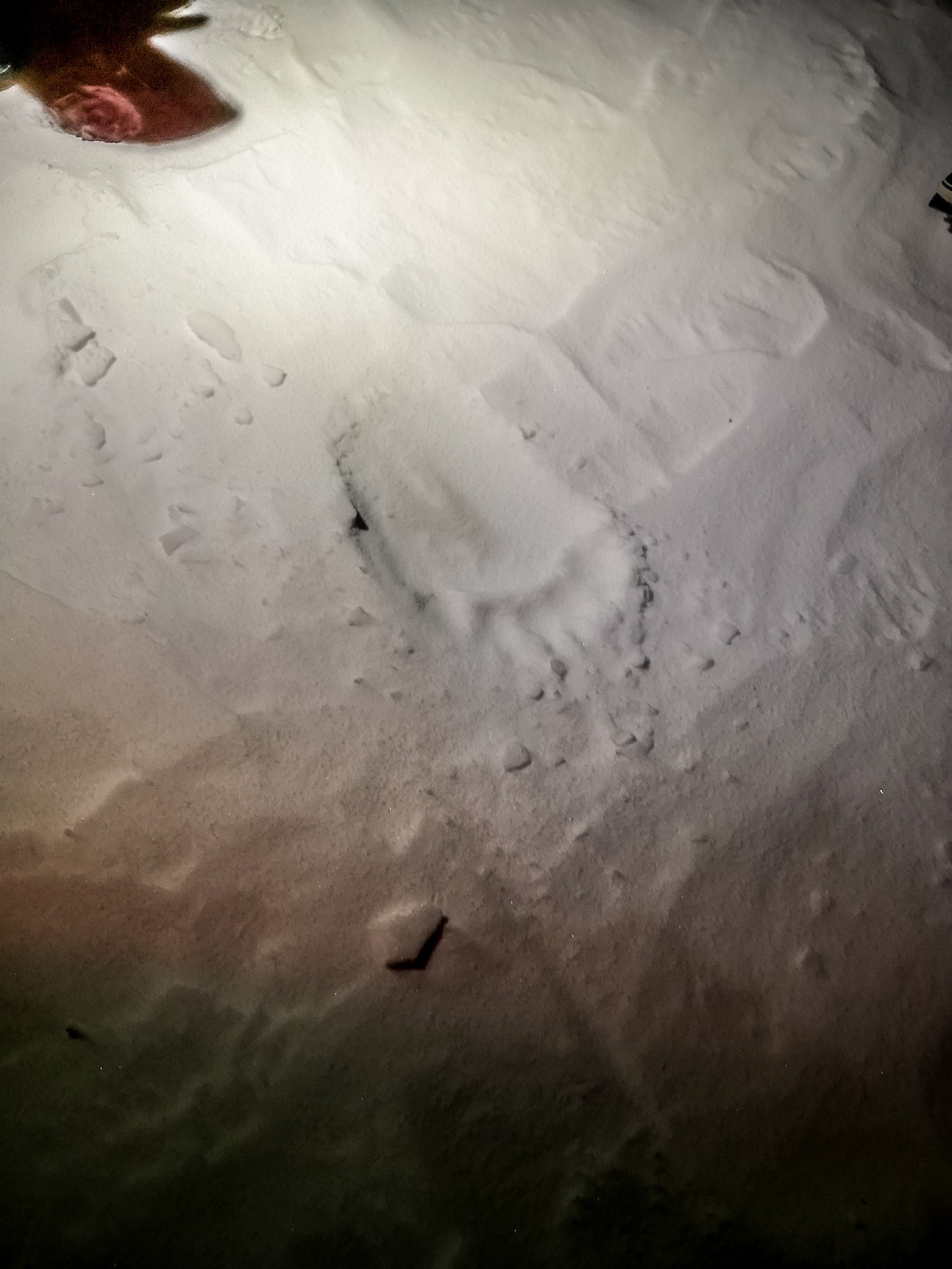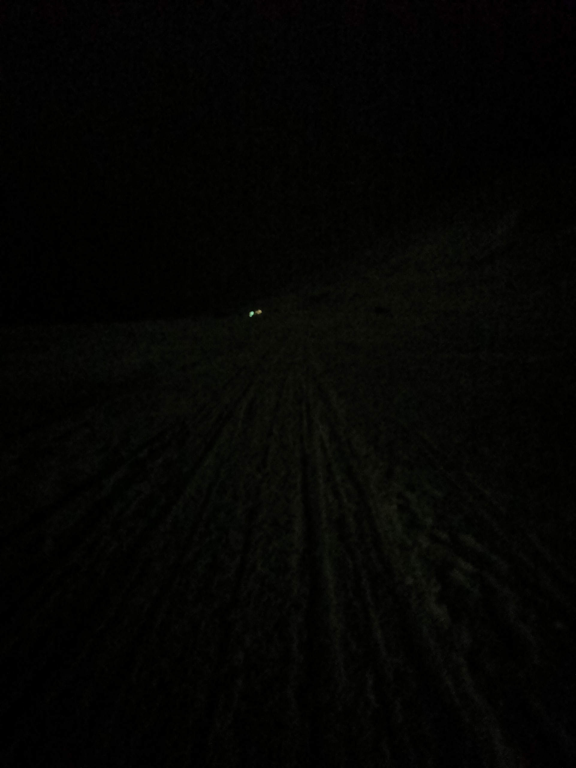 Et devinez qui traîne un peu la patte derrière ? Ma petite taille et ma condition physique plus que douteuse font que je me retrouve toujours très vite à l’arrière d’un groupe de marche. Après quelques minutes, me voilà entourée par la nuit et une brume neigeuse qui fait peu à peu disparaître tout le paysage autour de moi. De loin, je vois les lumières de mes congénères mais devant moi, ma lampe ne projette qu’un mince filet de lumière qui éclaire juste assez devant moi. Je tourne la tête à gauche et à droite sans cesse, histoire de m’assurer qu’il n’y a pas d’ours dans les parages mais j’ai l’impression que la nuit m’entoure de tout côté. C’est une sensation étrange, celle d’être une petite bulle de lumière et de chaleur dans un environnement qui ne voudrait pas de moi.