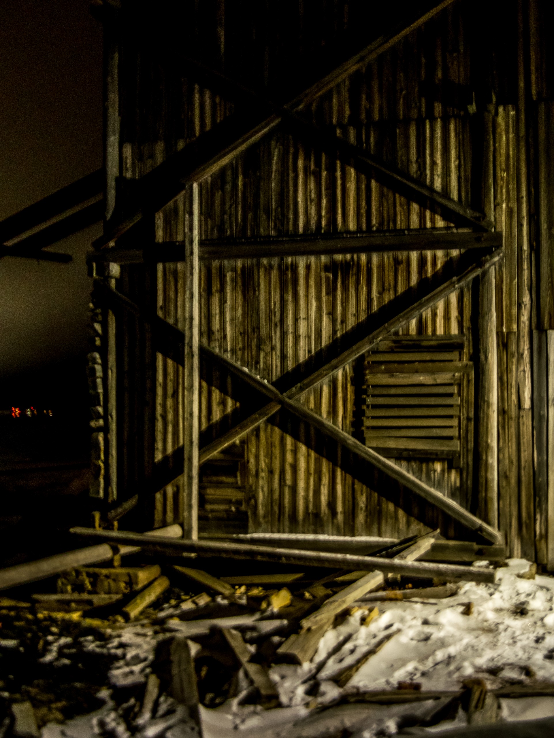 C’est quand même un peu sur nos gardes que nous continuons la randonnée quant à moi, je suis encore impressionnée de la taille de la patte de l’animal : elle est légèrement plus large que ma tête ! Je n’ose imaginer ce que se prendre une claque de nounours polaire peut donner, et je ne tiens pas à le savoir. Petit à petit, les lumières de Longyeabyen s’estompent, devenant de plus en plus faibles. Nous ne sommes qu’à quelques kilomètres de la ville mais j’ai l’impression d’être à des lieues du monde connu. Nous arrivons enfin en terrain accidenté, c’est là où une rivière qui se déverse dans le fjord et son courant est complètement gelé. Nous allons la traverser et quelques minutes plus tard, surgissant de la nuit, nous voilà devant une structure minière. Sans les lampes, ni les indications de Jan, je serai passée à côté.