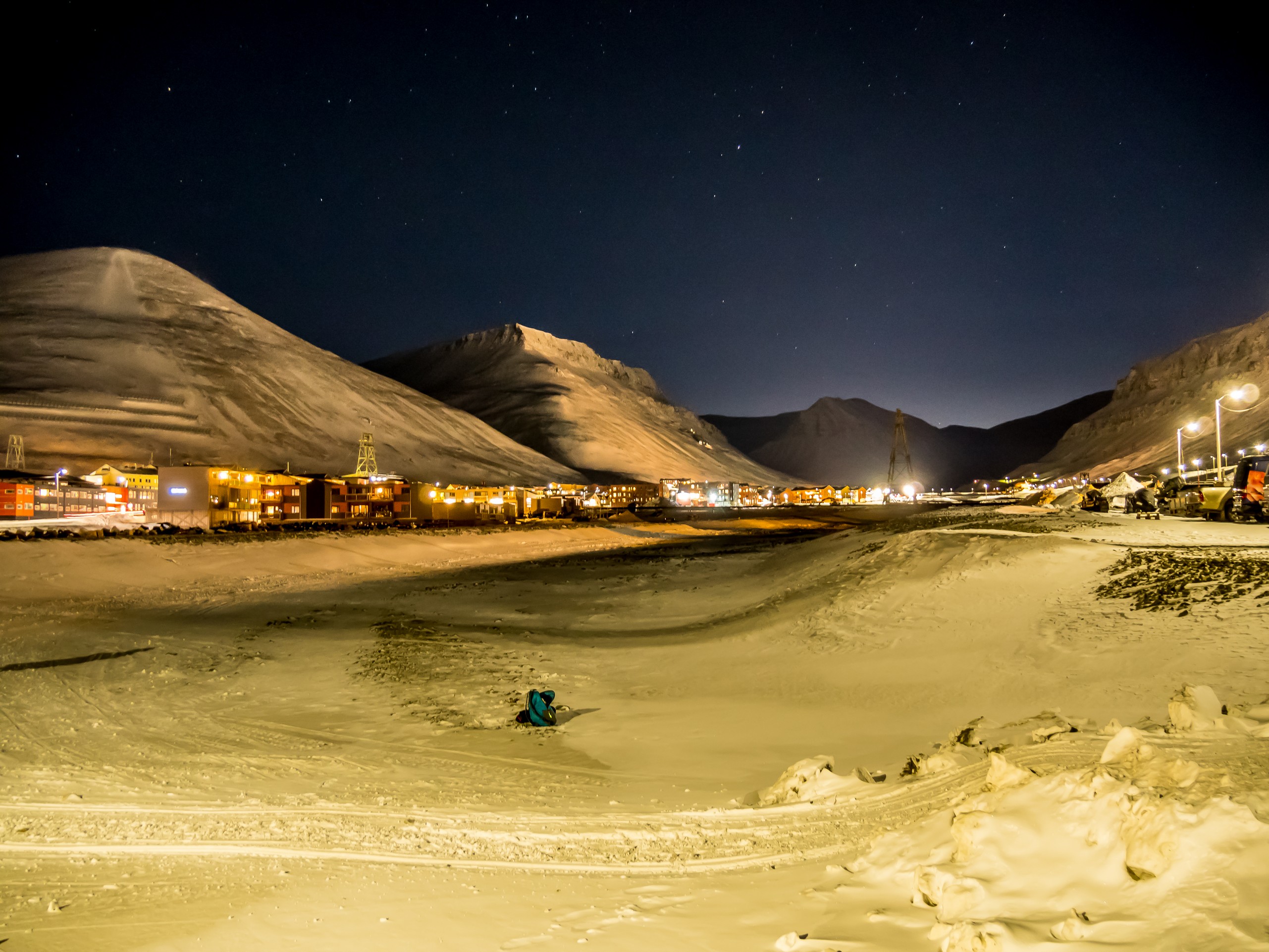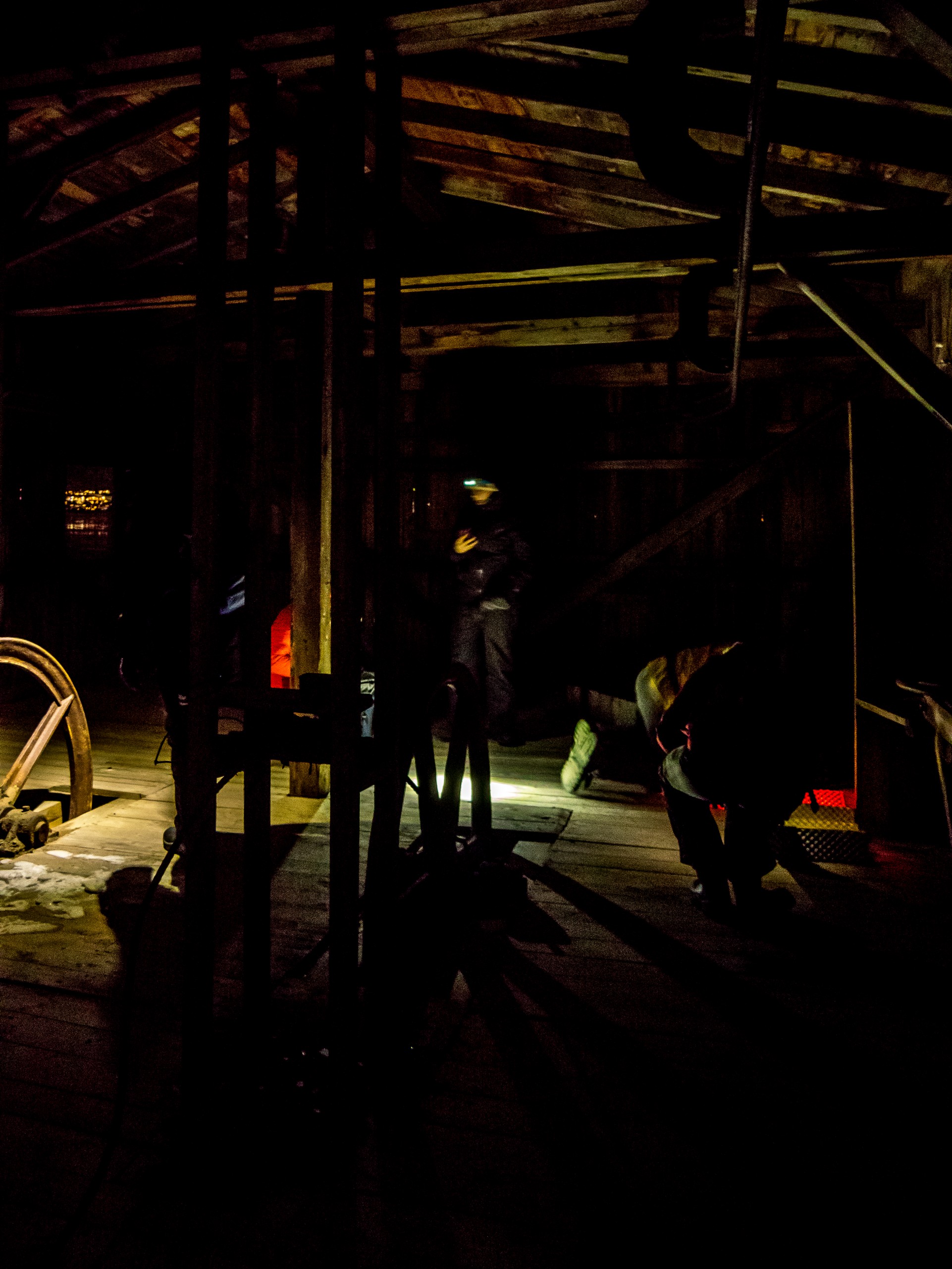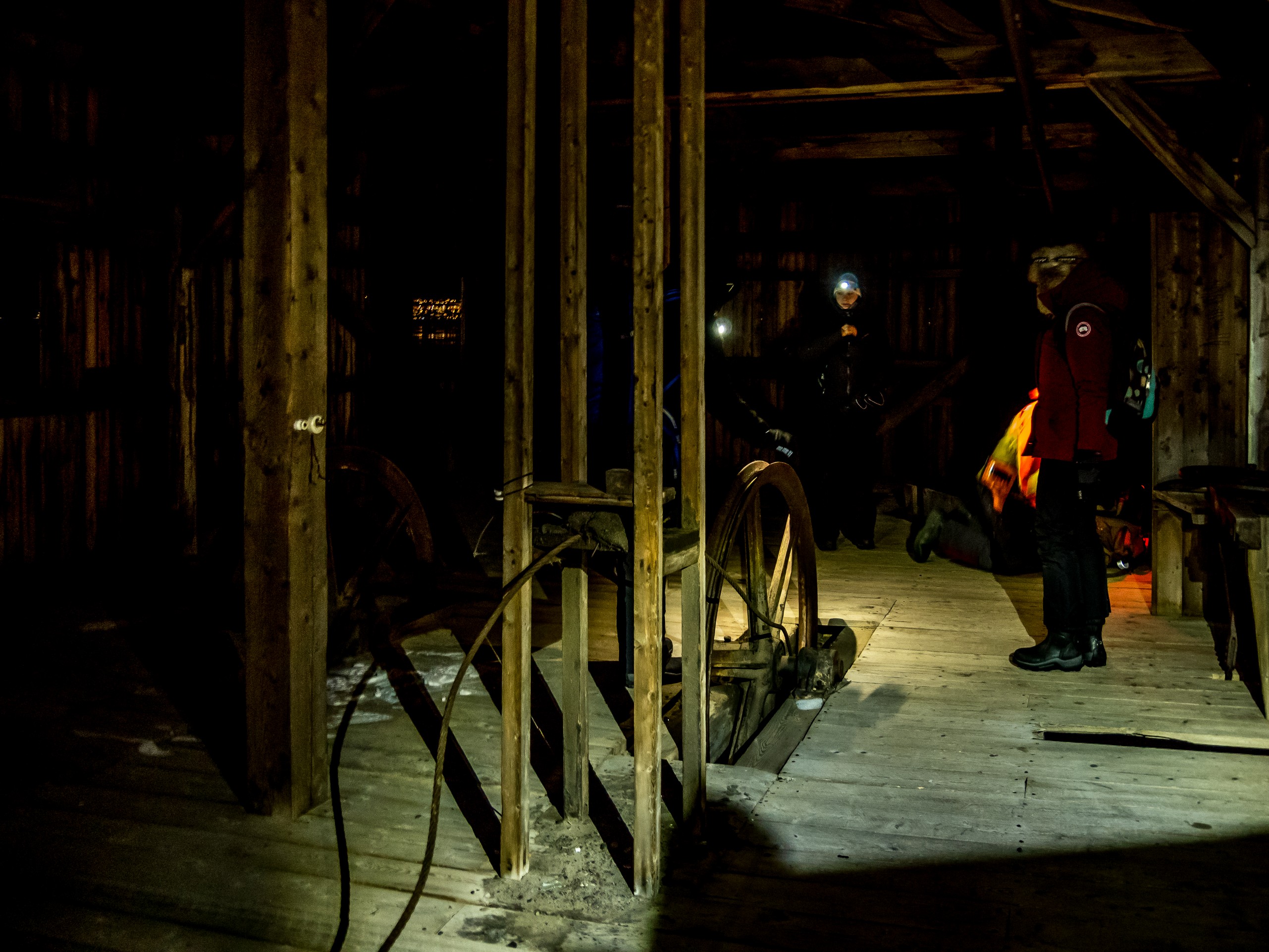 Comme d’habitude, nous passons au quartier général de l’agence pour s’équiper. C’est un peu plus facile que la veille : pas besoin de crampons ici, juste de lampes frontales et ceux qui n’ont pas de bottes qui conviennent peuvent en louer et nous réembarquons dans le van, en se dépêchant de quitter la ville. Notre point de départ une fois atteint, nous nous regroupons pour faire un dernier point. Jan, notre guide, va nous emmener de l’autre côté d’Aventfjord jusqu’aux installations minières de Hiorthamn, une exploitation minière qui est maintenant abandonnée. A part quelques lueurs de motoneige qui passent au loin, on ne voit rien, absolument rien. Sans la clarté des étoiles, le monde semble plus petit et plus sombre. Plus menaçant aussi mais nous nous mettons en route.