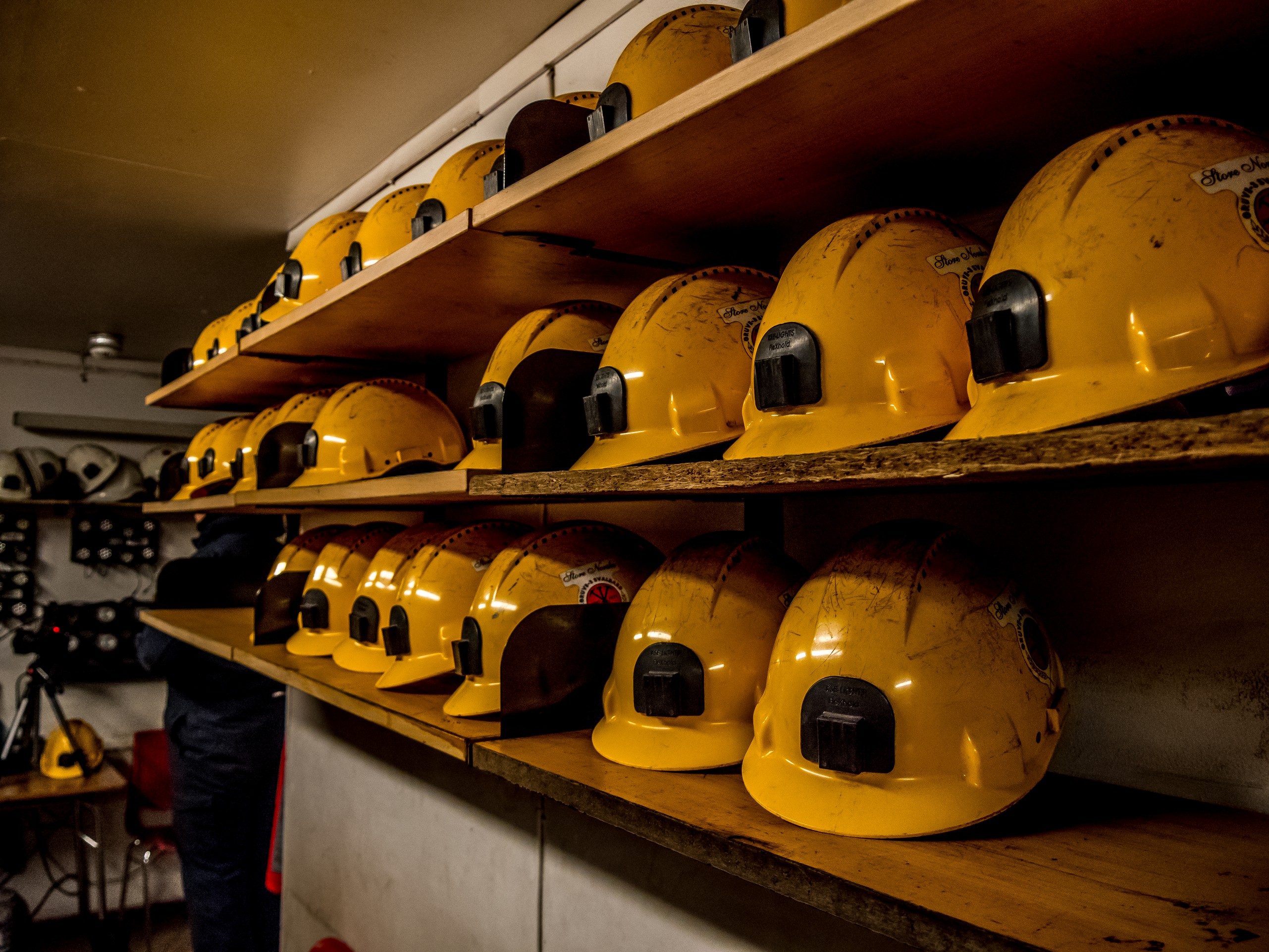 Mais pour le moment, il s’agit de s’équiper pour visiter la mine elle-même. Première chose à faire, se revêtir d’un « lompen », la combinaison des mineurs. On enfile un casque et une lampe et lentement, nous parcourant une série de salles où on trouve diverses machines (dont d’impressionnantes « tronçonneuses » qui tranchaient à travers la roche ou encore des wagons, souvent portant des noms de femmes, qui transportaient charbon ou personnes. C’est gigantesque !
