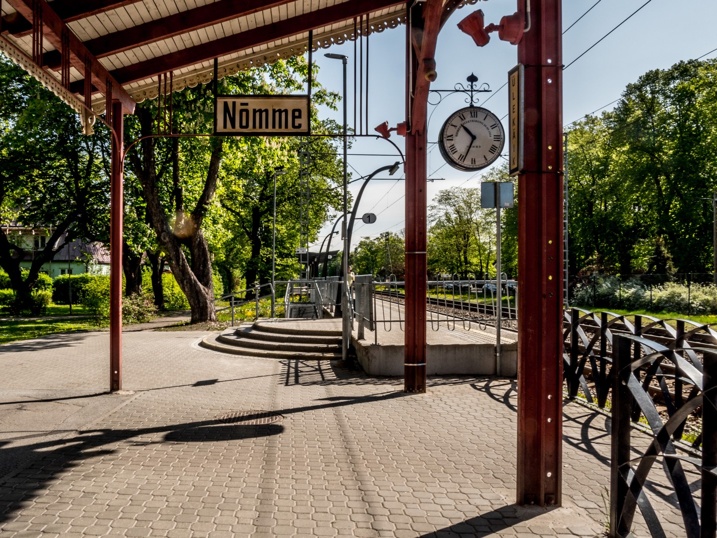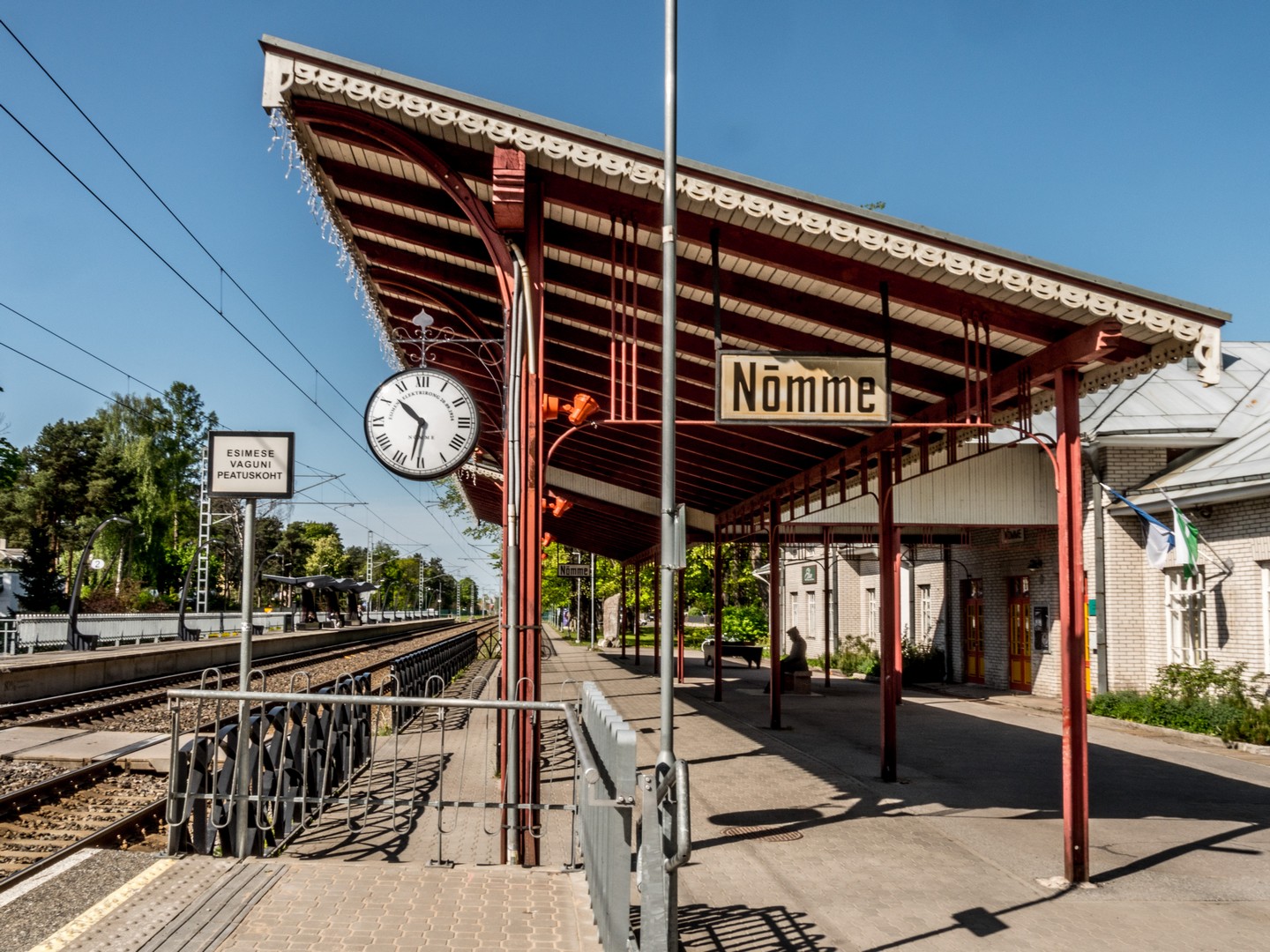 Là, nous allons nous aventurer loiiiiiiin du centre-ville de Tallinn, dans un quartier qui mérite qu’on lui consacre de l’attention : Nõmme (prononcez « Neumé »). Situé au sud de Tallinn, y arriver est une petite aventure en soi puisque la meilleure façon de faire connaissance avec le quartier, c’est d’y arriver en train. L’occasion pour les amoureux du rail de tester les chemins de fer estoniens. Vingt minutes plus tard, je débarque dans une petite gare qui a gardé son look d’antan. Avec son horloge, sa pancarte de signalement et les ferronneries de son auvent, c’est un des symboles du quartier.
