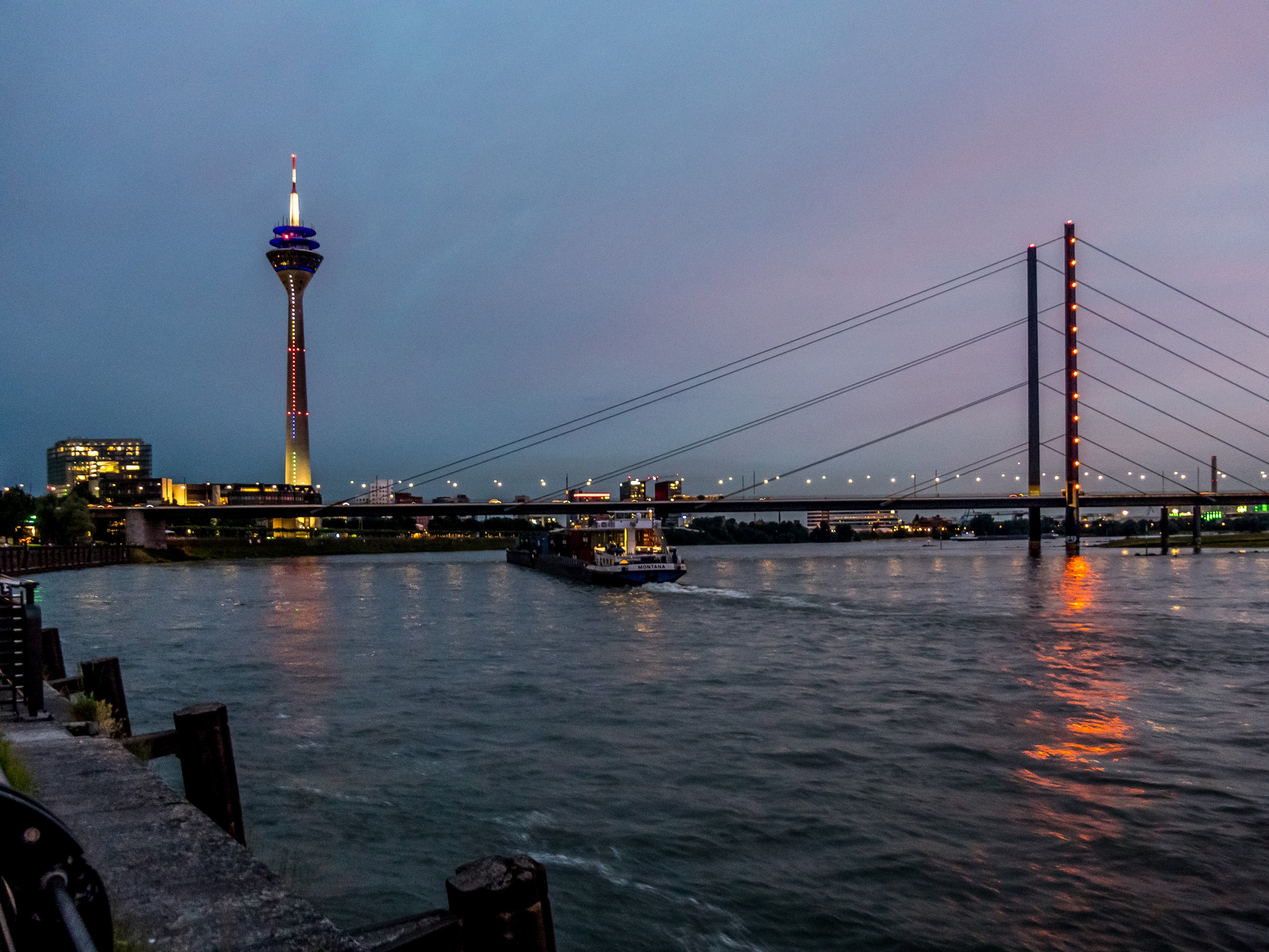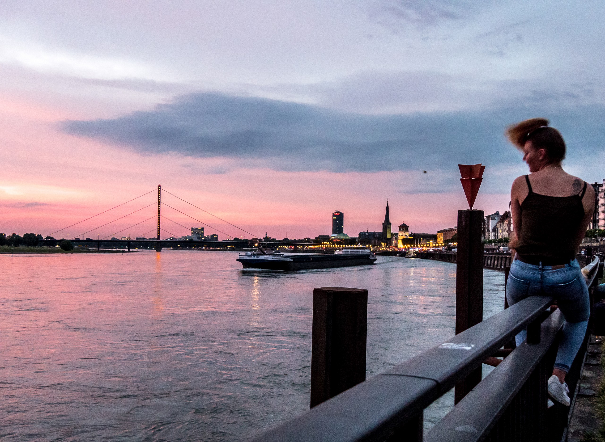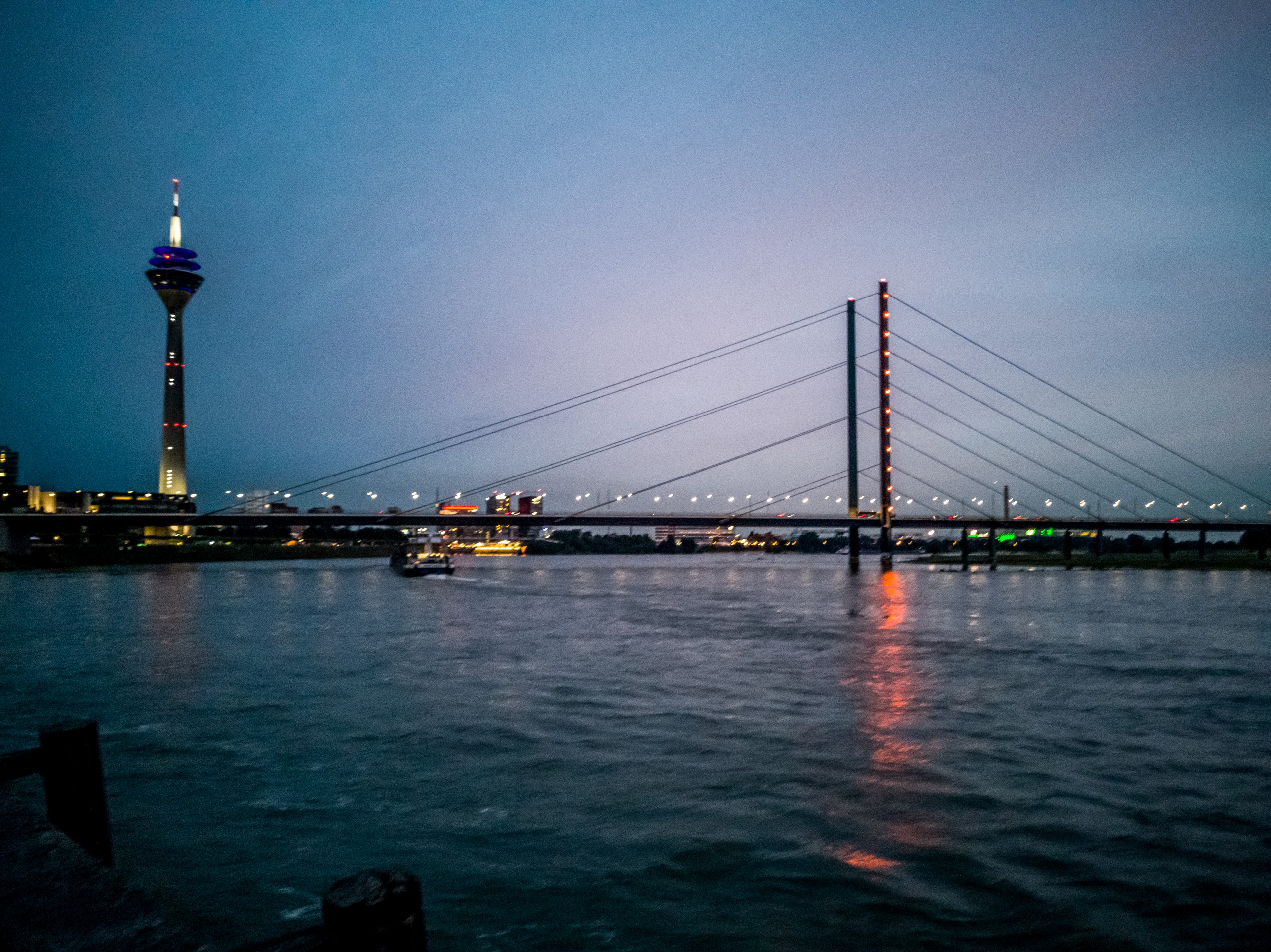 Il est déjà 21 heures quand j’arrive en ville. Venue avec OUIbus, nous avons pris du retard grâce aux embouteillages bruxellois et à un contrôle douanier à l’aéroport de Cologne-Bonn. J’ai juste le temps de déposer mes affaires à mon Air BnB avant de prendre la route. Comme tu le sais, Lectrice, Lecteur, j’avais décidé de partir sans smartphone. J’essaie juste de me diriger au mieux sans mon guide métal mais il faut que je me dépêche. Sur mon chemin, je tombe justement sur une ligne de tram ! Un rapide regard sur le nom des arrêts et une carte me signale que je suis pile dans la bonne direction. Quelques minutes plus tard, me voilà au pied de l’icône de la ville : la Rheinturm. Construite entre la fin des années 70 et le début des années 80, elle domine le panorama de la ville depuis lors. Elle sert à la fois d’antenne pour la télévision mais aussi… d’horloge. La nuit tombée, des lumières incrustées dans son mât indique l’heure. C’est d’ailleurs la plus grande horloge décimale au monde. Je ne vais d’ailleurs pas tarder à la voir en action : j’arrive justement sur les bords du fleuve à la fin de coucher de soleil.